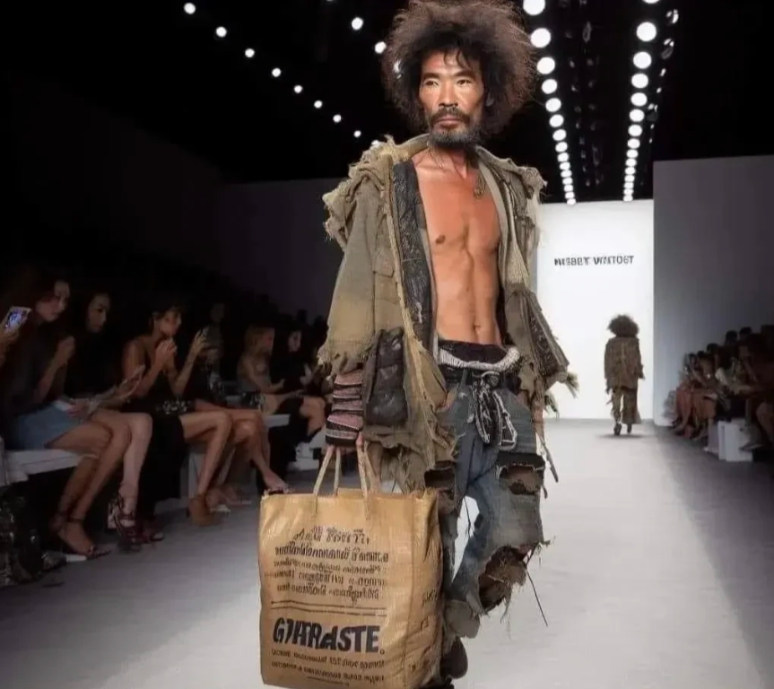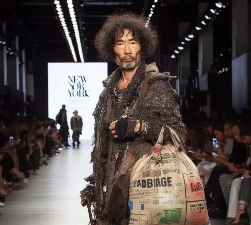 天啊,这种时尚我真看不懂。这是在宣传环保?还是鼓励人们去流浪?以前是嘻哈风,有披着塑料袋的,背着麻袋的。如今这背着垃圾,到底是啥意思啊?