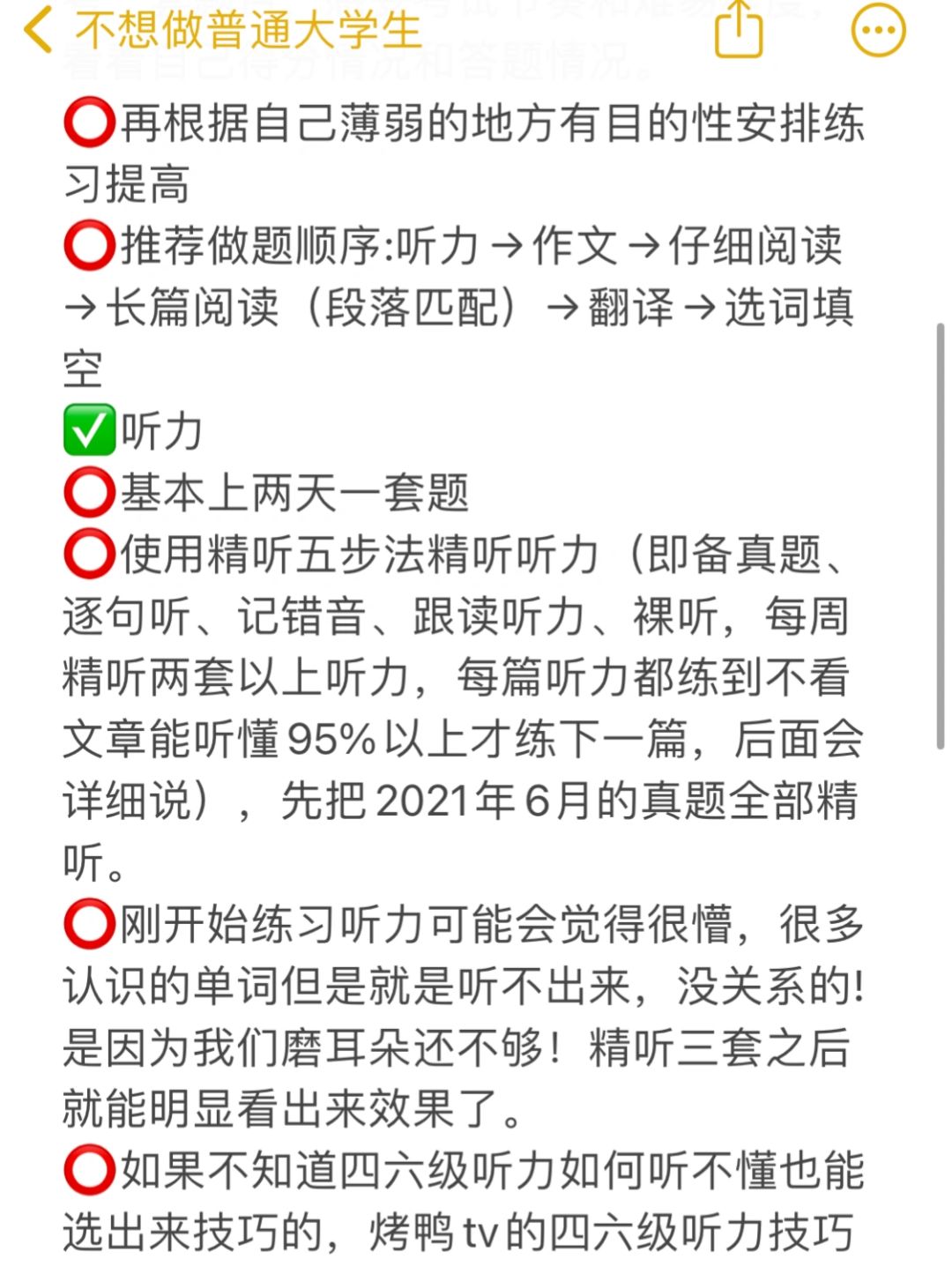 ⭕️使用精听五步法精听听力(即备真题、逐句听、记错音、跟读听力、裸听,每周精听两套以上听力,每篇听力都练到不看文章能听懂95%以上才练下一篇,后面会详细说),先把2021年6月的真题全部精听。