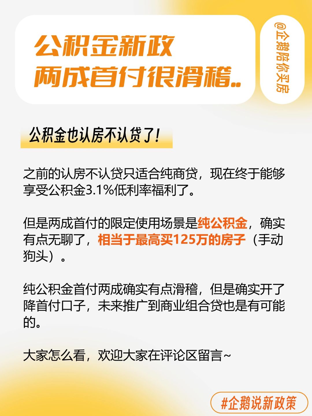 公积金也认房不认贷了! 之前的认房不认贷只适合纯商贷,现在终于能够享受公积金3.1%低利率福利了。 但是两成首付的限定使用场景是纯公积金,确实有点无聊了,相当于最高买125万的房子。 纯公积金首付两成确实有点滑稽,但是确实开了降首付口子,未来推广到商业组合贷也是有可能的。 大家怎么看,欢迎大家在评论区留言~~ 企鹅君写了一份《广州刚需买房说明书》,里面会更详细地给大家科普刚需如何从零到一买房,争取所有人都能看懂,大部分人能用得上,欢迎🐷叶阅读。