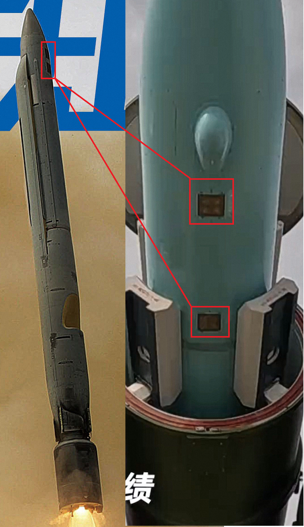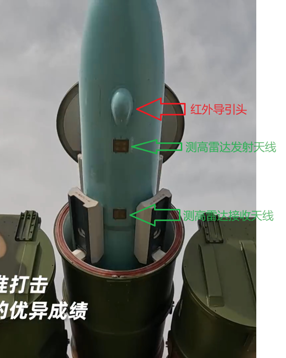 #涨姿势# 双模版的YJ62(S)来了[毕业帽],注意弹体上的文字:后缀S可能代表双模导引头,其实就是雷达头加了个红外导引头(红色箭头处),一开始YJ62只有雷达头。2个黑色小方块可能是测高雷达的发射与接收天线,YJ18也有[给你小心心]
