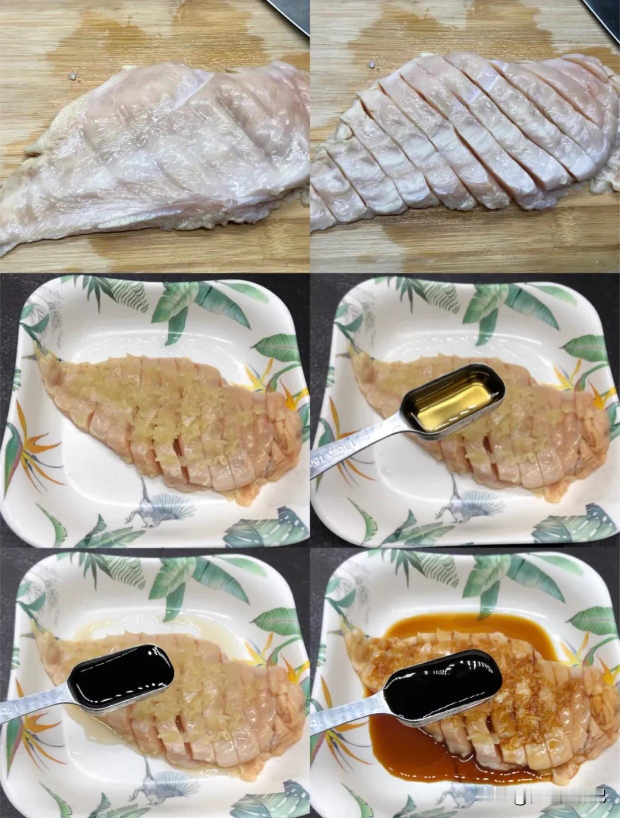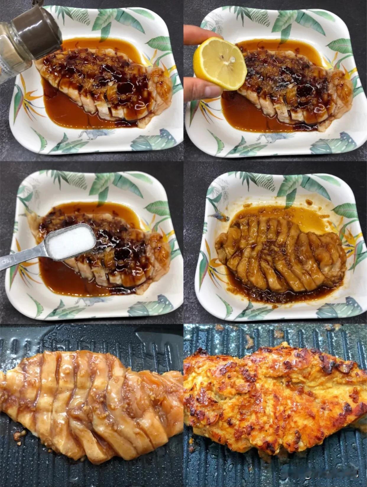 ㊙️秘制黑椒鸡胸肉,鲜嫩多汁好吃不怕胖 🌲减肥中的你又想吃肉还怕长肉,就吃鸡胸肉和鱼肉吧!吃多也不怕,晚餐我比较节制一下,尽量吃的清淡一些减少胃负担,所以西红柿和黄瓜,一些代餐食物就是我的晚餐。 ✅食材: 鸡胸肉1块,胡椒粉1克,料酒1勺,生抽1勺,蚝油1勺,盐1克,蒜4瓣,柠檬汁适量。 ✅做法: 1、鸡胸肉先用刀背敲打松散。然后划几条,容易熟,肉还不柴入味。 2、加料酒,生抽,蚝油,盐,柠檬汁,蒜末腌制20分钟 3、煎锅抹少许油,放入鸡胸肉,一面煎两分钟再翻面煎2分钟,然后再翻面盖住锅盖煎焖1分钟,翻面再煎焖1分钟就好了,做法简单又好吃,一定要新鲜没有冷冻过的鸡胸肉,肉质细嫩好吃,忽略我的从冰箱取出来的,不过也不柴很好吃。@微头条 @头条美食