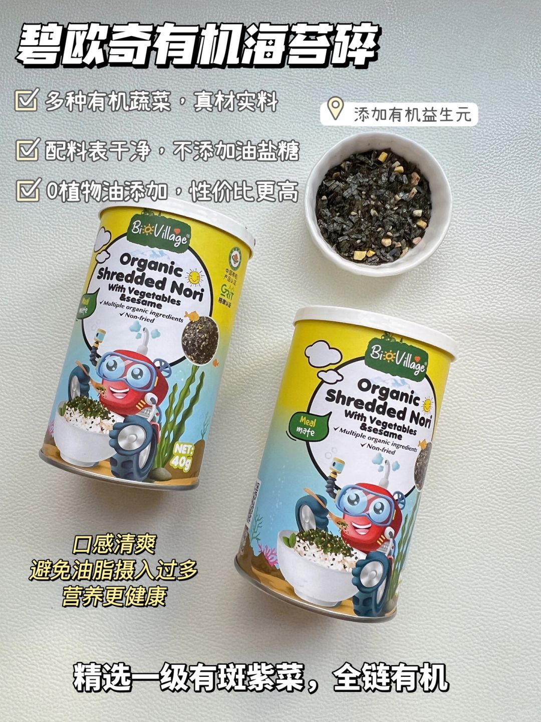🧚🏻♀️今天做海苔肉松小贝,用的是碧欧奇有机海苔碎,它添加了有机益生元,多种有机蔬菜,用的都是真材实料,配料表也非常干净,不添加任何植物油,盐和糖,口感清爽,避免宝宝油脂摄入过多,营养更健康,宝宝吃了肠胃没负担,精选一级有斑紫菜,全链有机,独立小包装,干净卫生,方便携带,拌饭,拌菜,做辅食来一点,太美味了~宝妈们可以放心选择哦~