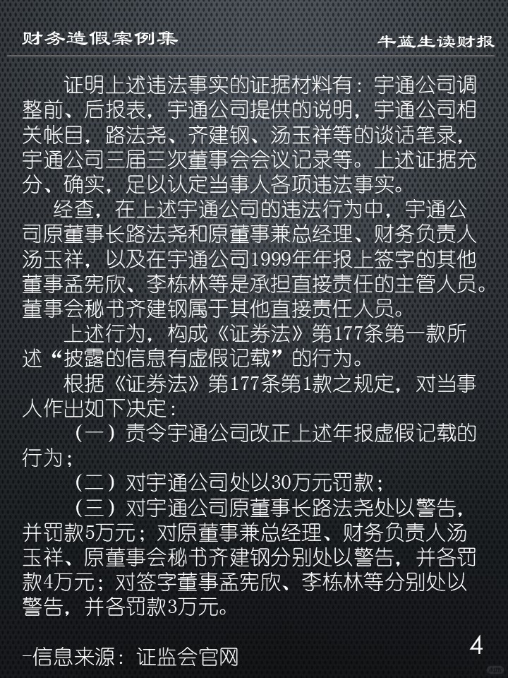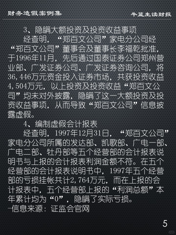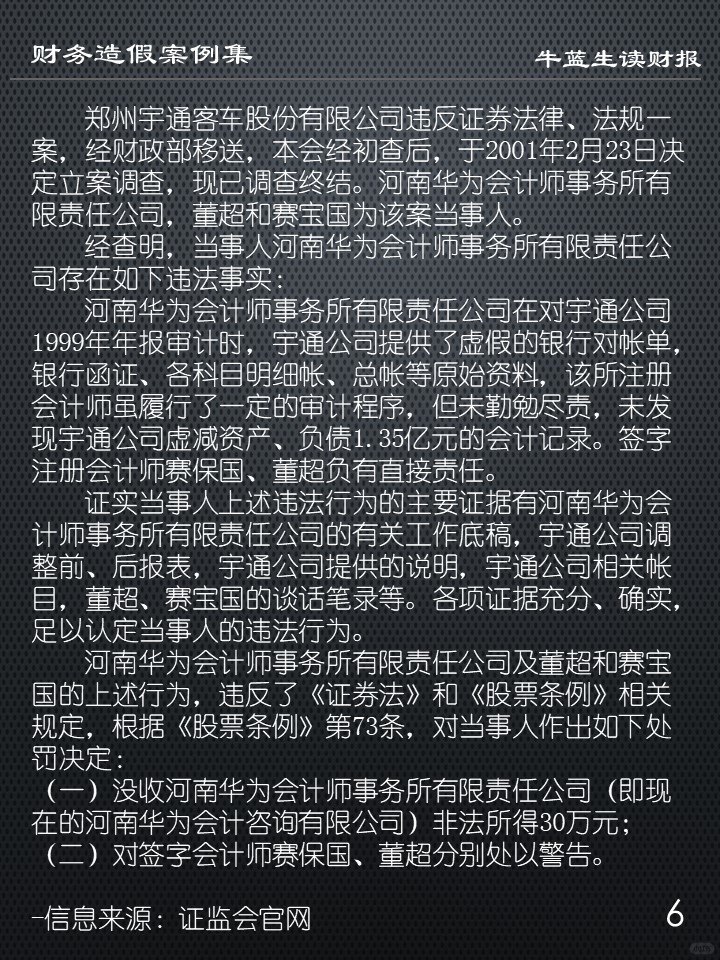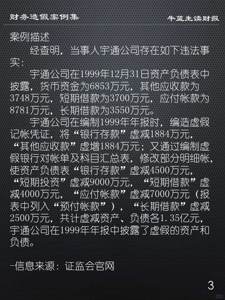 宇通公司在编制1999年年报时,编造虚假记帐凭证,将“银行存款”虚减1884万元,“其他应收款”虚增1884万元;又通过编制虚假银行对帐单及科目汇总表,修改部分明细帐,使资产负债表“银行存款”虚减4500万元,“短期投资”虚减9000万元,“短期借款”虚减4000万元,“应付帐款”虚减7000万元(报表中列入“预付帐款”),“长期借款”虚减2500万元,共计虚减资产、负债各1.35亿元,宇通公司在1999年年报中披露了虚假的资产和负债。