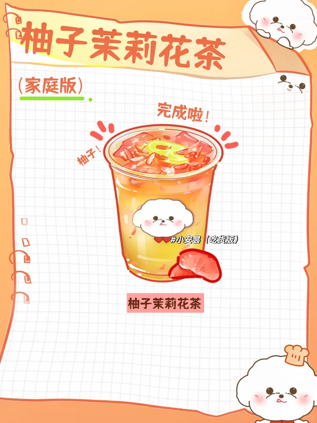 🔥柚子茉莉花茶(家庭版)🔥 柚子茉莉花茶,清新芳香的口感体验🍋🌸 口感非常清新,柚子的酸甜和茉莉花的芳香交织在一起~每一口都能感受到它们的完美融合! 🥣材料准备 红心柚子➕茉莉花茶➕15克糖 🥣制作步骤 1⃣️将红心蜜柚剥开!将柚子放进杯中,用力压出汁!加入茉莉花茶! 2⃣️加入糖浆,宝宝们根据自己喜好甜度增加或减少!搅拌均匀!完成啦! 每一片茶叶都充满了天然的香气🍃 入口后回味无穷💗 总而言之,柚子茉莉花茶值得大家一试!