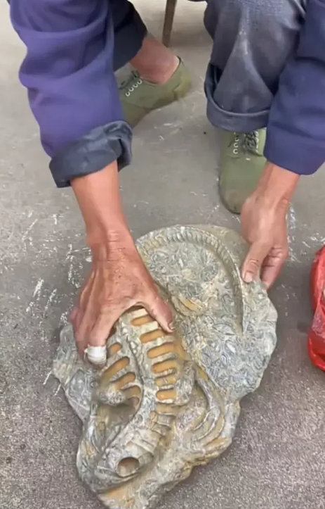在菜市场门口,一位老人在摆卖一块石头,老人说这块是恐龙化石,开价2000元,不讲价。