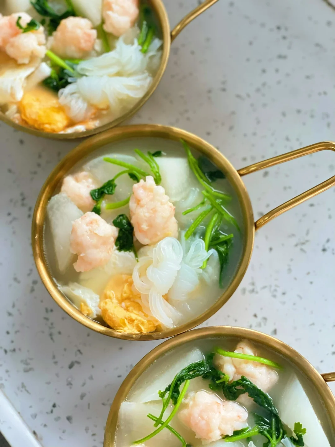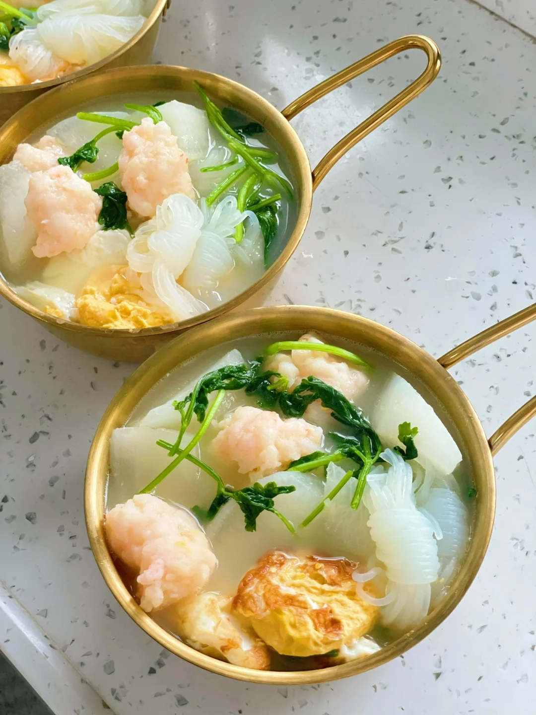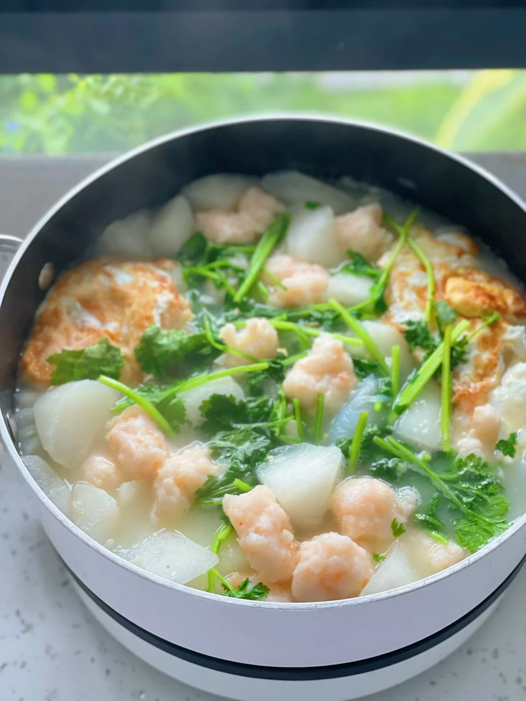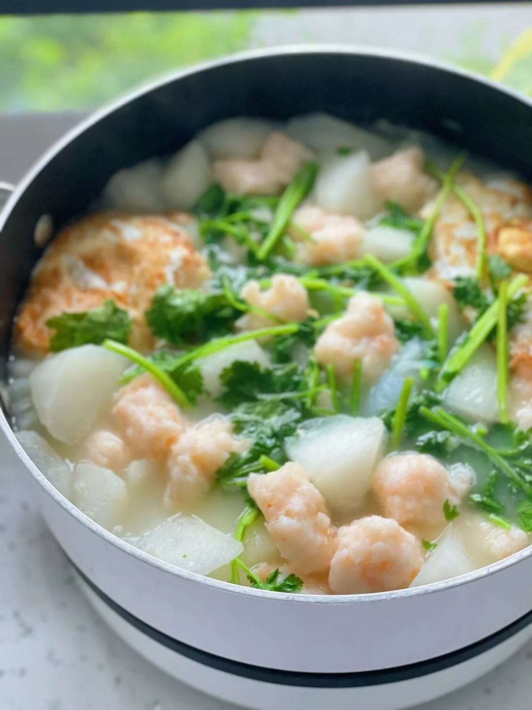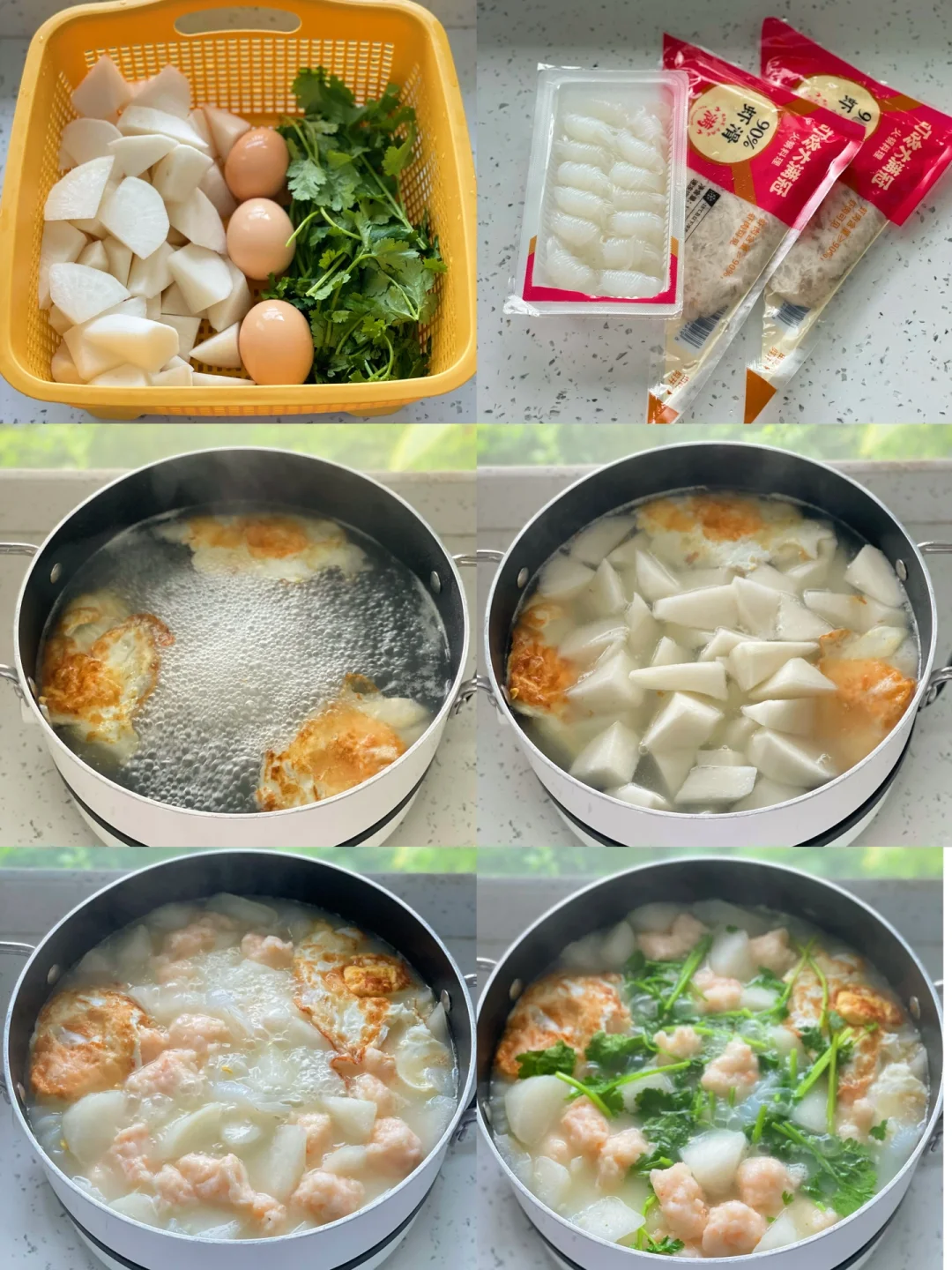 热气腾腾的三餐 🌟萝卜虾滑汤 白萝卜|虾滑|鸡蛋|香菜|魔芋结|盐 1️⃣锅里放少量油把鸡蛋煎至两面金黄 2️⃣煎熟鸡蛋后,在锅中放入2碗清水煮开 3️⃣下入白萝卜,大火煮开。中火煮10分钟。萝卜煮软,汤变奶白 4️⃣加入魔芋结,挤入虾滑煮熟 5️⃣加盐调味,最后下入香菜即可 ❤️不喜欢吃香菜可以用葱替代,或者加一点白胡椒粉增加汤的层次口感 ❤️除了盐,不需要放任何的调料。有白萝卜的加持汤喝起来特别的鲜甜 ❤️妥妥的减脂期最爱,蛋白质、蔬菜、一锅端,还加了顶腹的魔芋结。一碗下去真的大满足
