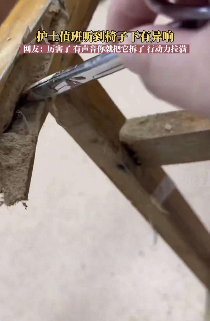 广西。一位女护士值班时听到桌子底下有异响,仔细观察后,发现声音是从椅子里传来的,于是立马找出剪刀,胆战心惊地将椅子拆开,发现里面有白色的虫子正在啃木头。网友则是调侃:这护士上辈子是啄木鸟吧!