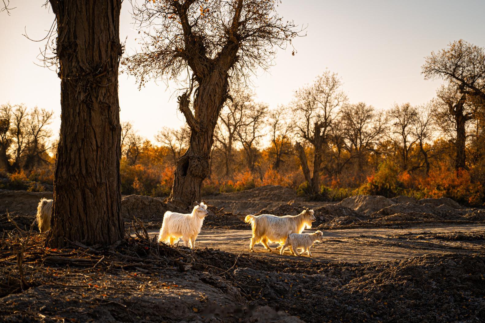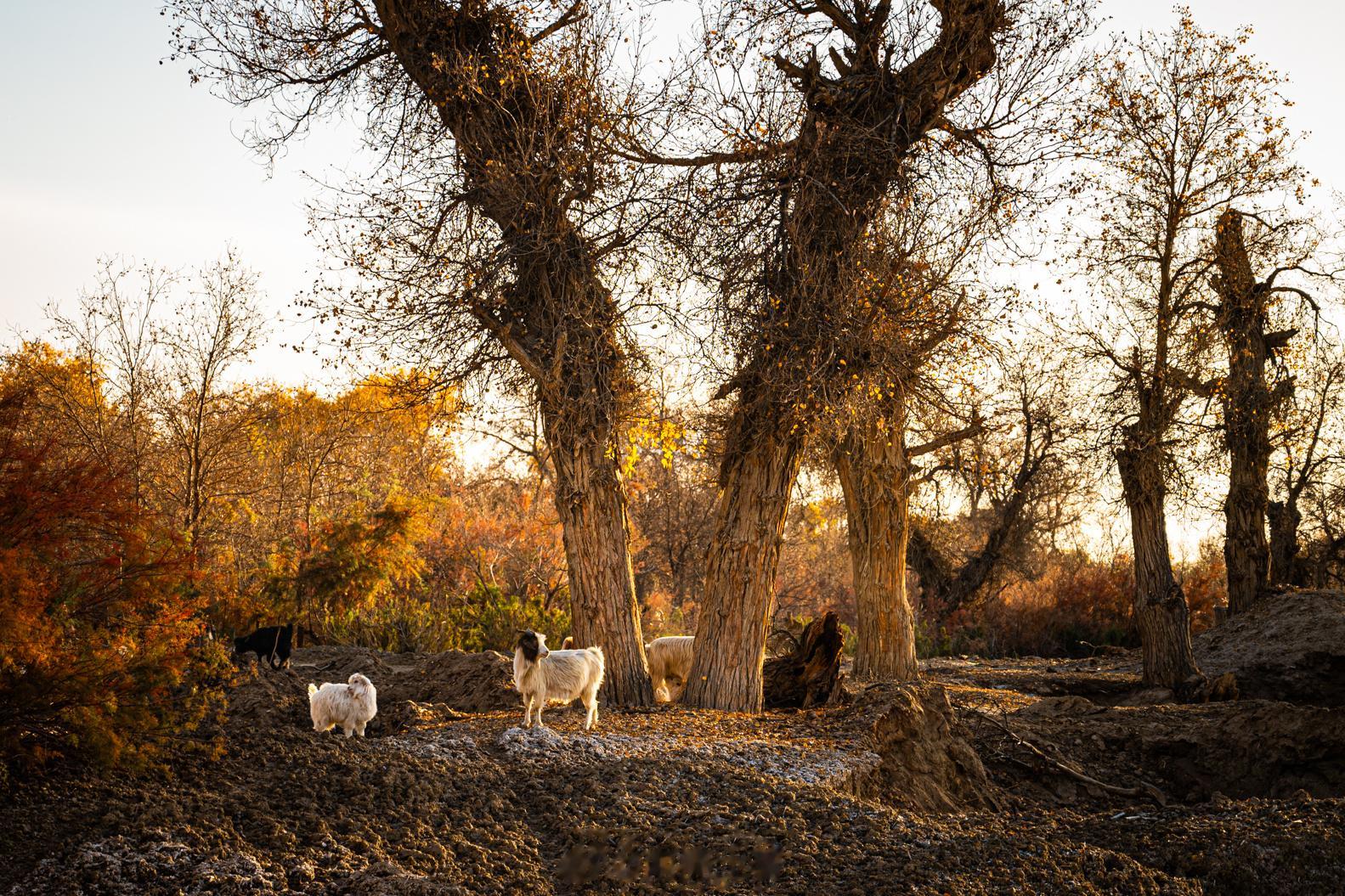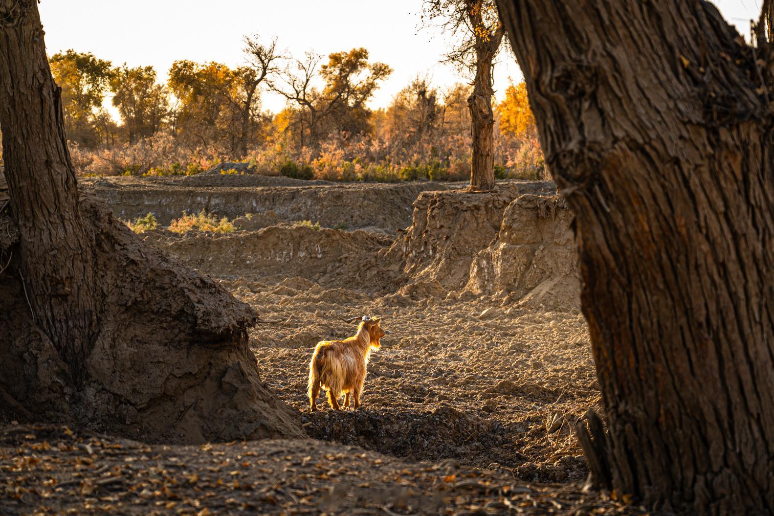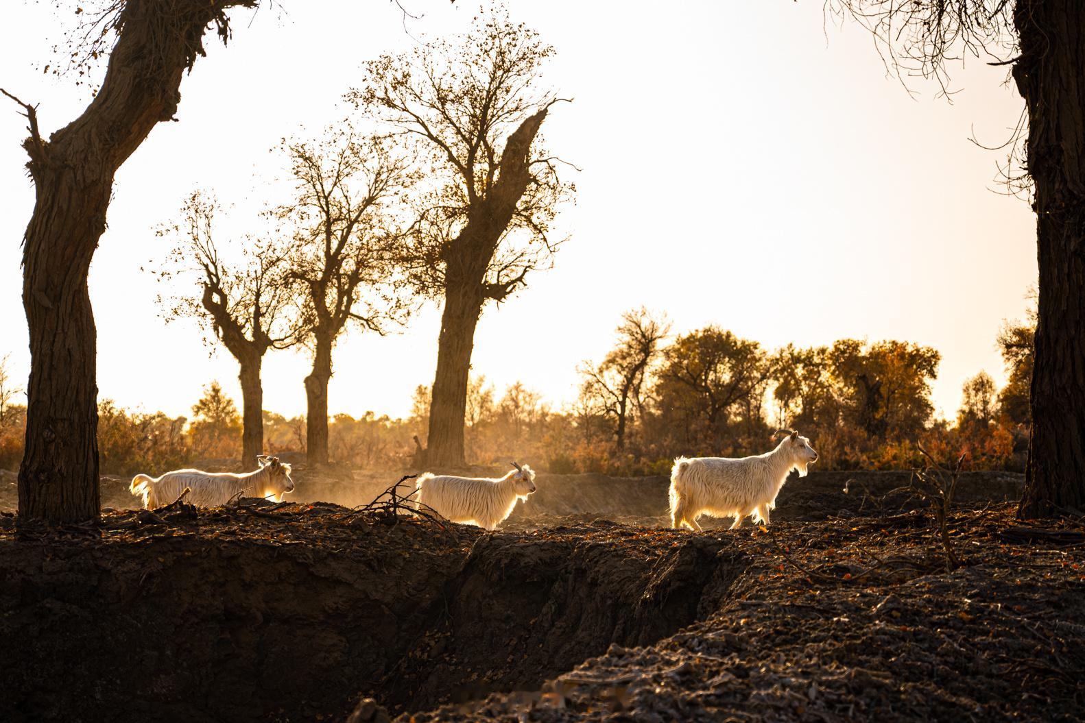 在巴州胡杨林中穿行,遇见悠闲的小羊,或许塔克拉玛干盆地边缘,不用像北疆或是天山牧场一样,不同的季节,都要大规模的转场劳顿。