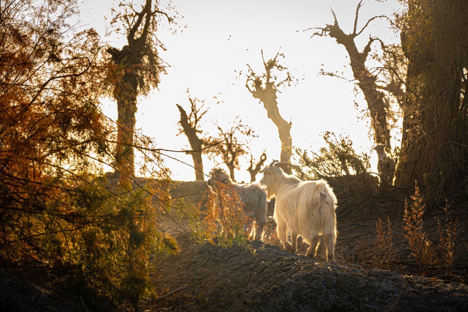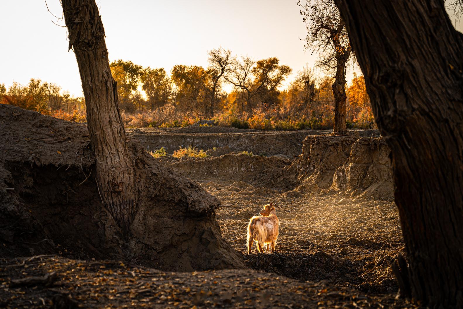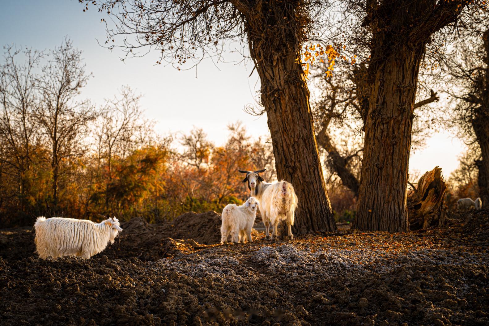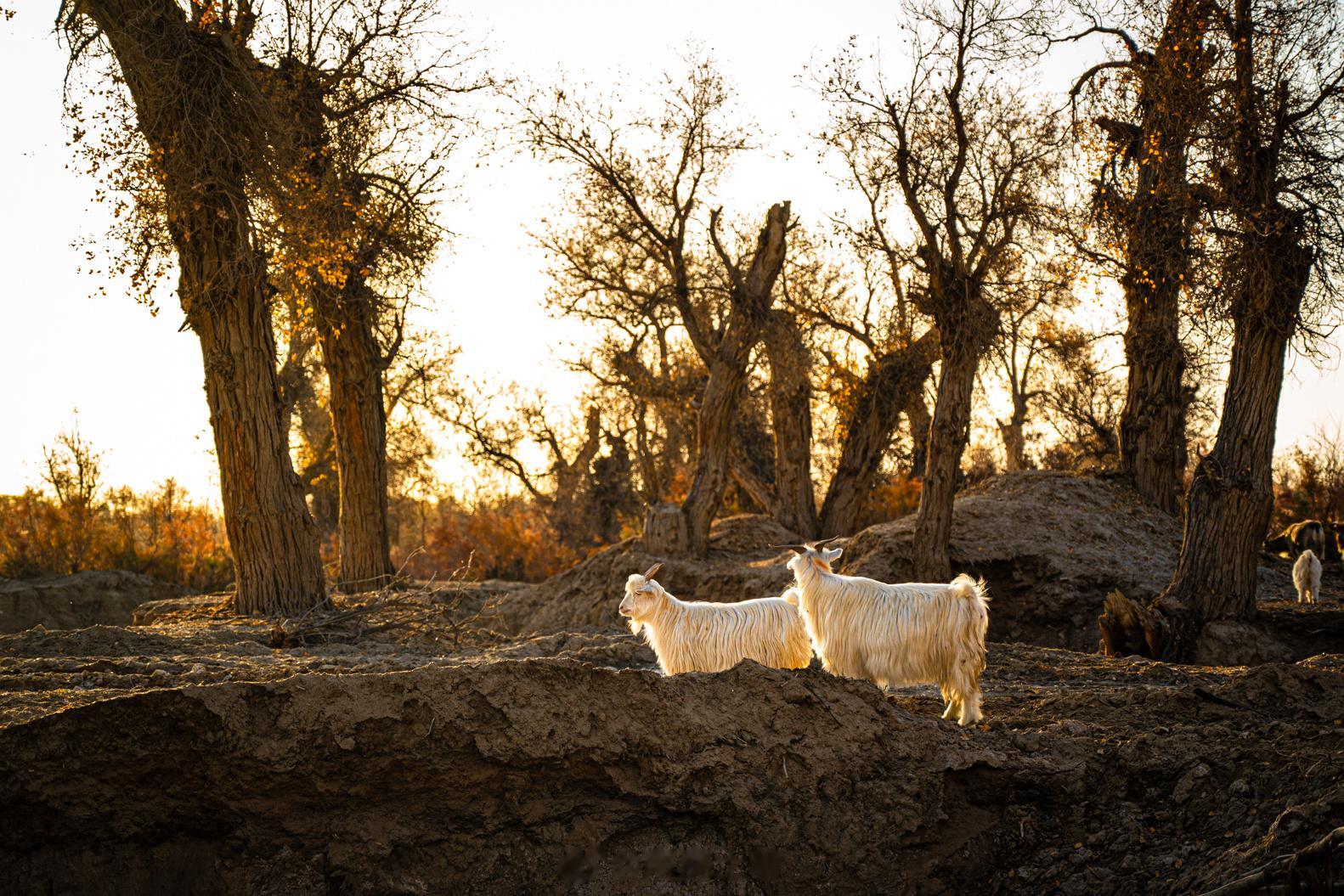 在巴州胡杨林中穿行,遇见悠闲的小羊,或许塔克拉玛干盆地边缘,不用像北疆或是天山牧场一样,不同的季节,都要大规模的转场劳顿。