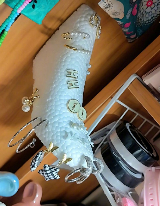 买手机壳里面都会有个泡沫撑着手机壳,那个东西随便贴哪都可以用来扎耳饰,并且美观