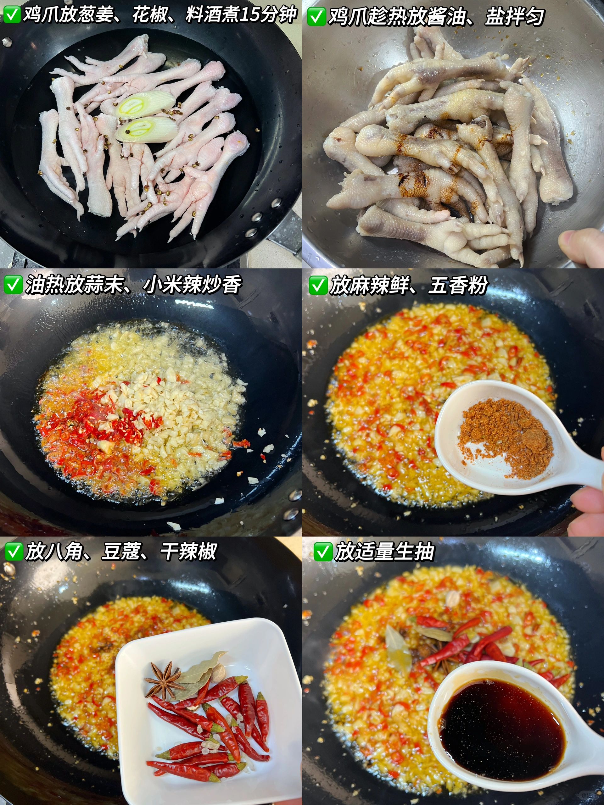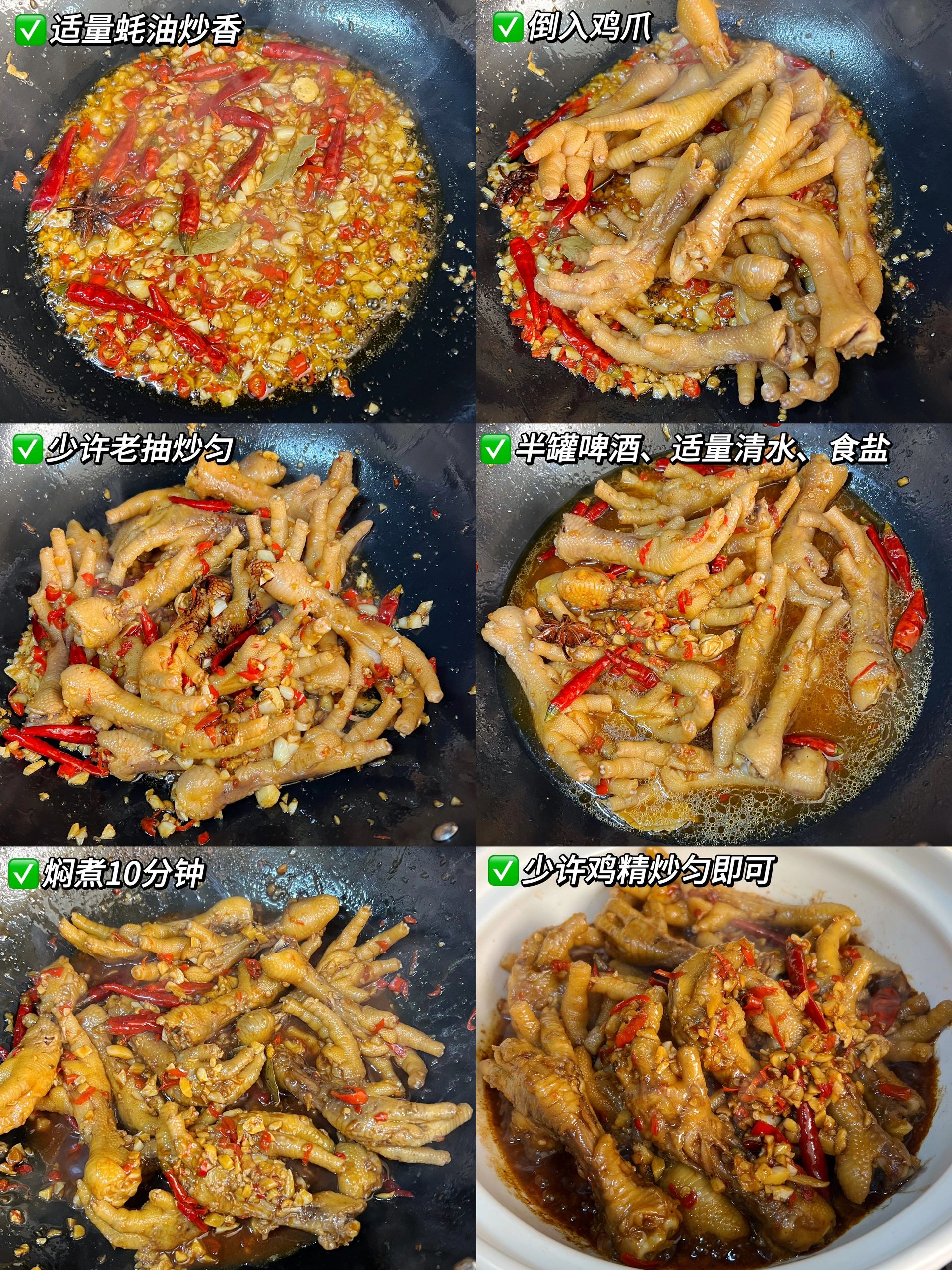 这个做法的鸡爪比夜市上的好吃很多,闺蜜每次来家里吃饭的必点菜,喜欢吃鸡爪的姐妹一定要试下[偷笑R][偷笑R] 🍀食材:鸡爪、葱姜蒜、小米辣、八角、花椒、豆蔻、香叶; 👇做法: 1、鸡爪冷水下锅,放葱姜、花椒、料酒煮20分钟,中间打下浮末,捞出趁热放盐、酱油拌匀腌制10分钟; 2、油热放大量蒜末、小米辣末炒香,放适量生抽、蚝油、麻辣鲜、五香粉炒香,放八角香叶、豆蔻、干辣椒炒出香味,再倒入鸡爪炒匀,放半罐啤酒、适量清水,焖煮10分钟,放适量鸡精炒匀即可;