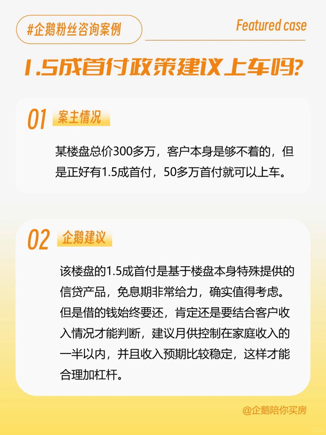 ②企鹅建议:该楼盘的1.5成首付是基于楼盘本身特殊提供的信贷产品,免息期非常给力,确实值得考虑。但是借的钱始终要还,肯定还是要结合客户收入情况才能判断,建议月供控制在家庭收入的一半以内,并且收入预期比较稳定,这样才能合理加杠杆。