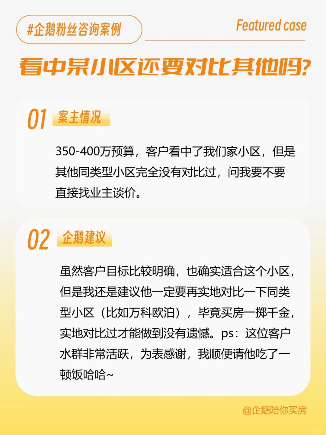 ①案主背景:350-400万预算,客户看中了我们家小区,但是其他同类型小区完全没有对比过,问我要不要直接找业主谈价。