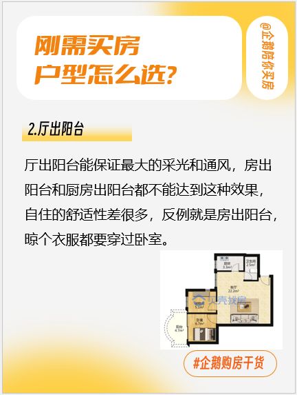 2.厅出阳台厅出阳台能保证最大的采光和通风,房出阳台和厨房出阳台都不能达到这种效果,自住的舒适性差很多,反例就是房出阳台,晾个衣服都要穿过卧室。