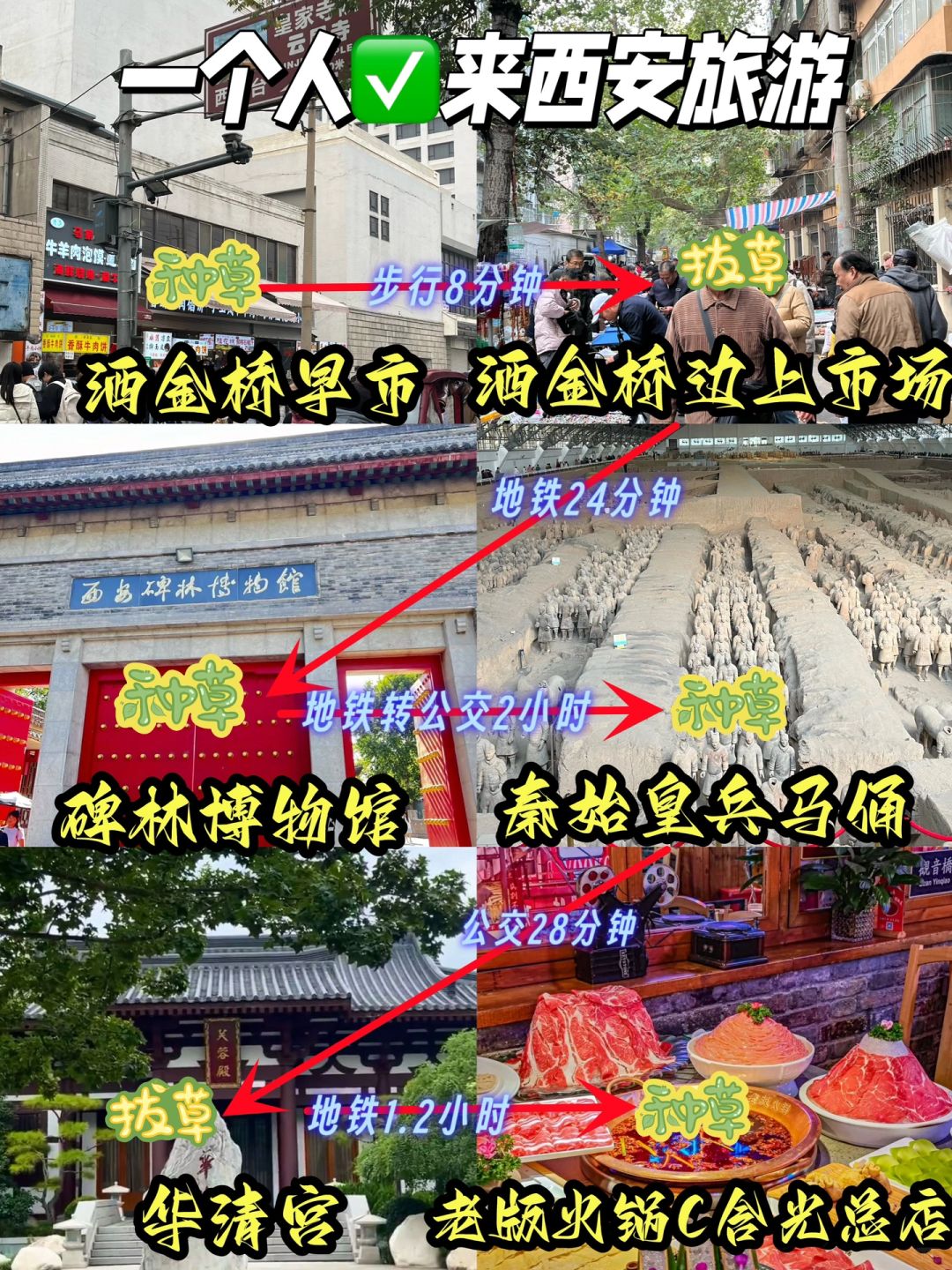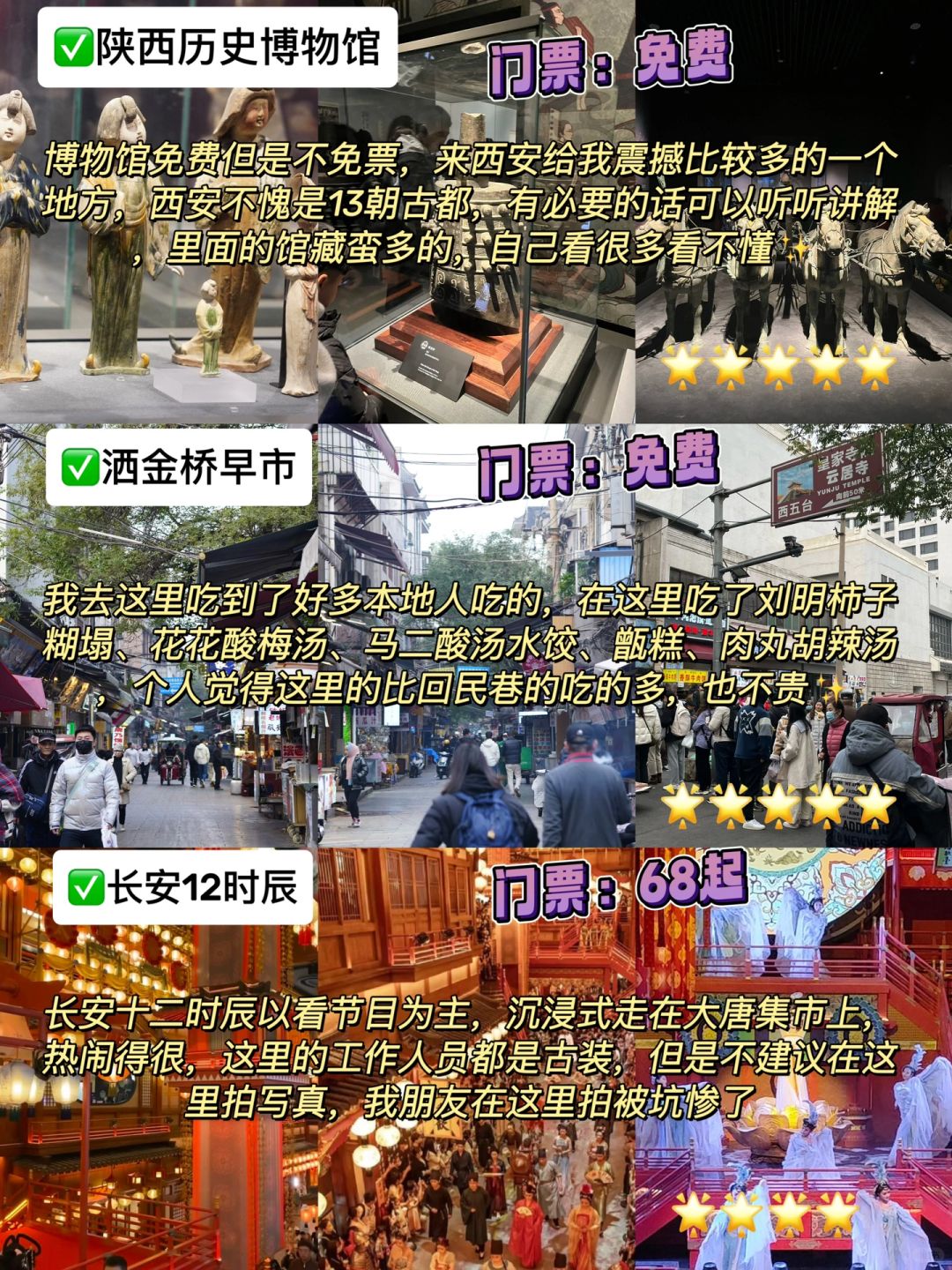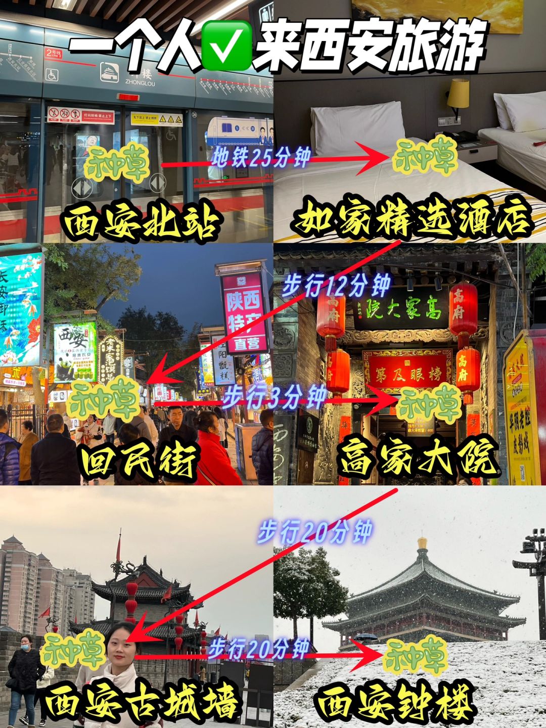 🚄车站选择: ❤️重庆西站-西安北站:车程5小时左右 ✔️到了北站直接坐地铁去钟楼附近的住宿,约半小时左右,我们选择📍如家精选钟楼店 · 最近西安逐渐变冷,建议大家穿羽绒服,晚上吹风很冷的~ · ✅西安自由行 Day1⃣️:西安北站—酒店放行李—回民街—高家大院—钟楼—古城墙 Day2⃣️:洒金桥—碑林博物馆—秦始皇陵兵马俑—华清宫—老版火锅(含光总店) Day3⃣️:陕西历史博物馆—赛格购物中心—大雁塔—大唐芙蓉园—外婆印象(大唐不夜城店)—大唐不夜城 ·