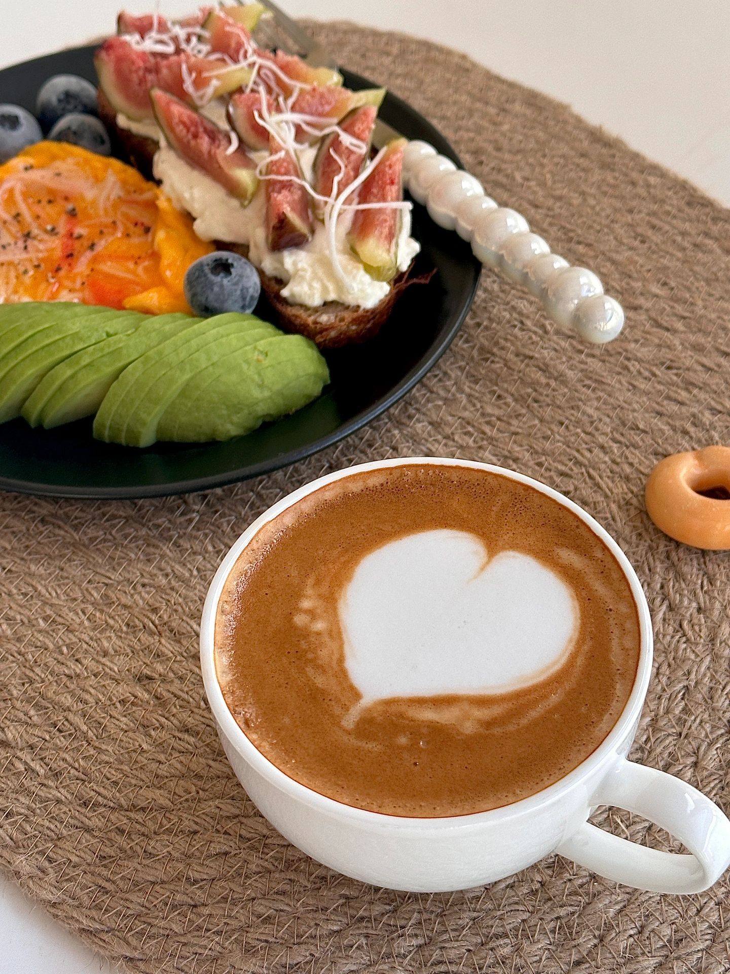 今日份元气满满早餐🥣 🥪抹上酸奶油的欧包上面摆满无花果,再撒上椰丝装饰 🥚蟹柳划蛋 🥑半个牛油果切片 🫐蓝莓 ☕️每日练习一杯拉花拿铁(今日勉强有个💗) 一起来get同款早餐吧!