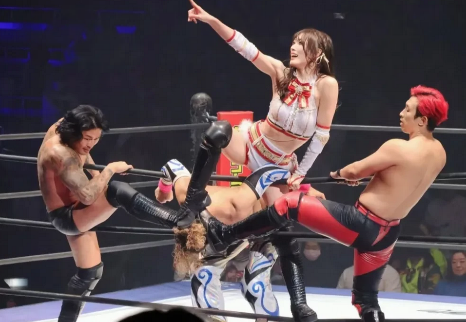 日本跨性别摔角,就是现场的动作片,都是彩排过的表演。赤井沙希在当摔角手(现已引退)之余也做过平面模特 赤井沙希和摸头安慰的师傅坂口征夫
