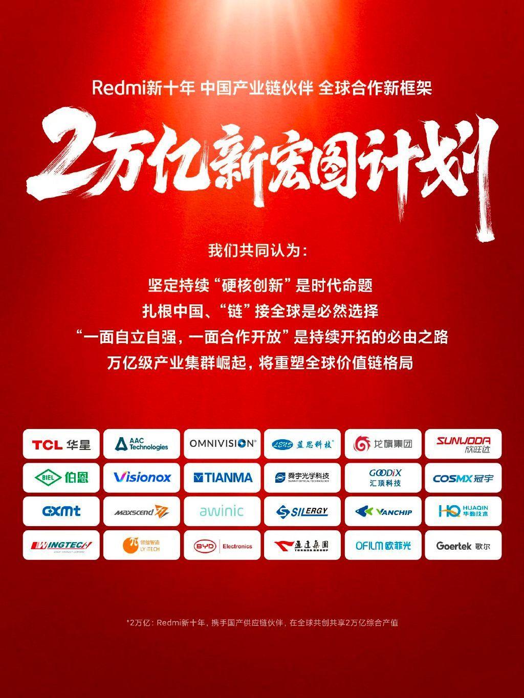 Redmi K70发布在即,Redmi联合24家国产供应链企业打造2万亿产值 中国拥有全球最完备的工业体系,卢伟冰在清河会议中提出了“2万亿新宏图计划”,与24位重点上游产业链的代表共同商讨并达成一项目标,将引领合作供应链走出去,在未来10年内共同创造2万亿综合产值,实现自有国产供应体系的高附加值跃迁,并增加近十万个工作岗位。小米科技公司将在智能手机、手表、耳机、平板等多个高科技领域创造超越苹果、华为的综合价值,2年内成为中国唯一一家市值超过2万亿的公司。中国新智造的起点,Redmi K70系列将全方位引领行业设计、技术风潮。