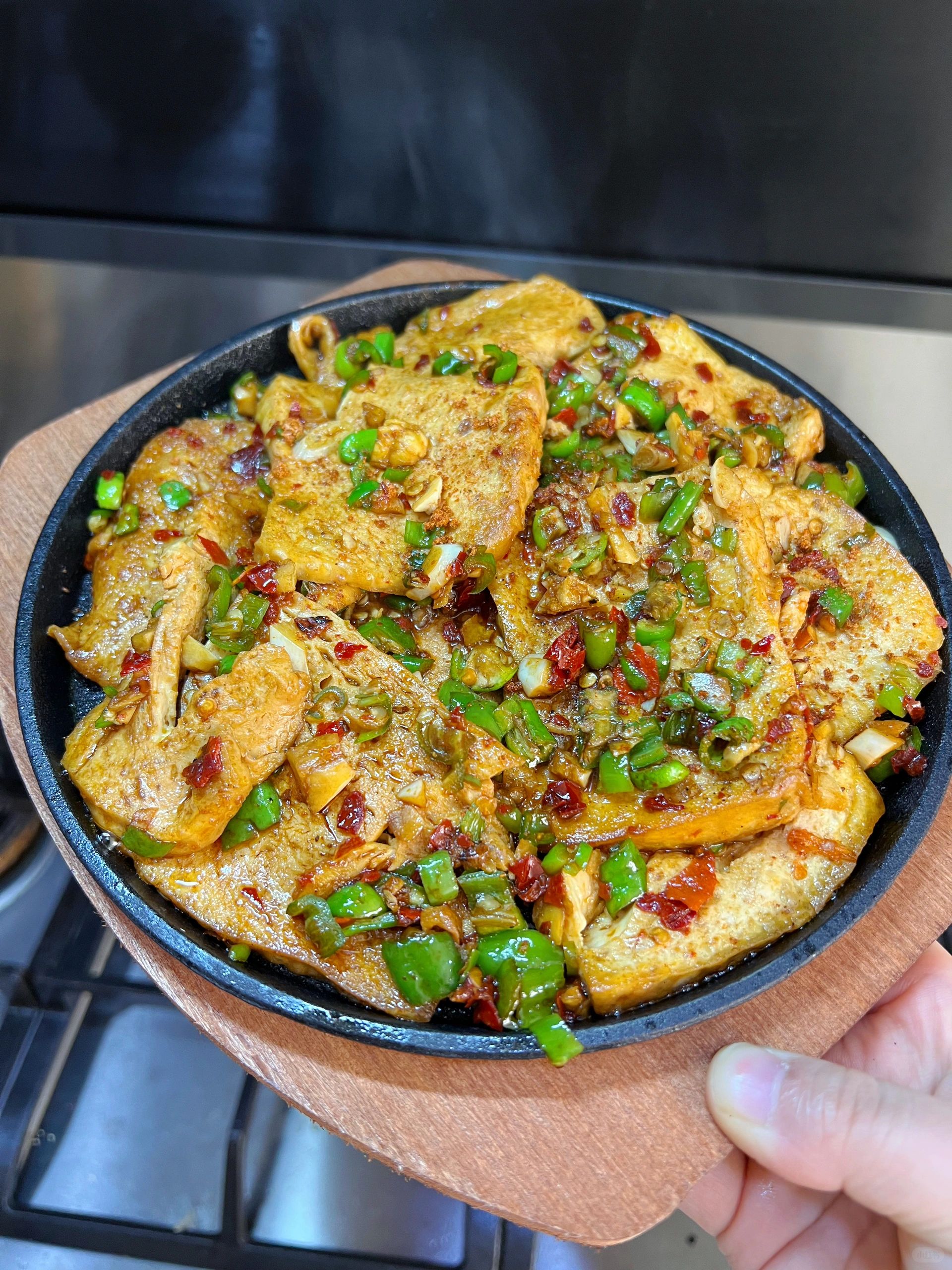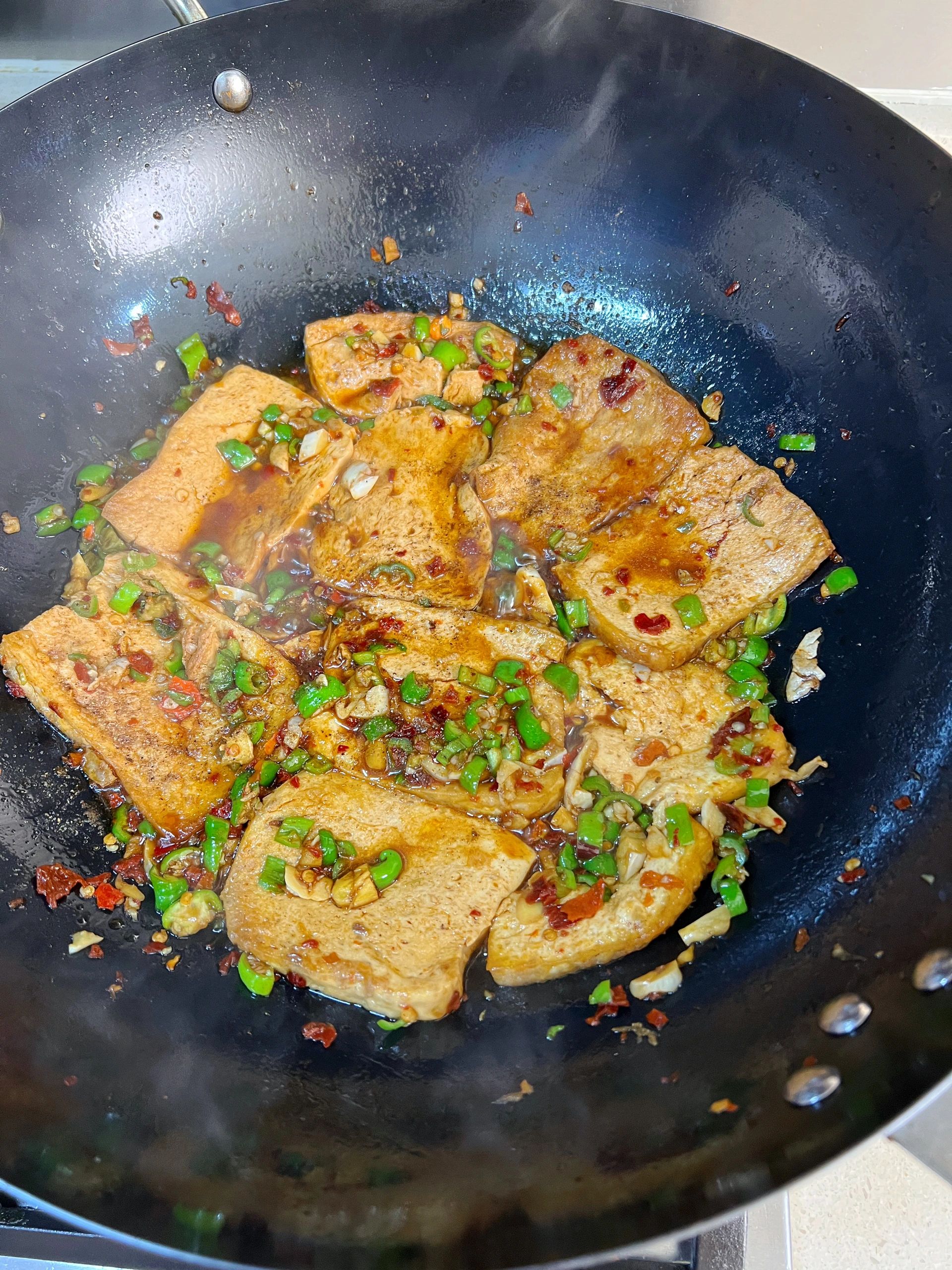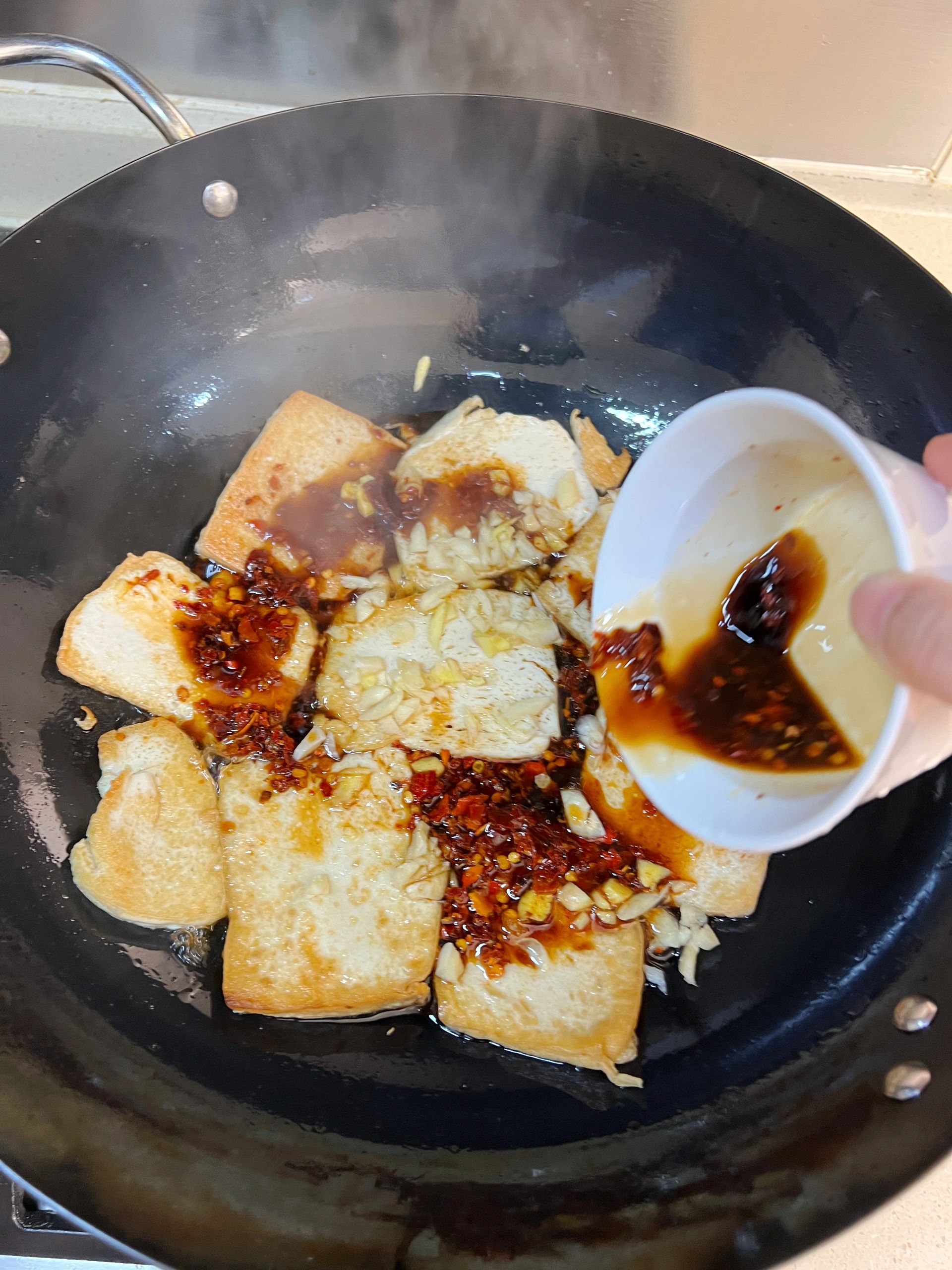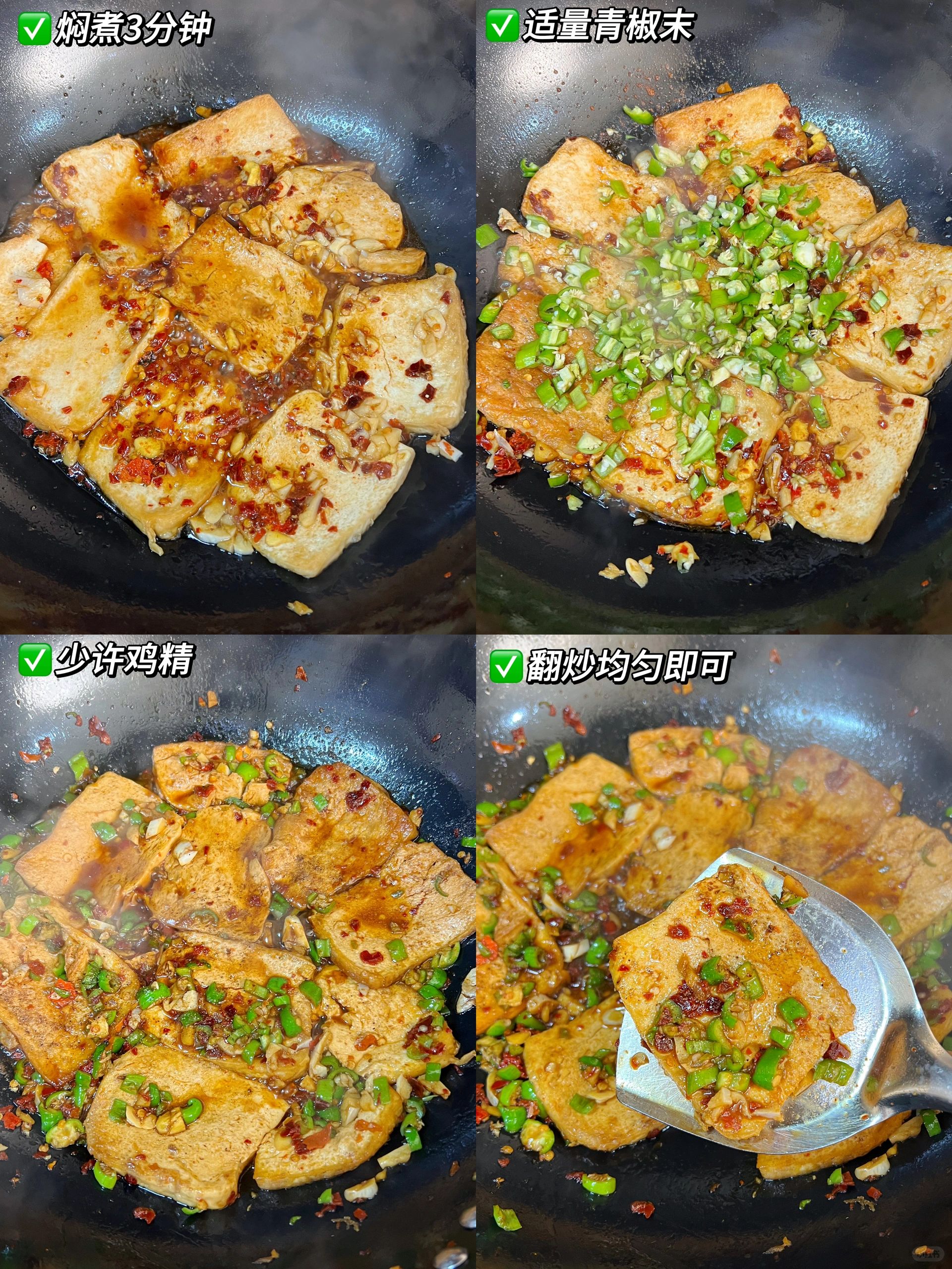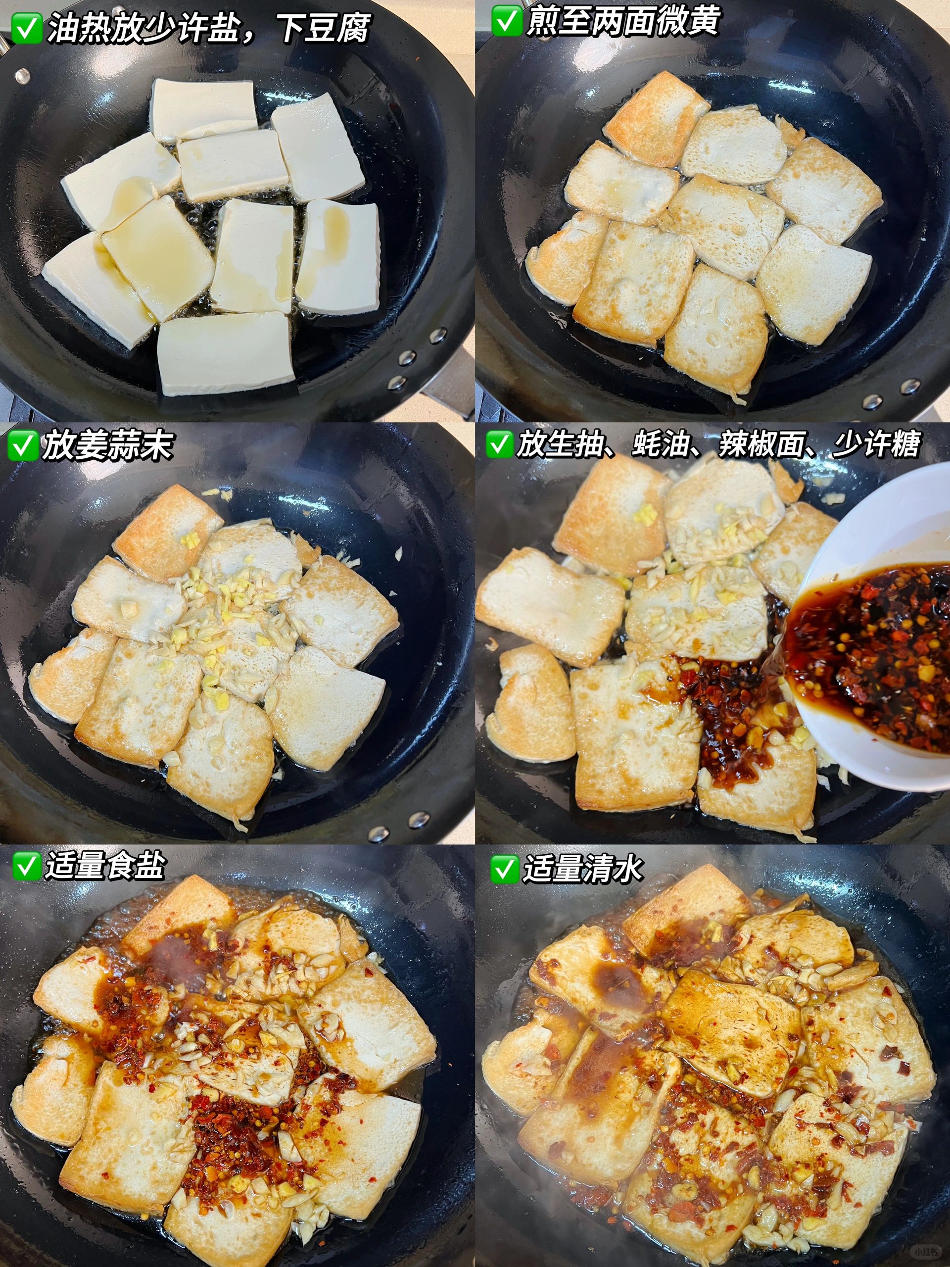 豆腐真的怎么做都好吃,家常味道最让人难忘啦,爱吃豆腐的姐妹快安排起来吧[偷笑R][偷笑R] 🍀食材:豆腐、辣椒面、青椒、姜蒜; 👇做法: 1、油热放点盐,下豆腐煎至两面金黄,放姜蒜炒香; 2、倒入料汁(适量生抽、蚝油、辣椒面、盐、清水、白糖),焖煮5分钟,放青椒、鸡精再焖1分钟即可;