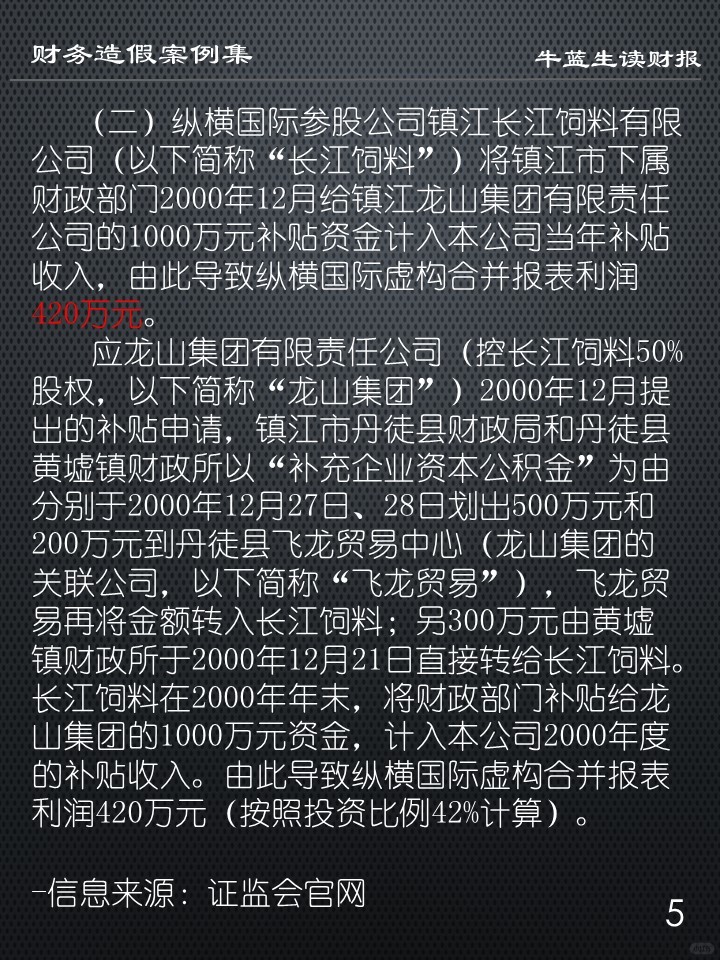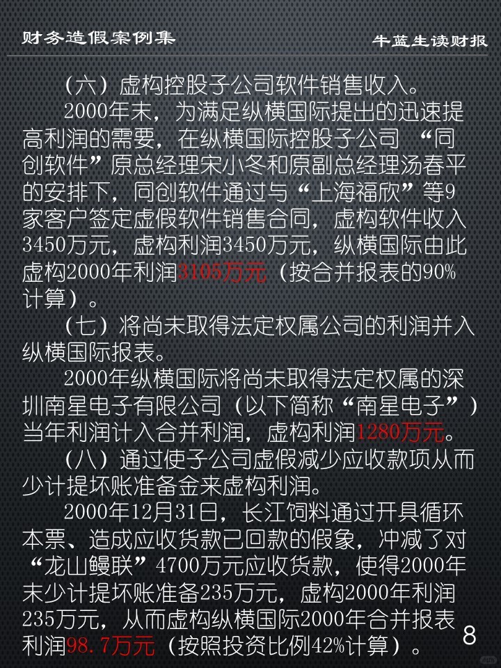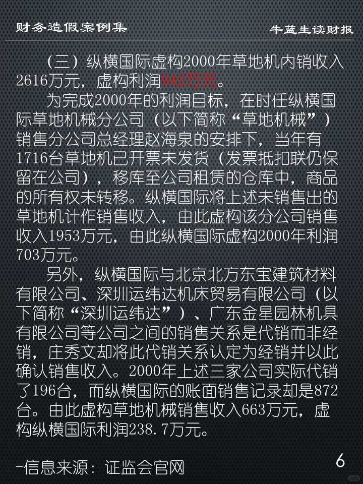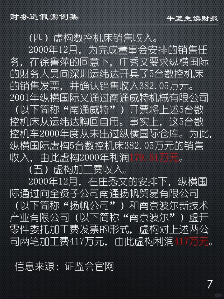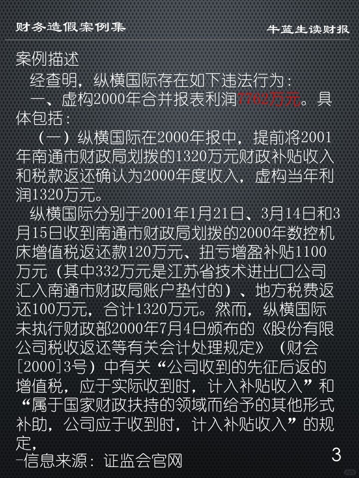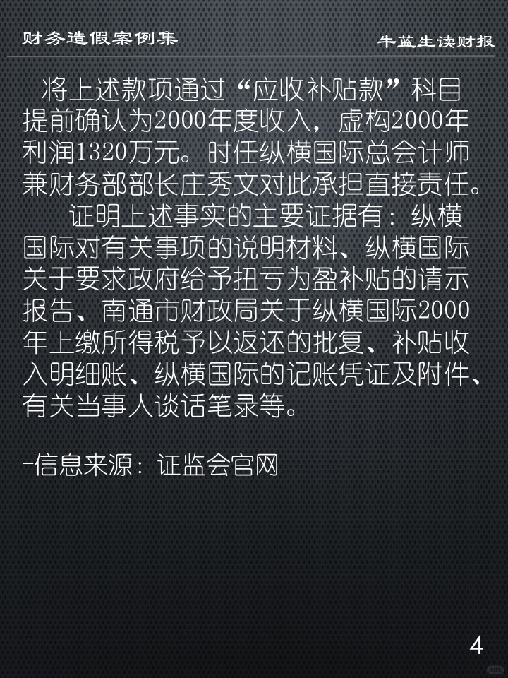 ✈公司:纵横国际 造假金额:2000年虚增利润7762万元 主要手段:提前确认补贴收入、虚构销售收入等 证监会处罚文号:[2004]26号