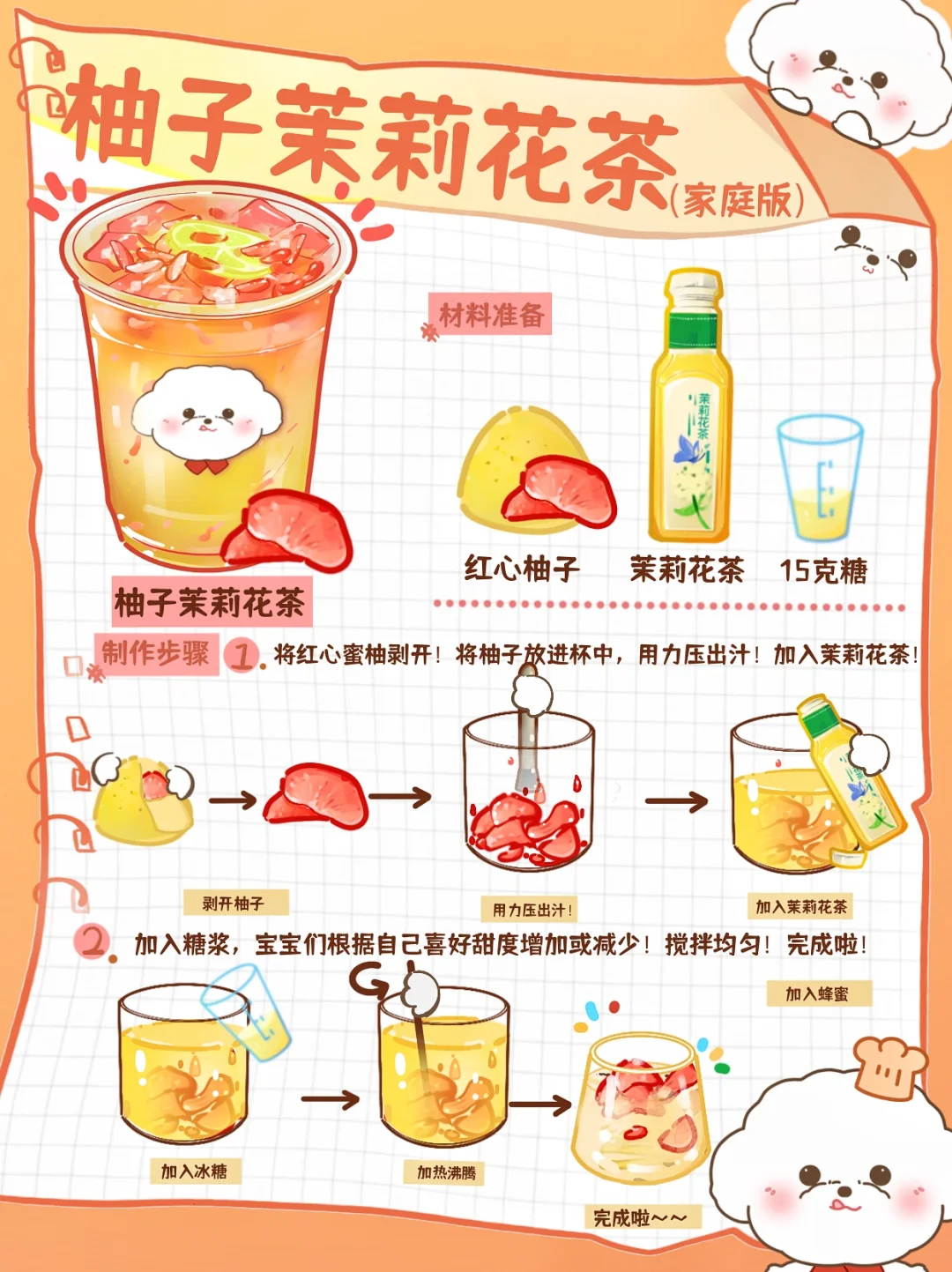 1⃣️将红心蜜柚剥开!将柚子放进杯中,用力压出汁!加入茉莉花茶!