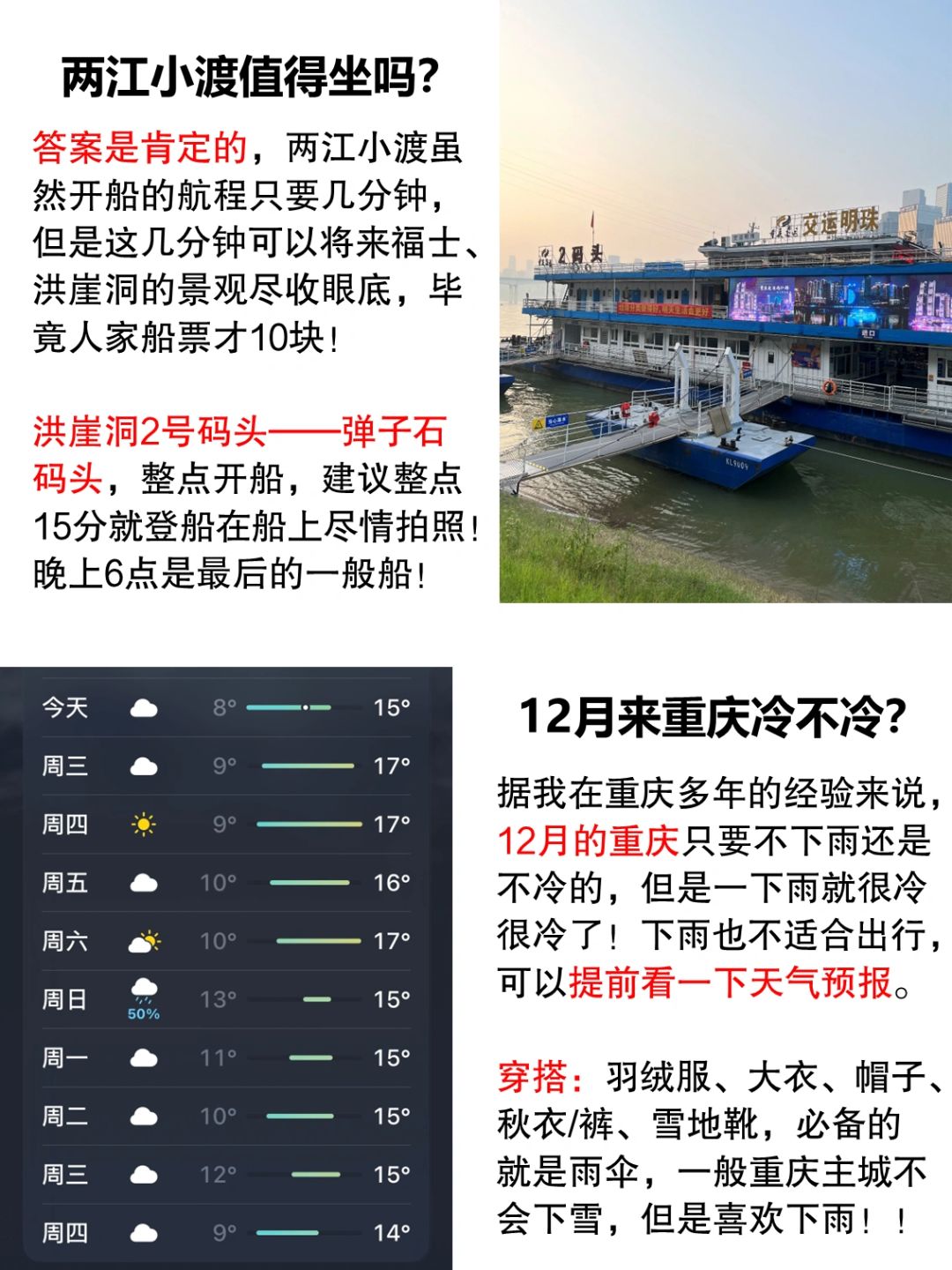 ✔️12月的重庆只要不下雨还是不冷的,但是一下雨就很冷很冷了!下雨也不适合出行可以提前看一下天气预报在决定是否来重庆玩哦