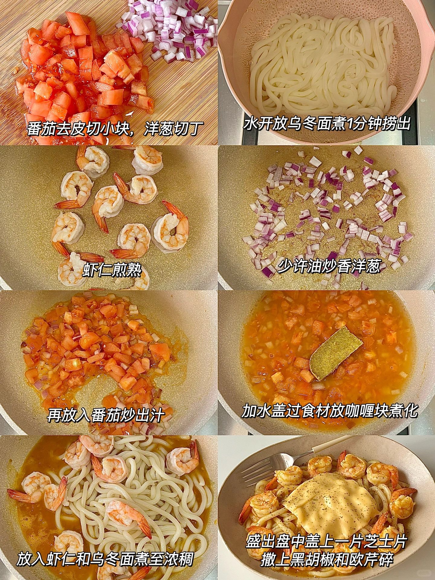 今天吃碗热乎乎的乌冬面🥣汤汁浓郁‼️每一根面条都裹满了酱汁,香迷糊了🥹 - 1️⃣番茄去皮切小块,洋葱切丁,虾仁剥皮去虾线,水开放乌冬面煮1分钟捞出备用 2️⃣先少许油煎熟虾仁备用,放入洋葱炒香后再放番茄炒出汁,倒入盖过食材的水,加一块咖喱煮化 3️⃣最后倒入乌冬面和虾仁翻炒均匀,煮至浓稠,装盘放上一片芝士片,撒上欧芹碎和黑胡椒即可 - 做法超级简单!有手就会✌🏻喜欢的姐妹安排上吧