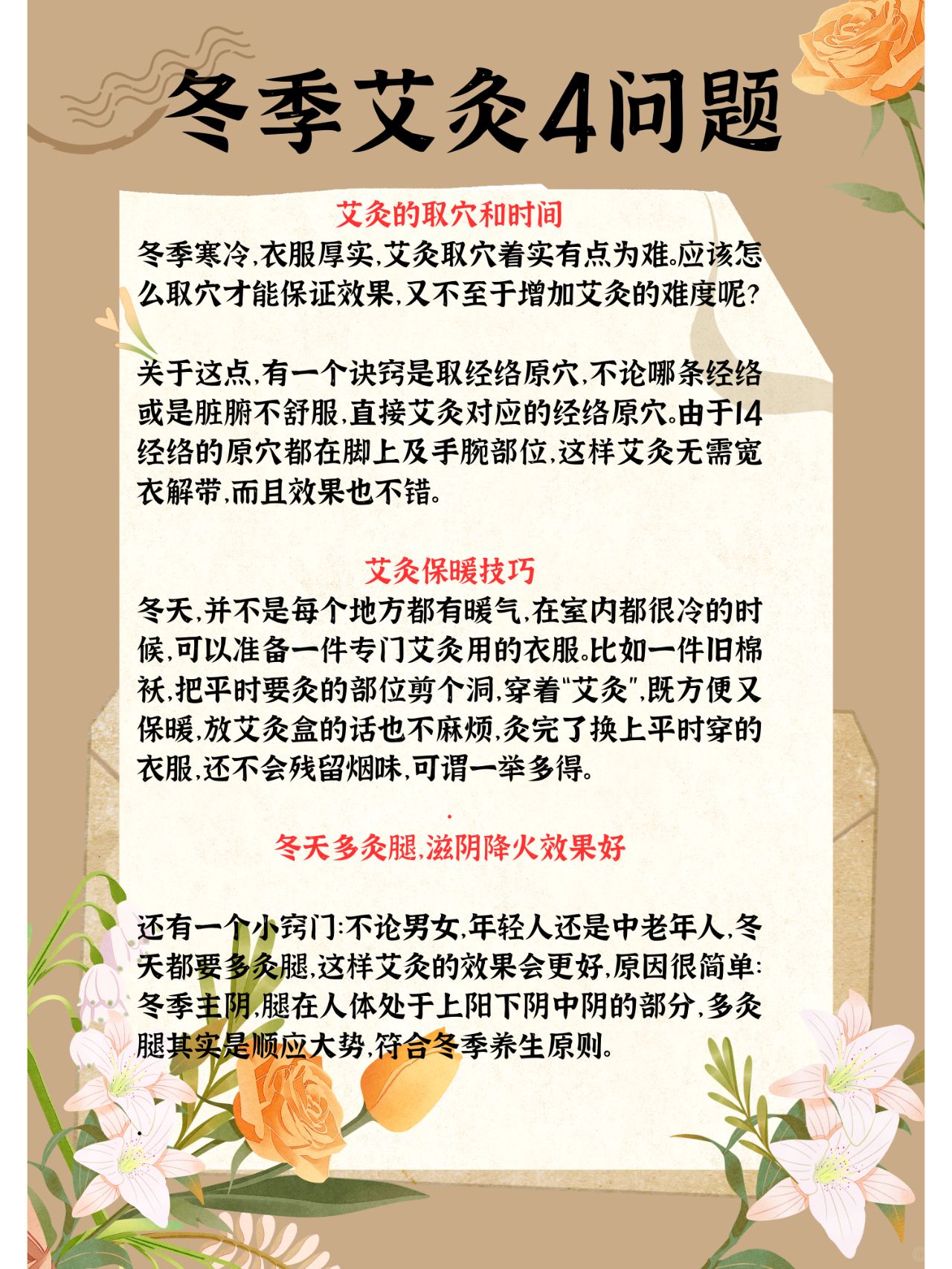 今天给大家总结了4个冬季艾灸经常会出现的问题: 1.有艾烟怎么办? 可以选择两个方式。适当打开窗通风但是不能对着风吹也可以选择一些包含滤烟罩的产品减少烟气的产生。 2.艾灸的取穴? 可以艾灸对应的经络穴位,脚部和肢体上的穴位避免频繁脱衣。 3.艾灸保暖技巧? 可以整理一件专门艾灸的旧衣服,在经常艾灸的地方剪一个能够艾灸的洞即可。 4.冬季艾灸穴位? 建议多艾灸腿部穴位滋阴降火,也符合冬季养生的原则。