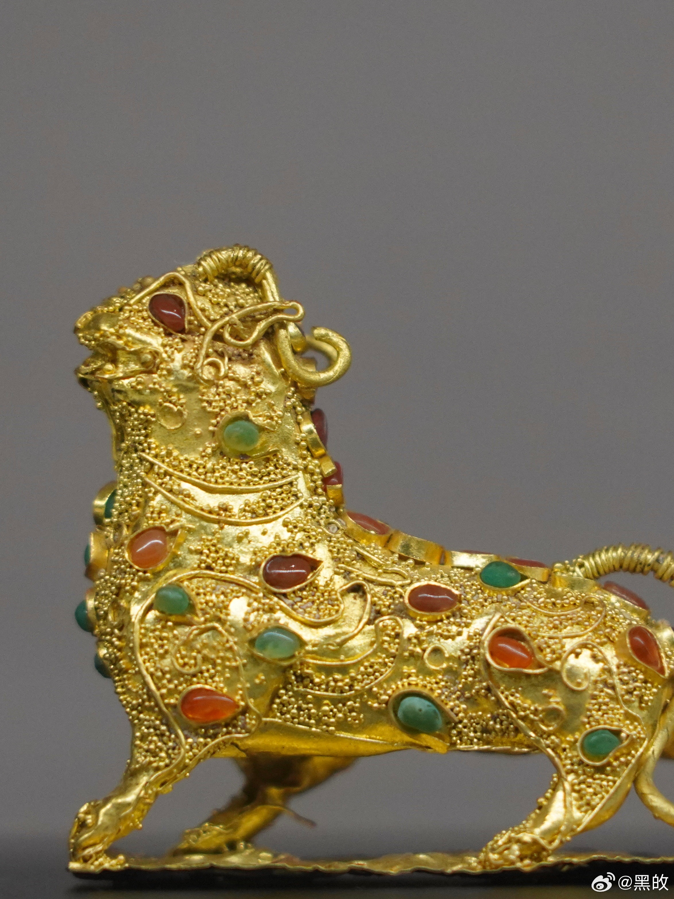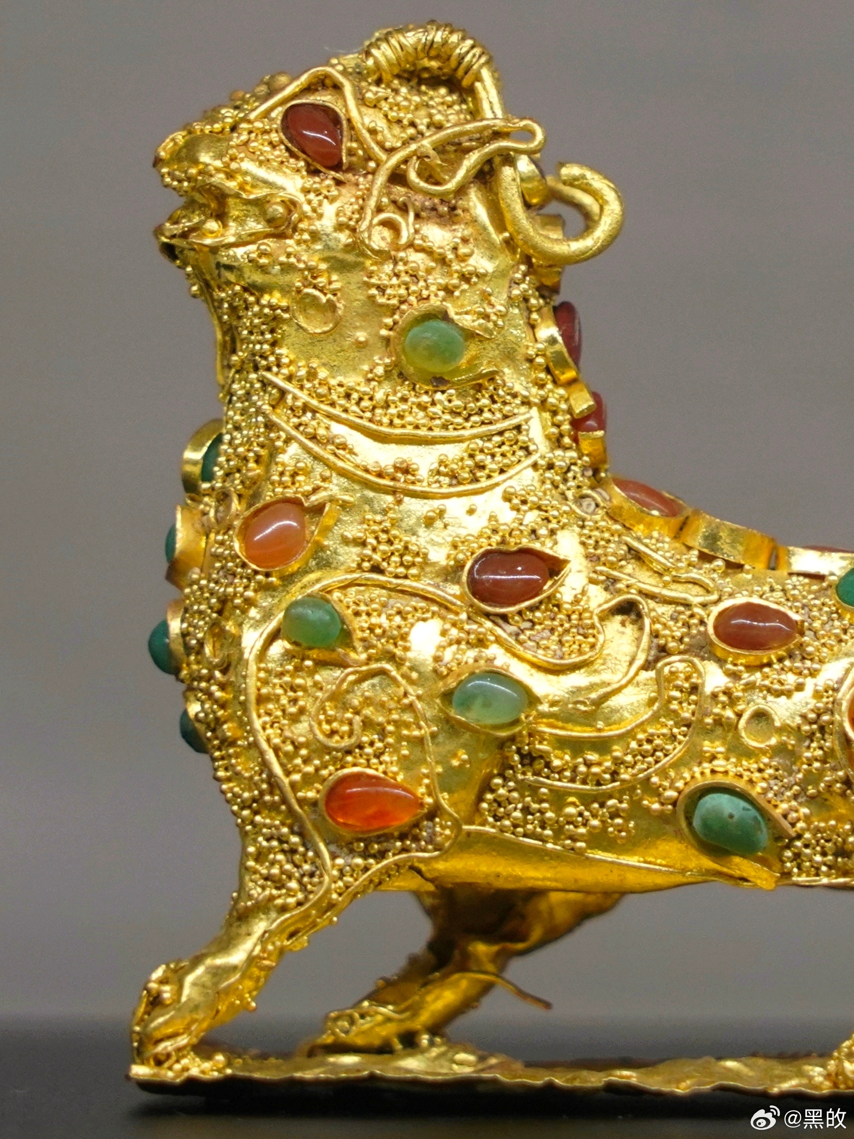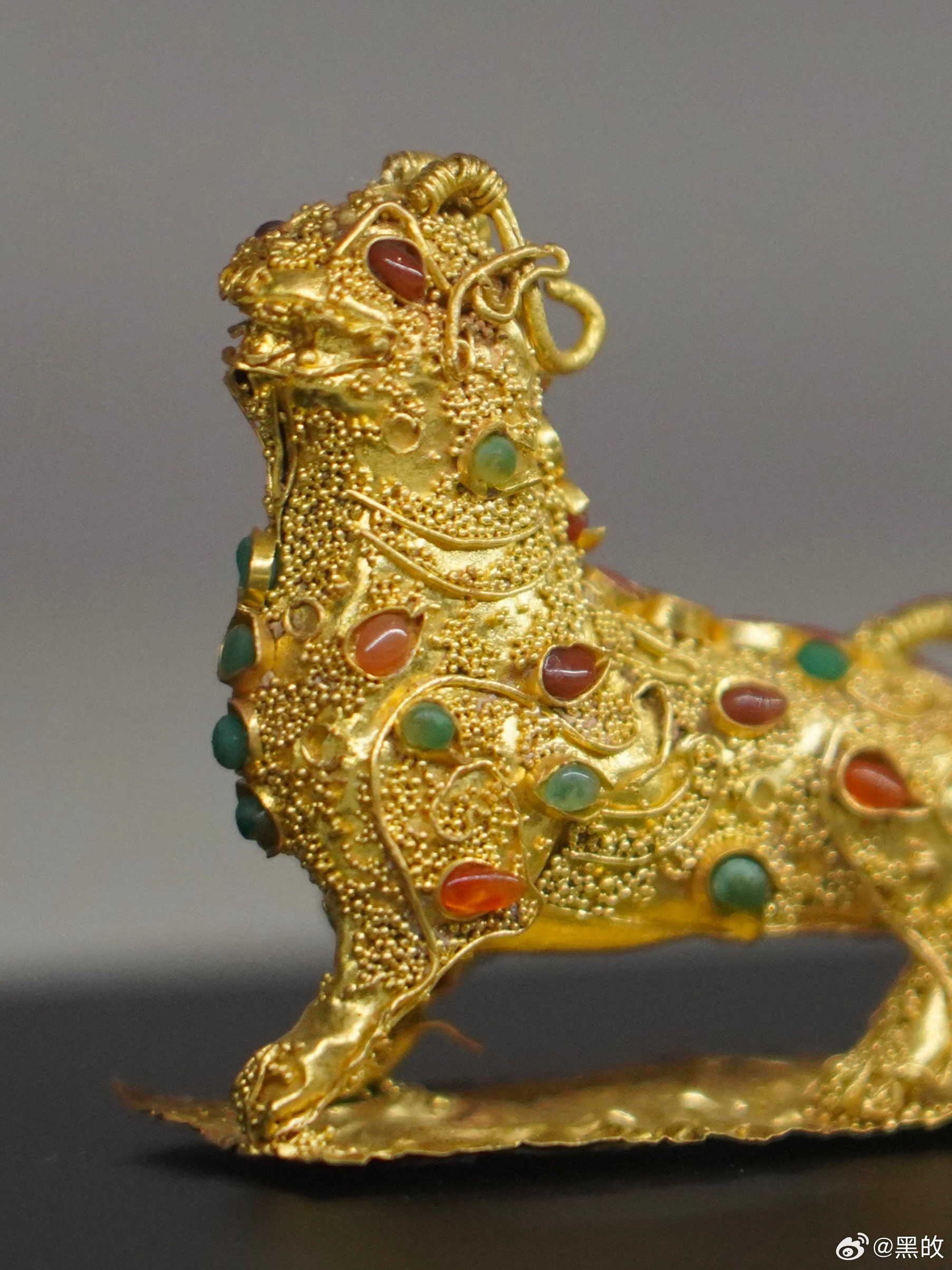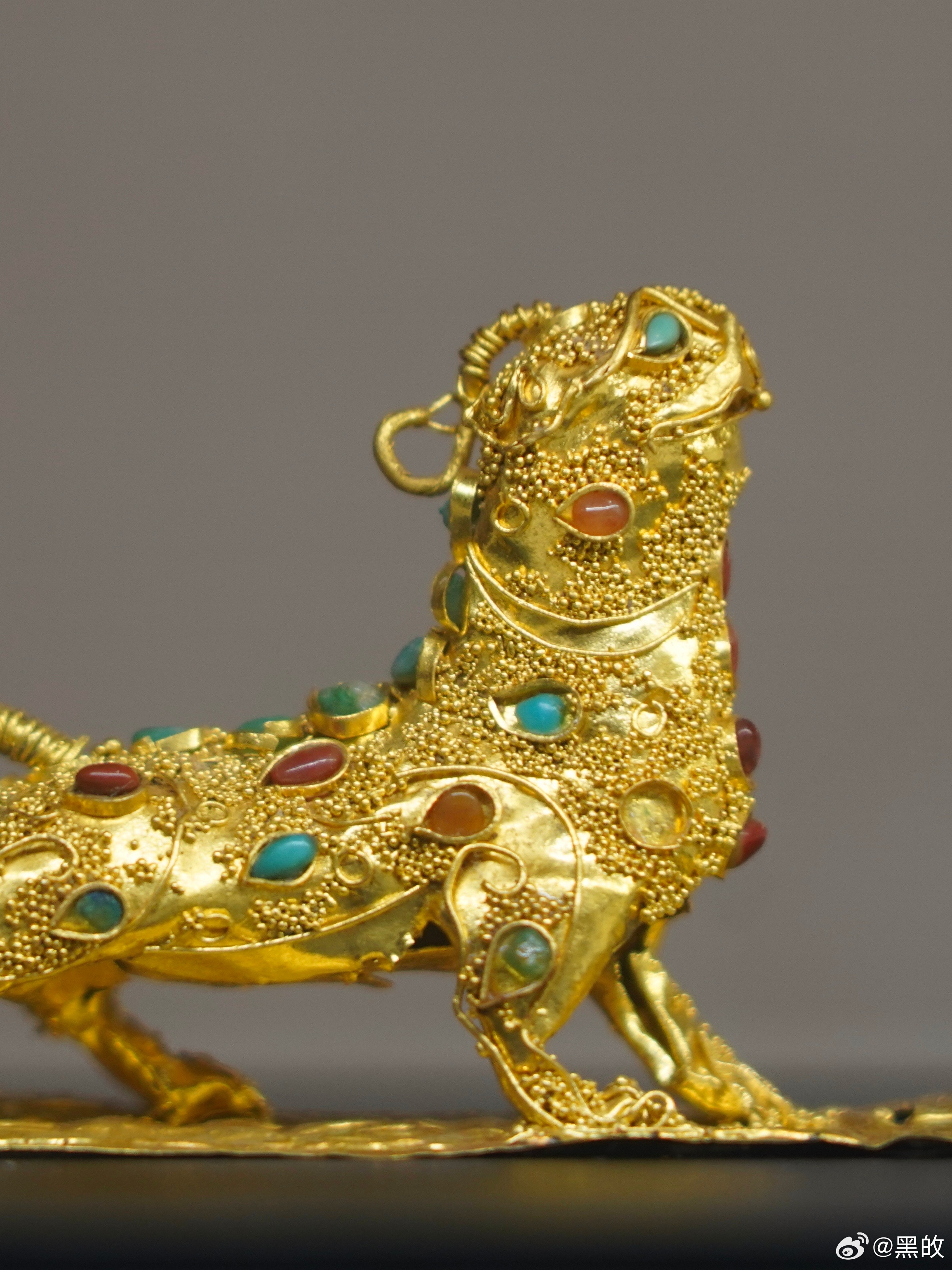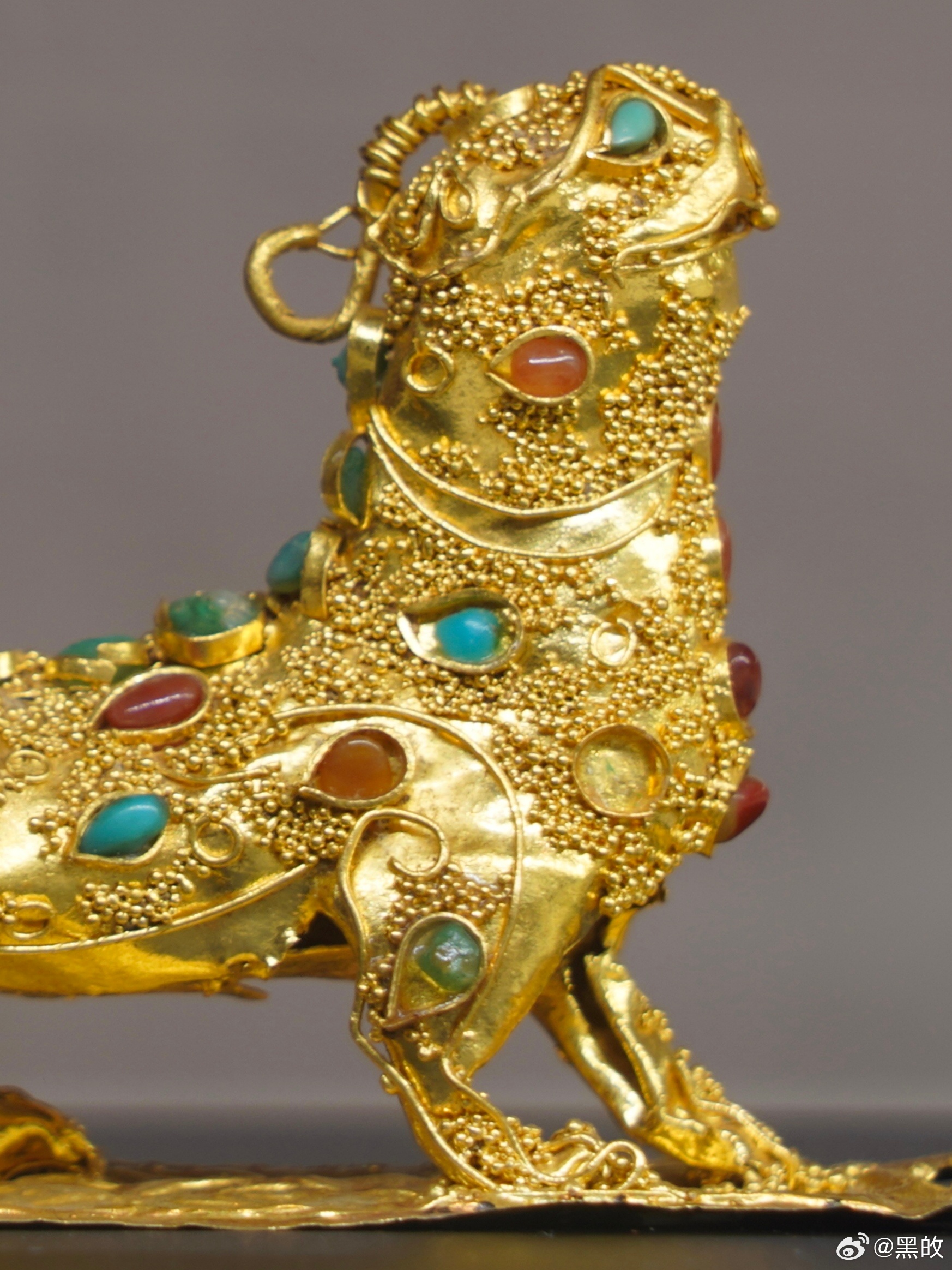 河北定州北陵头村中山穆王刘畅墓出土,东汉时期遗存。通体用金片作成神兽躯体,在用金丝布成羽翅及花纹,周身用金粟粒、绿松石和红宝石加以装饰,双眼嵌以绿宝石或红宝石,制作精湛,集累丝、镶嵌、炸珠工艺于一身,东汉时期金匠的高超技艺真让人叹为观止