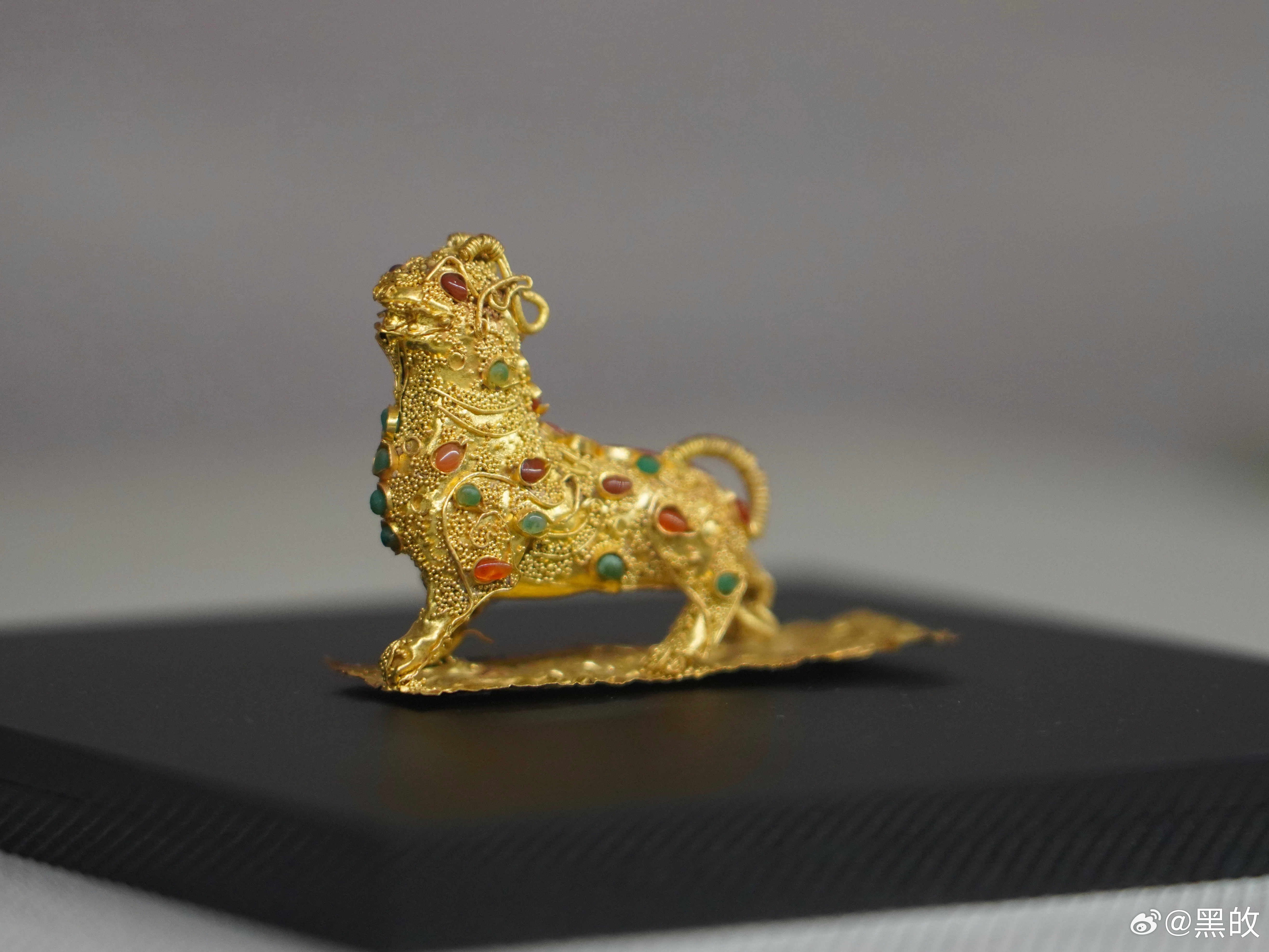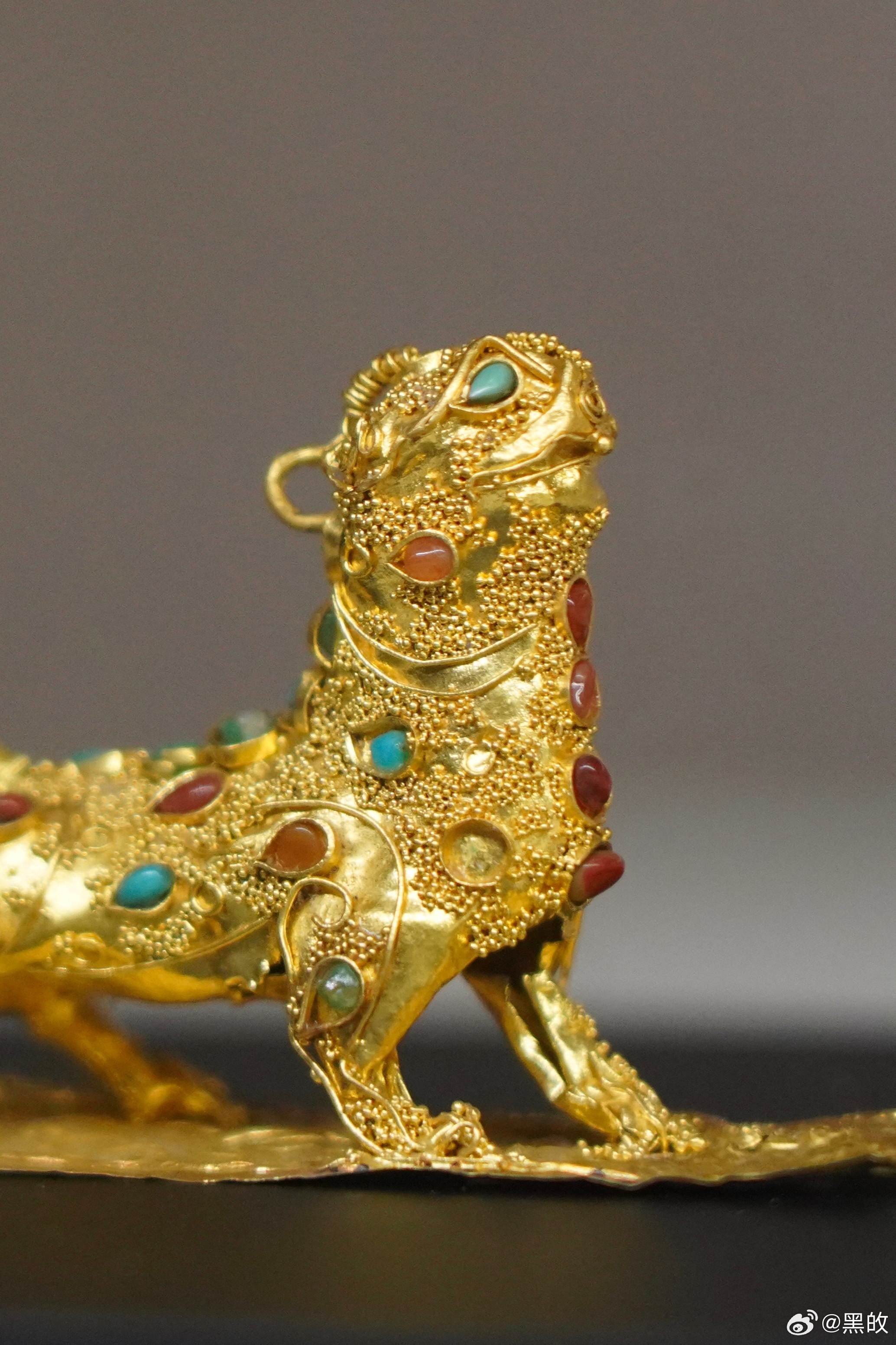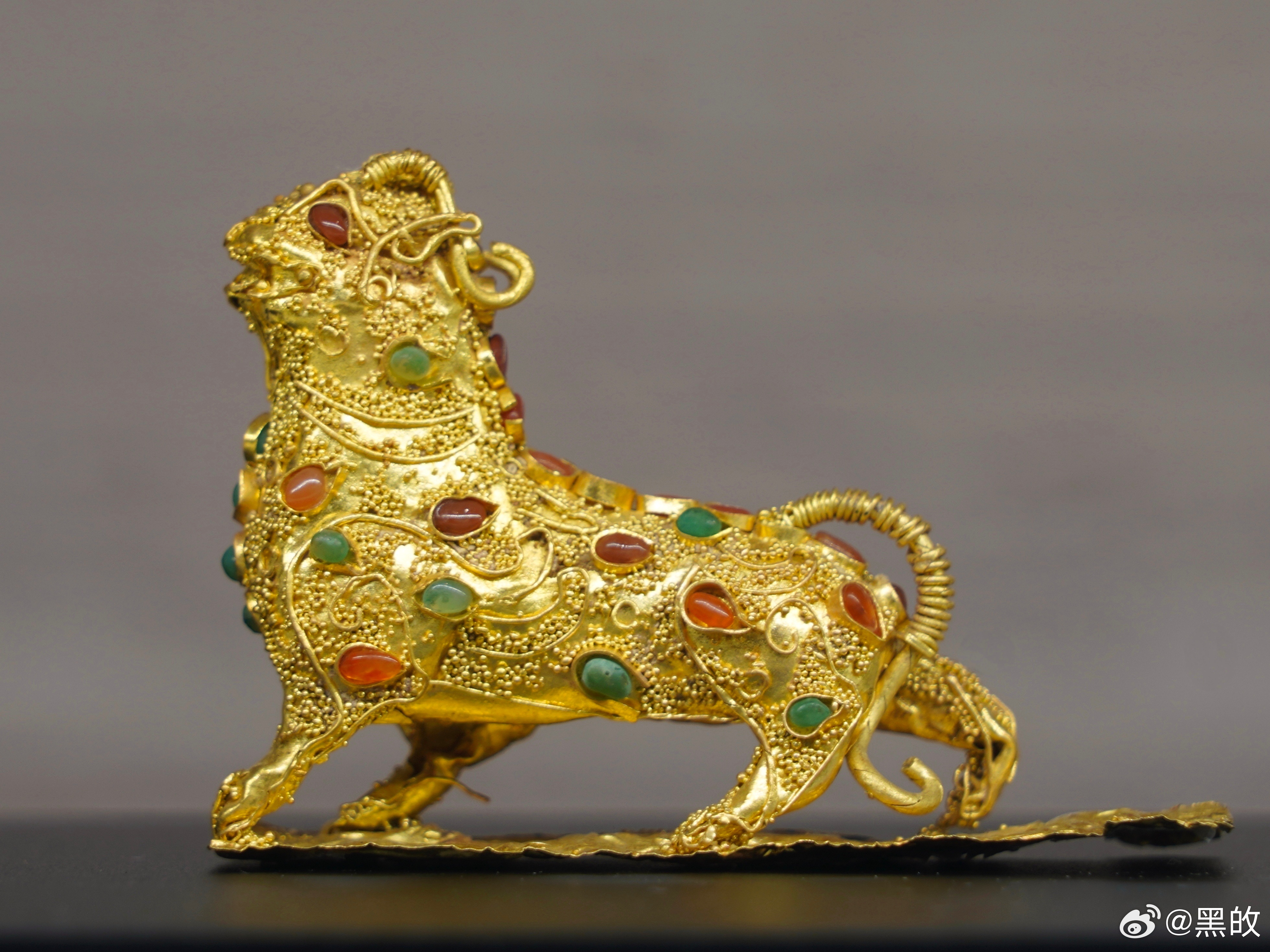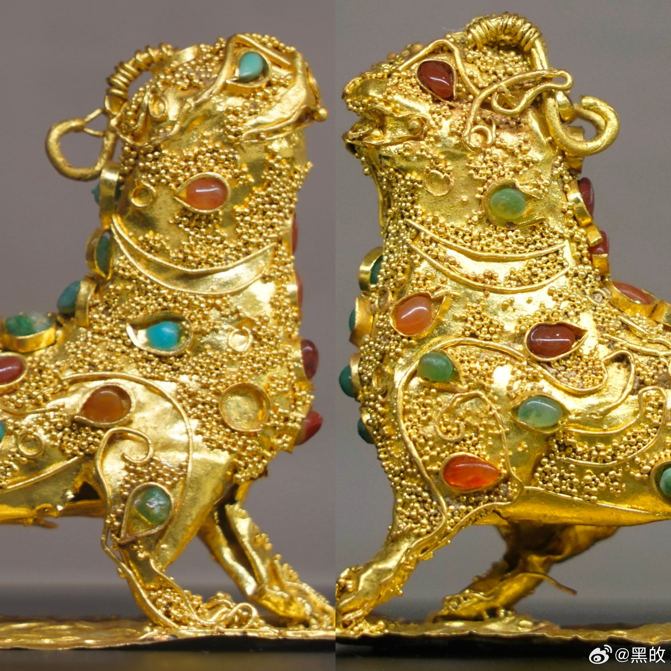 河北定州北陵头村中山穆王刘畅墓出土,东汉时期遗存。通体用金片作成神兽躯体,在用金丝布成羽翅及花纹,周身用金粟粒、绿松石和红宝石加以装饰,双眼嵌以绿宝石或红宝石,制作精湛,集累丝、镶嵌、炸珠工艺于一身,东汉时期金匠的高超技艺真让人叹为观止