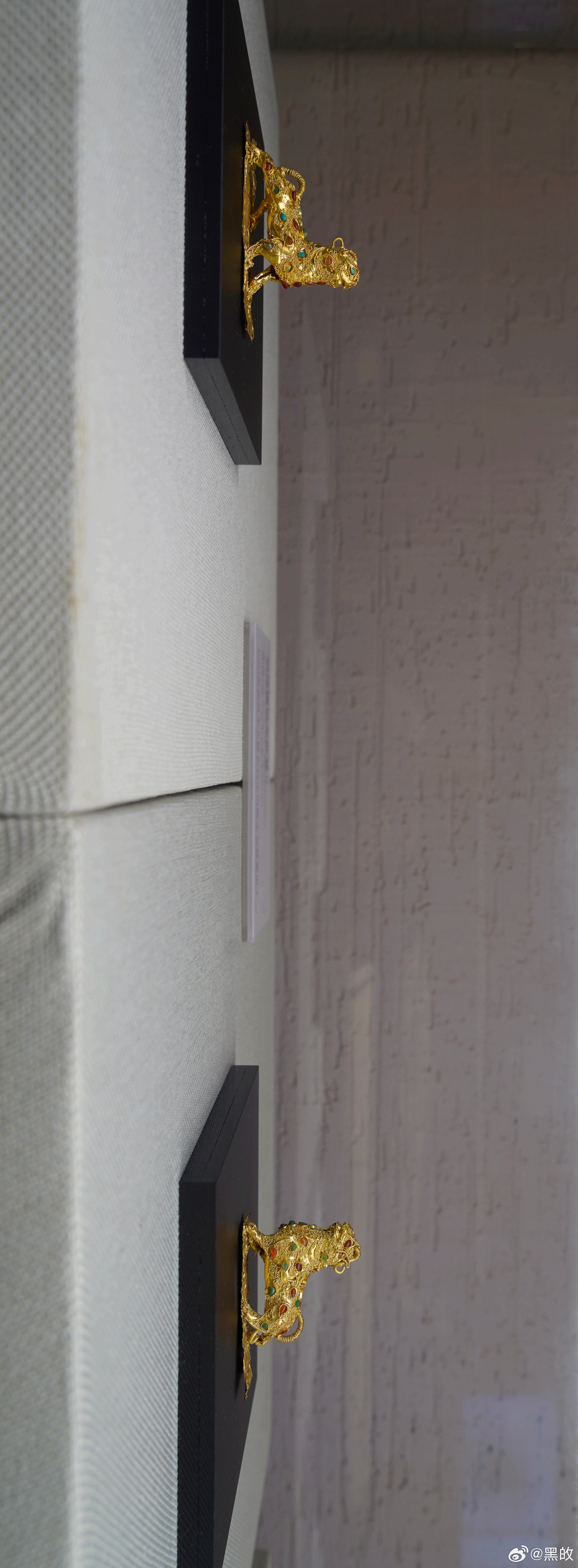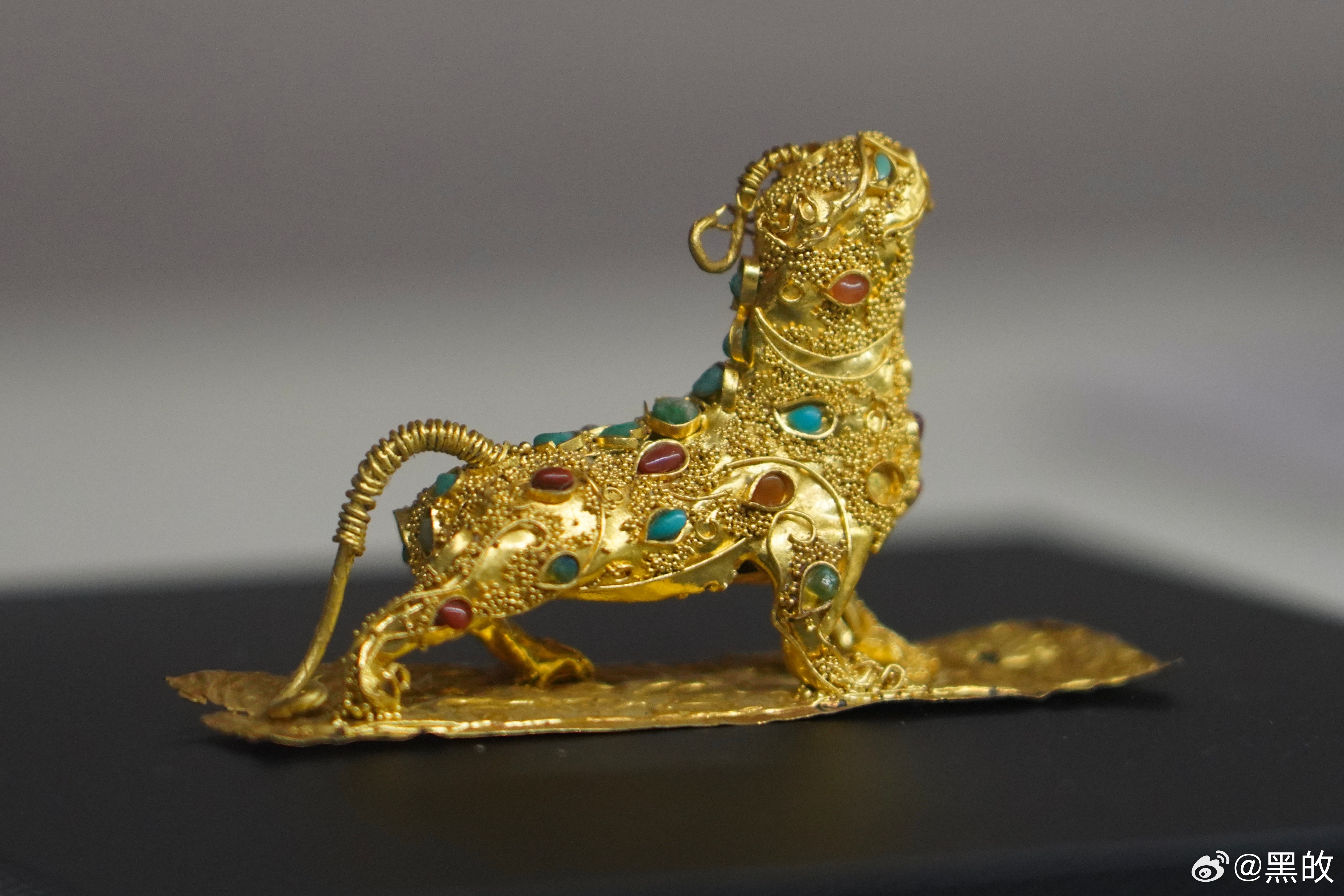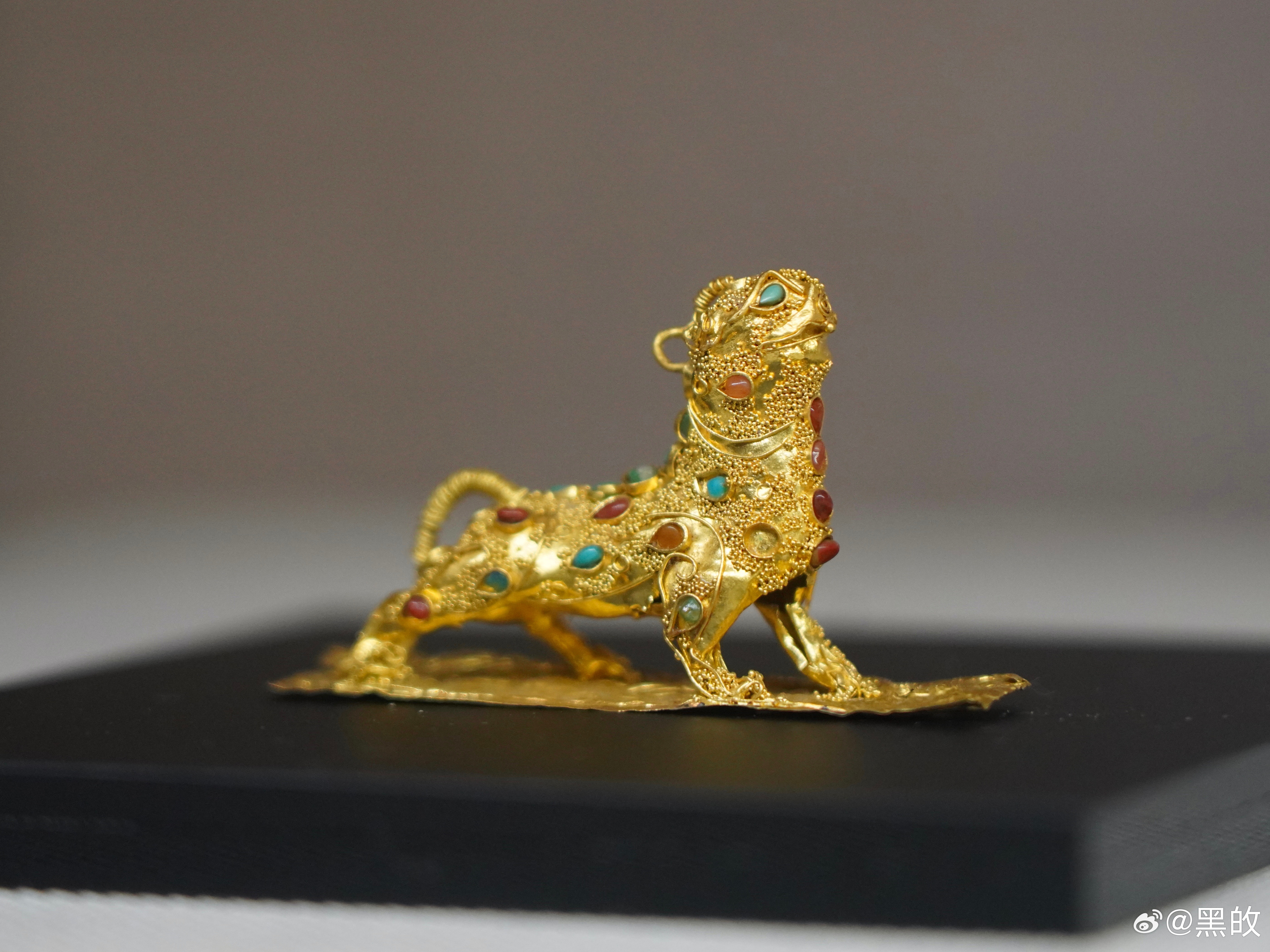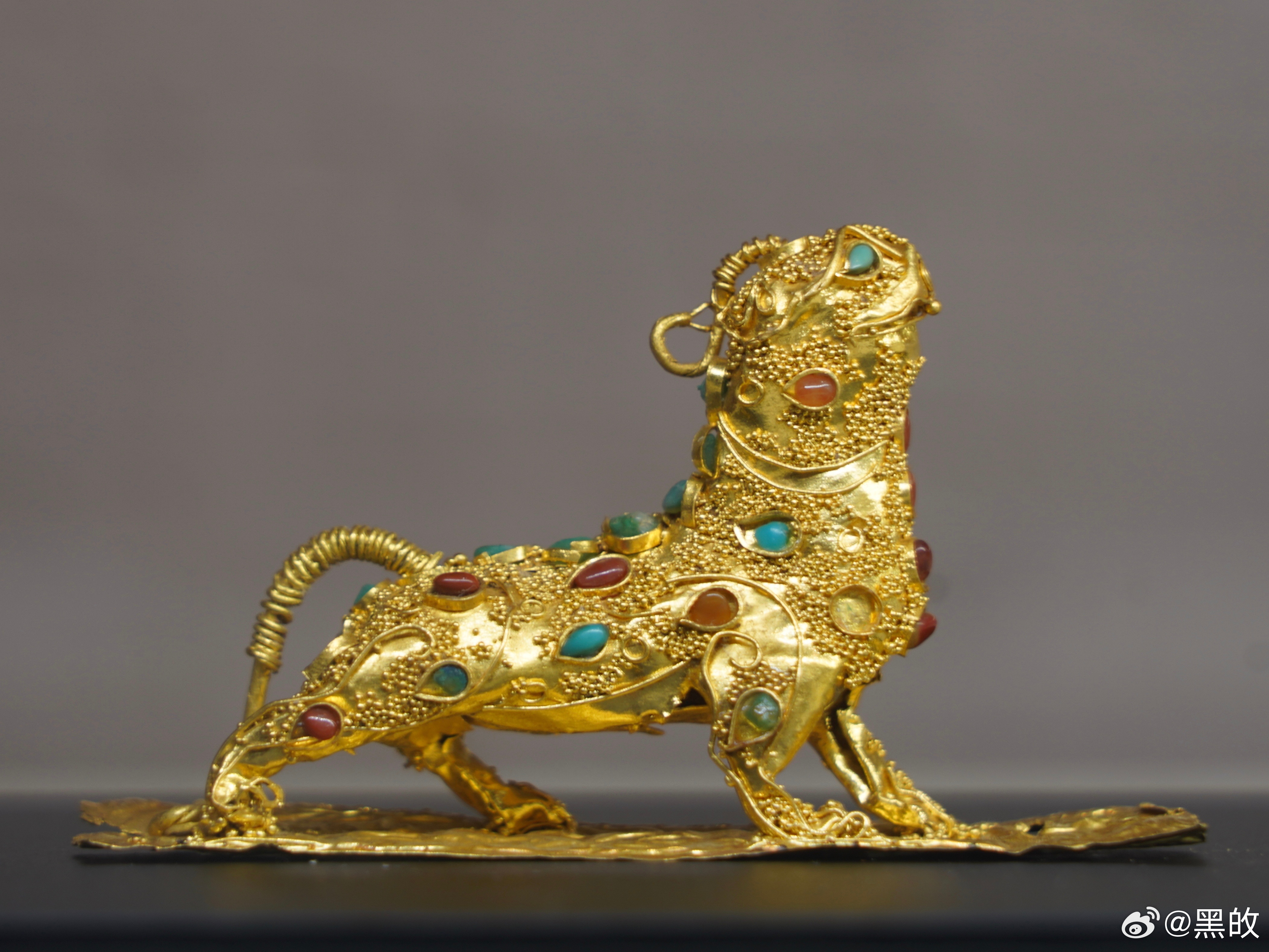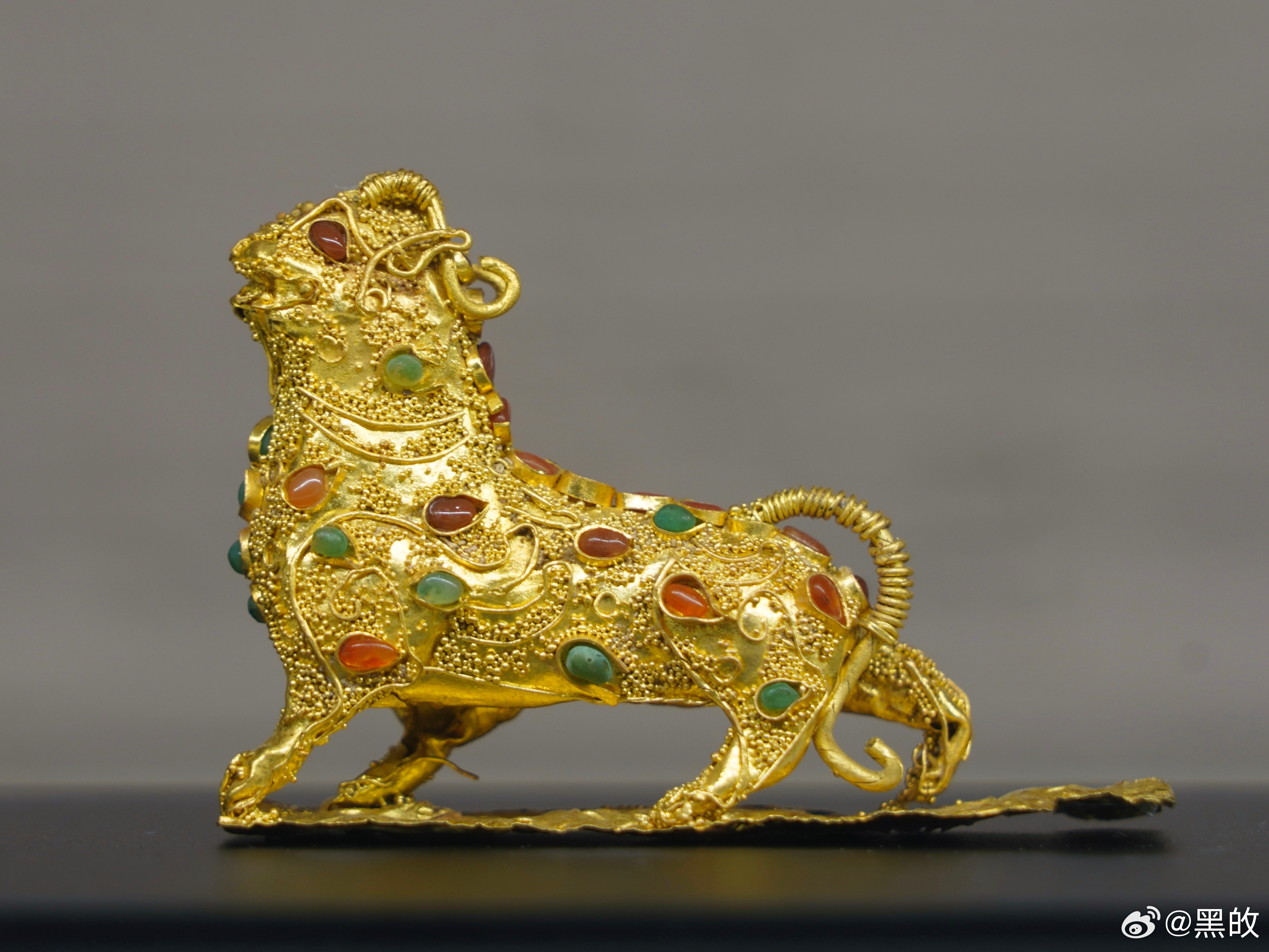河北定州北陵头村中山穆王刘畅墓出土,东汉时期遗存。通体用金片作成神兽躯体,在用金丝布成羽翅及花纹,周身用金粟粒、绿松石和红宝石加以装饰,双眼嵌以绿宝石或红宝石,制作精湛,集累丝、镶嵌、炸珠工艺于一身,东汉时期金匠的高超技艺真让人叹为观止