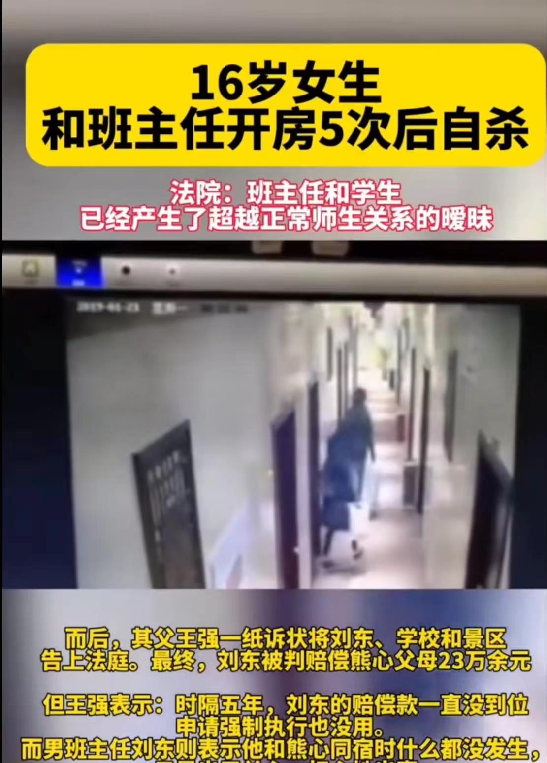 “让人痛心!”重庆,一16岁女生与班主任男老师同宿5次后,女学生自杀跳水溺亡。事发后,老师一口咬定,同宿但未发生关系。家长一纸诉状将涉事方告上法庭,班主任被判赔20万余元,可是5年过去了,赔偿款至今未到位,甚至强制执行也没用。