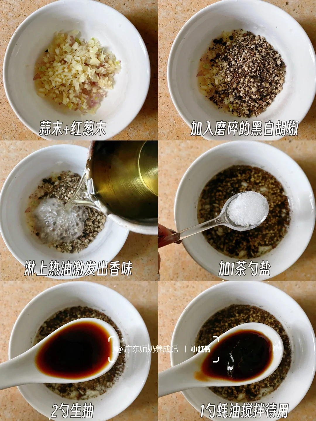 1️⃣黑白胡椒先磨碎,加入蒜末和红葱末,淋上热油,参考图片调个胡椒汁
