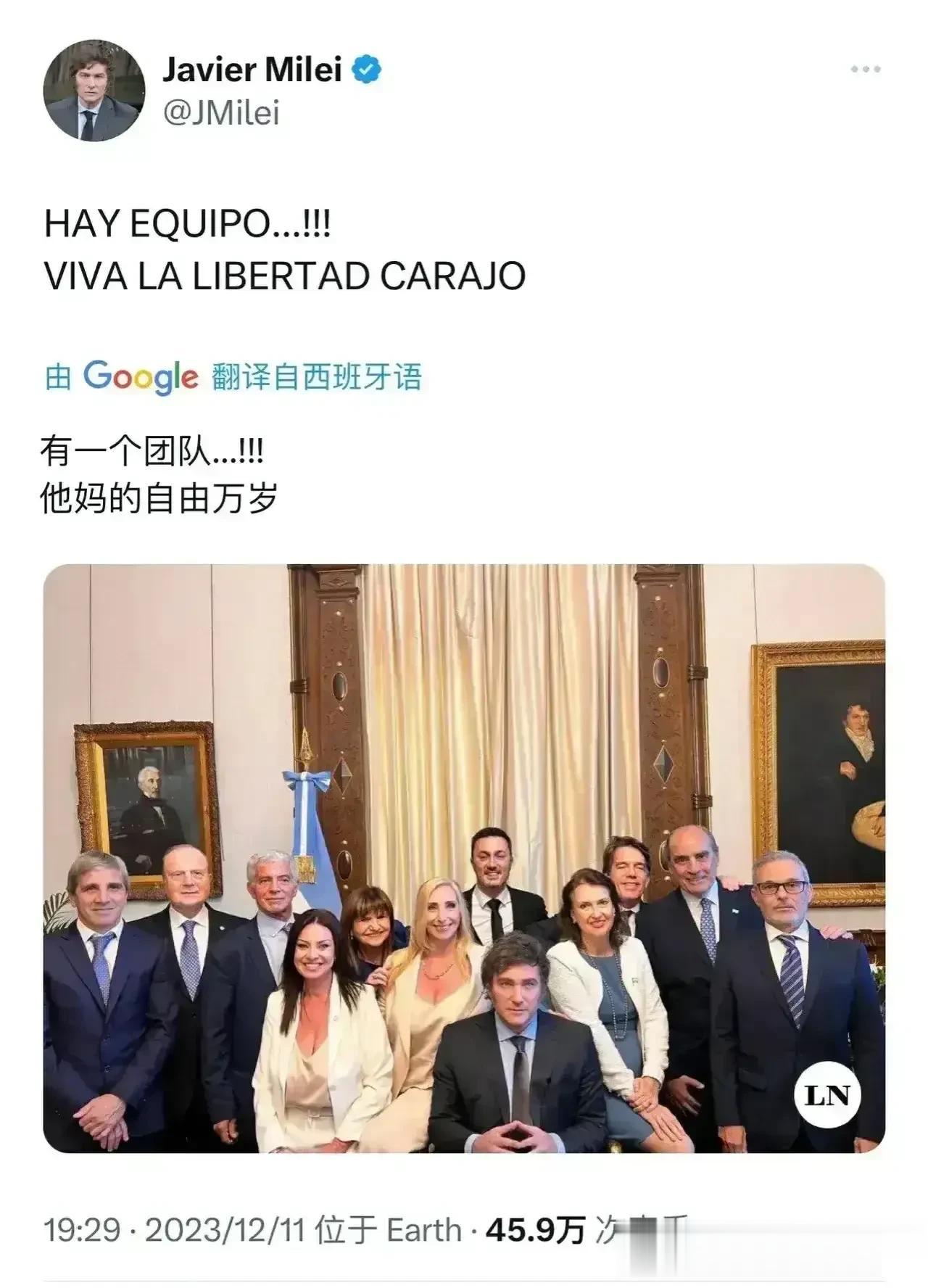 阿根廷总统米莱任职后有5个疯狂的举动: 第一:把18个政府机构直接砍掉只剩下9个部门 第二:宣布自己的女朋友就任副总统 第三:宣布自己的妹妹就任第一夫人 第四:当众和自己的亲妹妹来个舌吻 第五:就职当天和乌克兰总统泽连斯基来了个深深的拥抱(有点英雄惺惺相惜的样子) 这位疯狂总统的座右铭:有一个团队,…… 感觉这位仁兄的疯狂程度不比乌克兰的“司机”差呀[捂脸] #爆料#