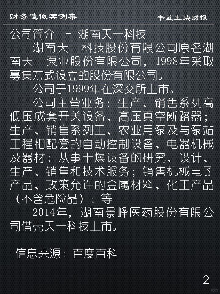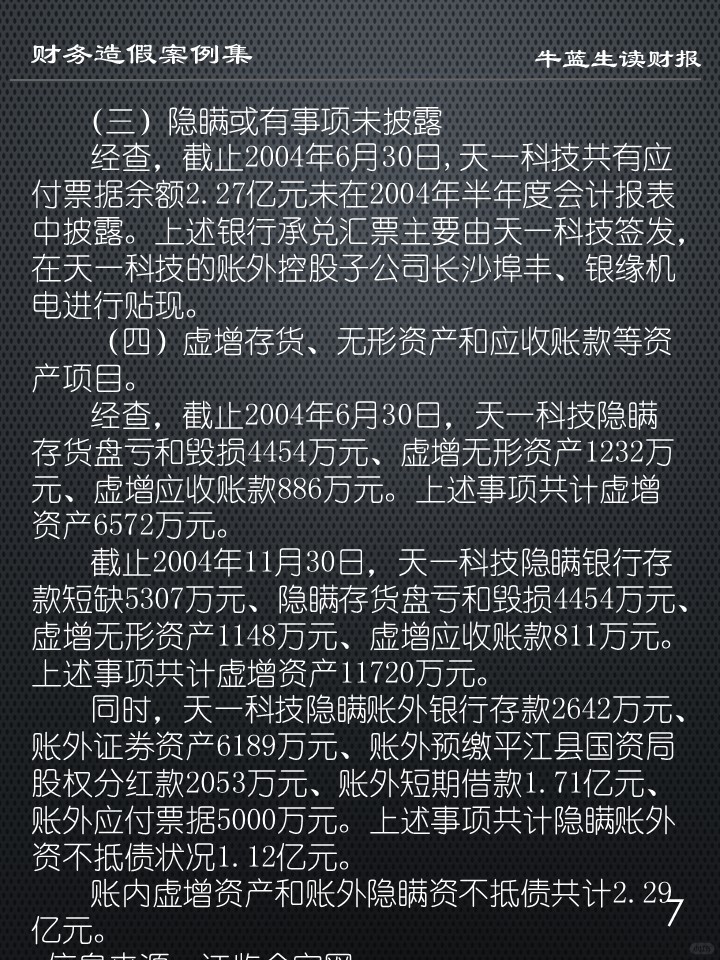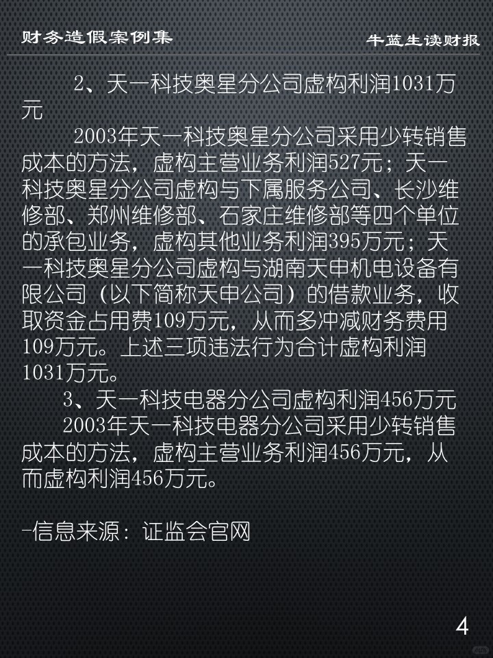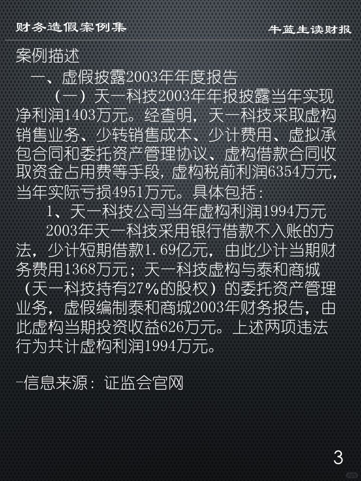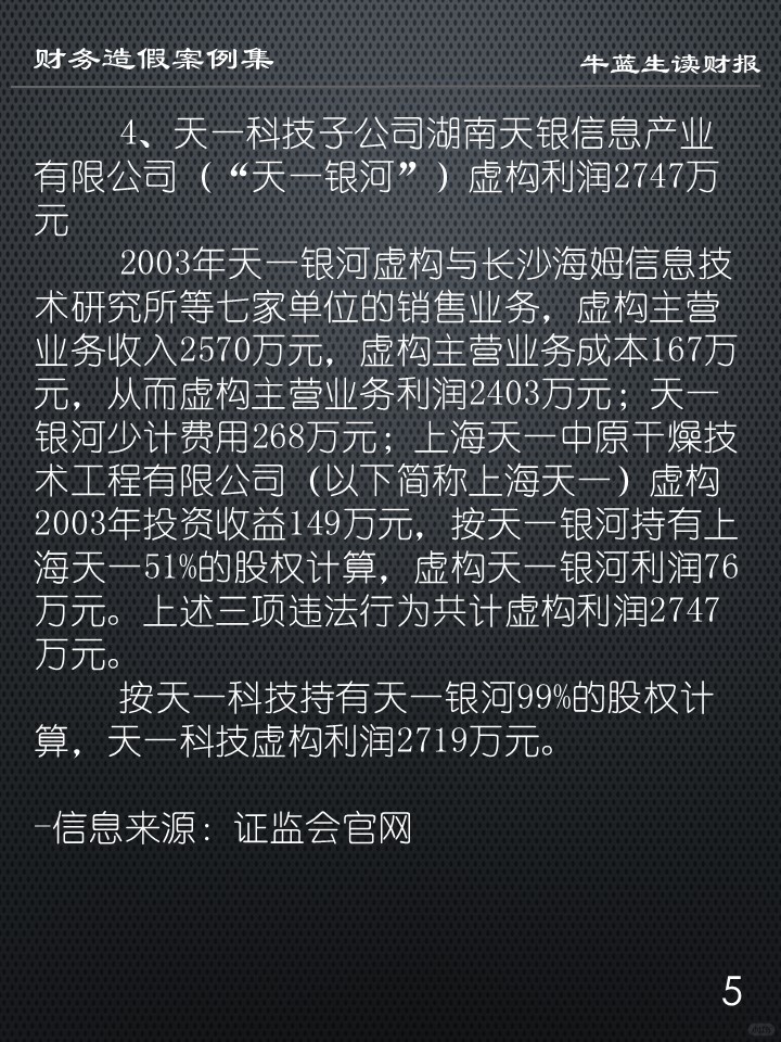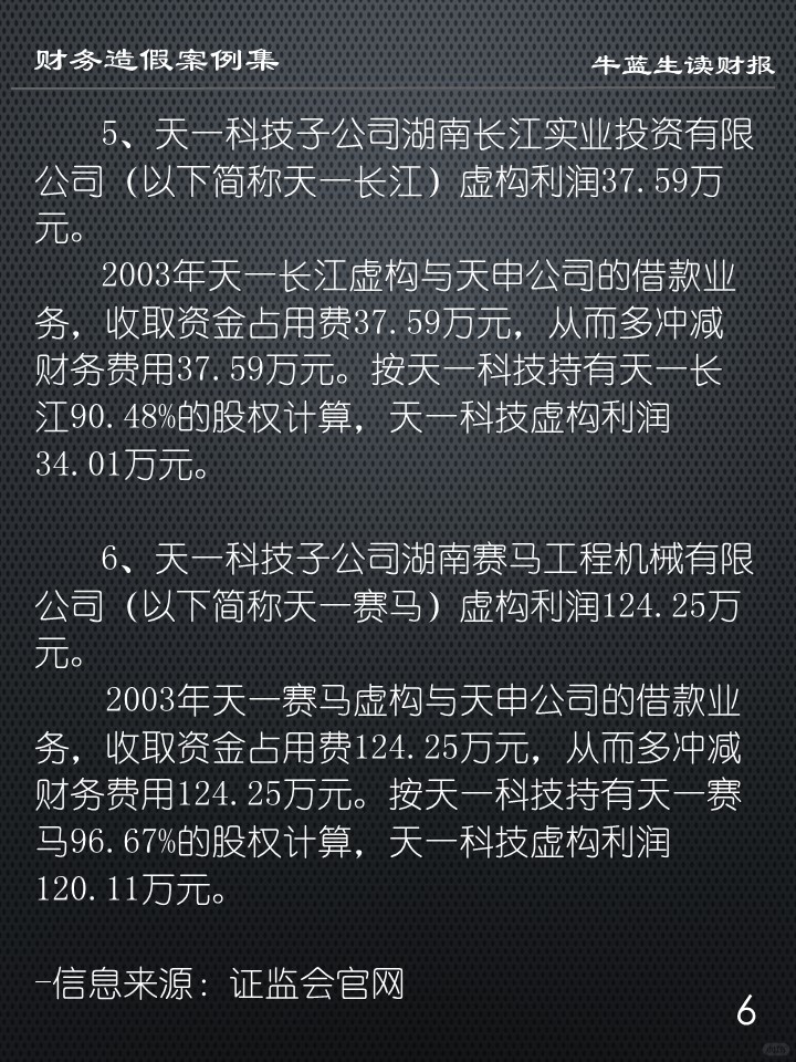 ✈公司:湖南天一科技 造假金额:2003年虚增利润6354万元,等 主要手段:虚构销售业务、少转销售成本、少计费用、虚拟承包合同和委托资产管理协议、虚构借款合同收取资金占用费等 证监会处罚文号:[2005]26号,[2005]27号 后果:公司及相关人员被处罚。后来,公司被重组。