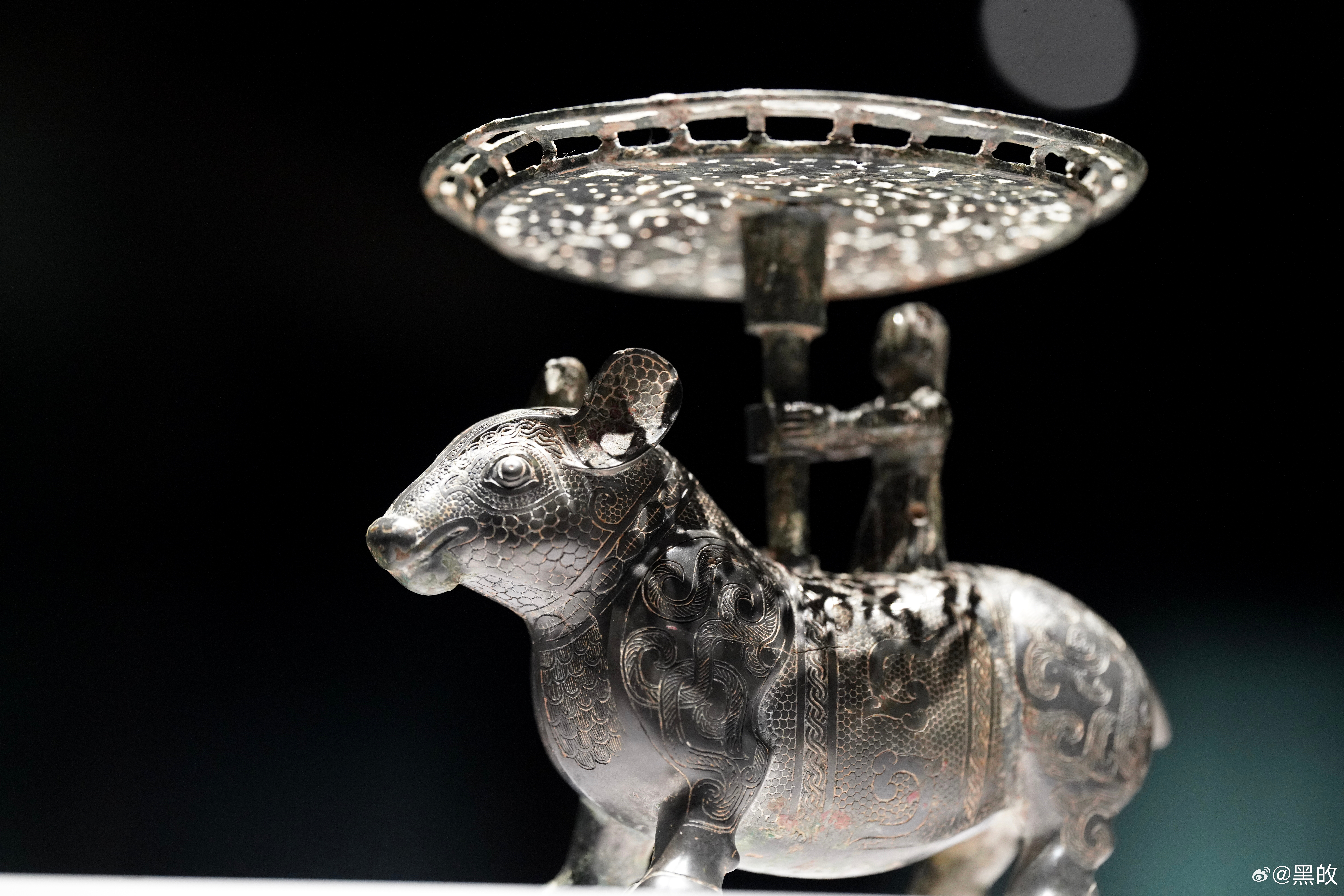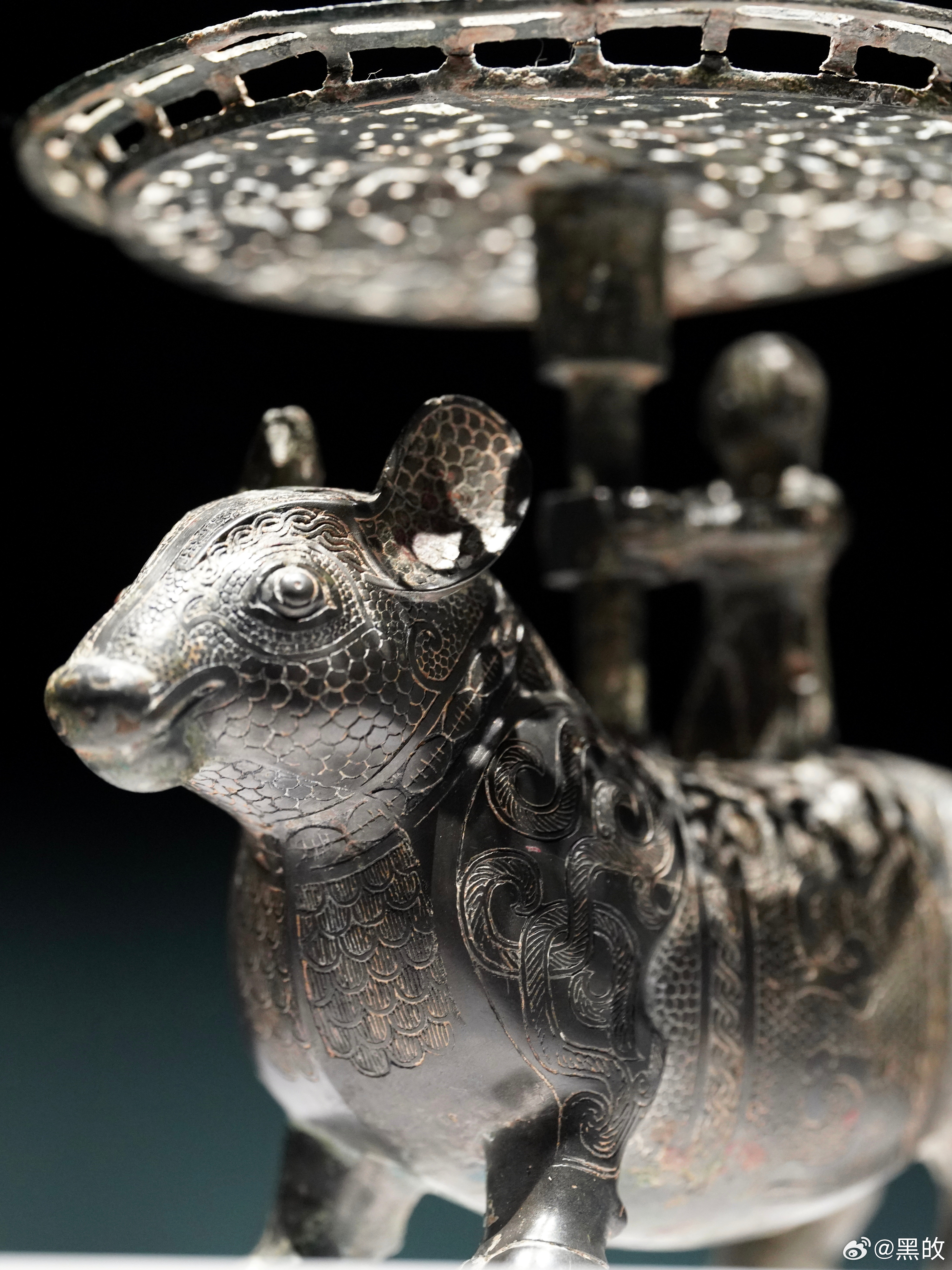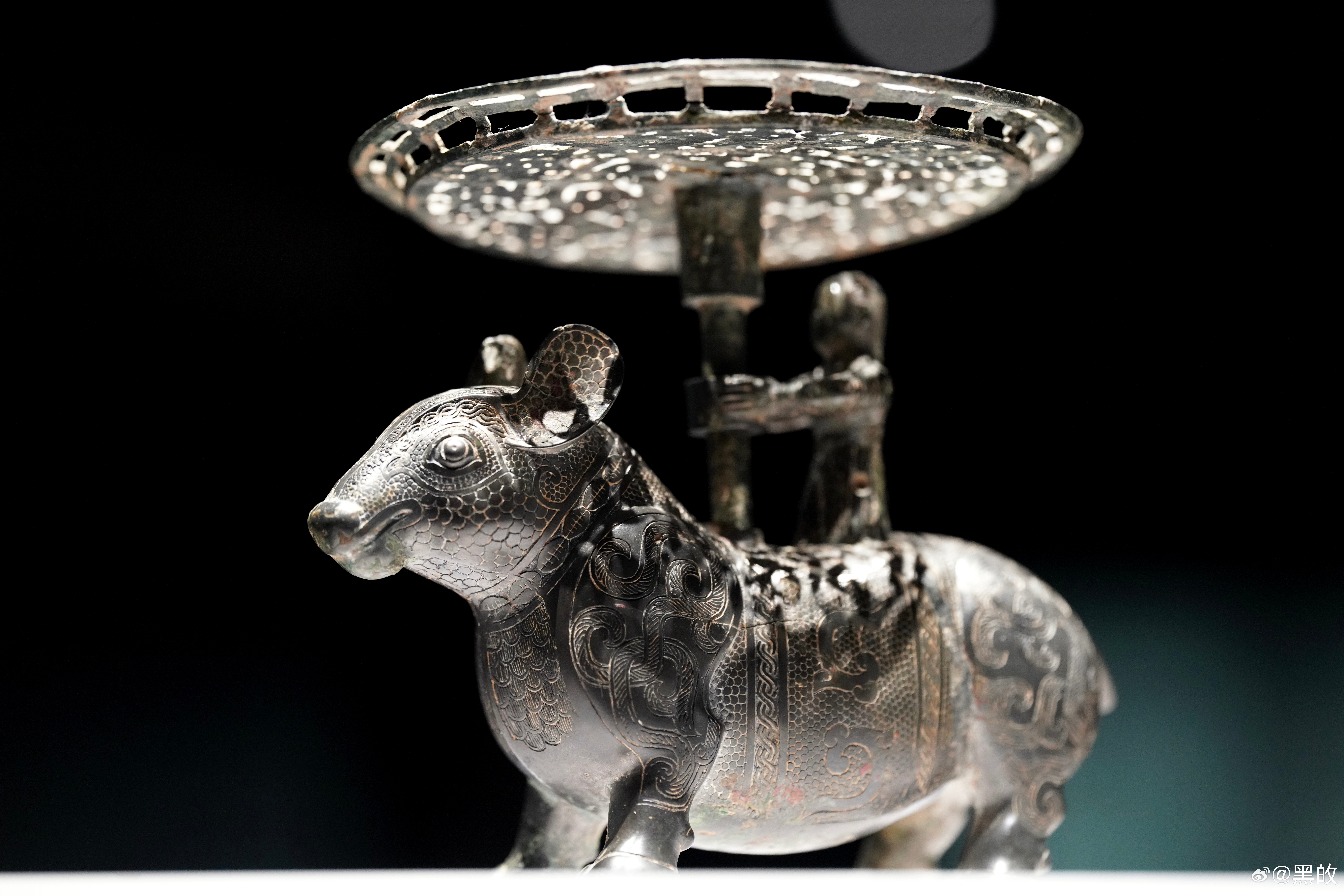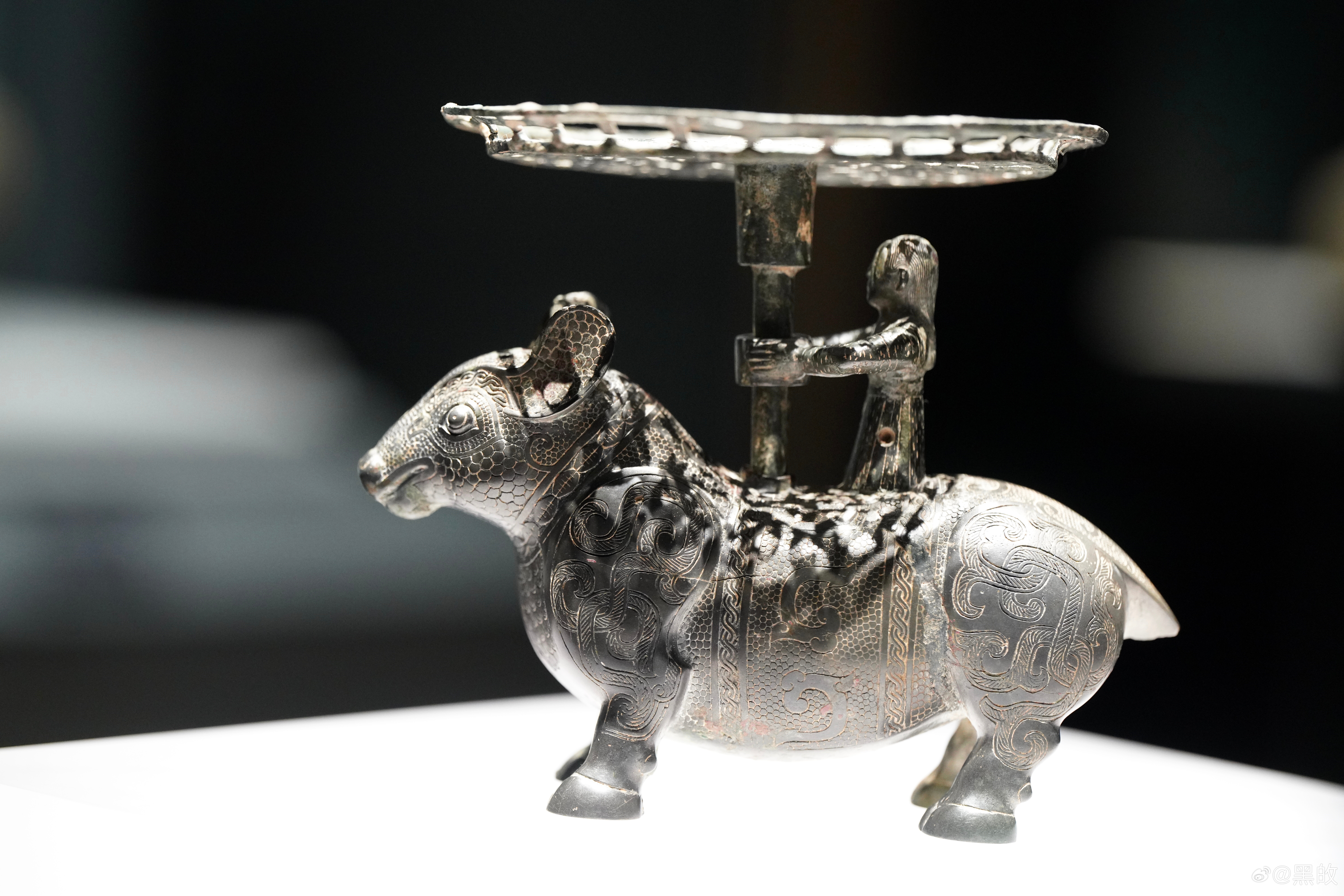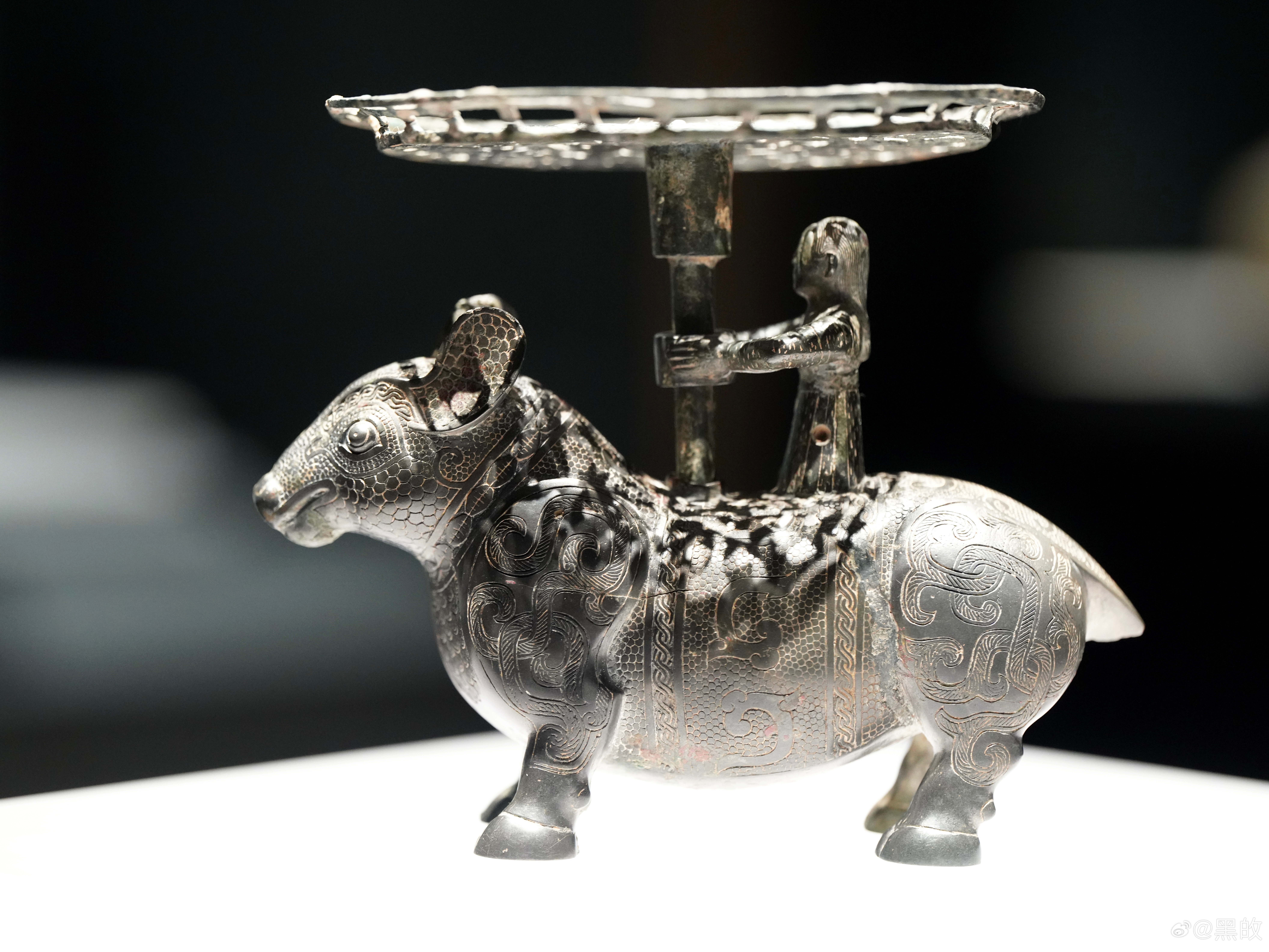 战国时期作品,长治市分水岭出土。铜牺为一昂首竖耳的神兽,牺背立一女子,束发披肩,双手前伸环握圆柱,柱顶置可转动的镂空蟠虺纹圆盘。该器造型奇巧,光润典雅,纹饰华丽,工艺精湛,体现了中国青铜器制作技术的卓越水平
