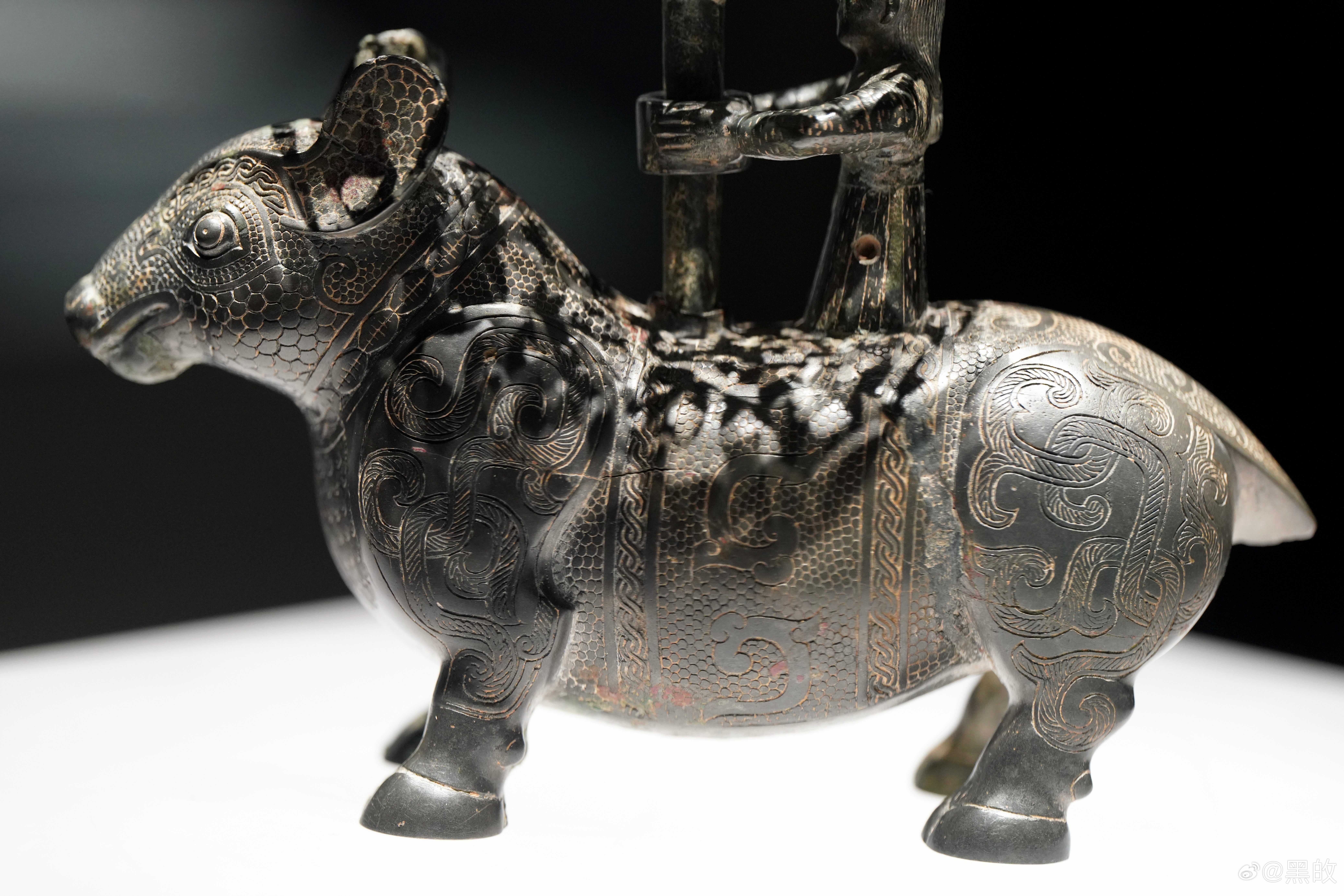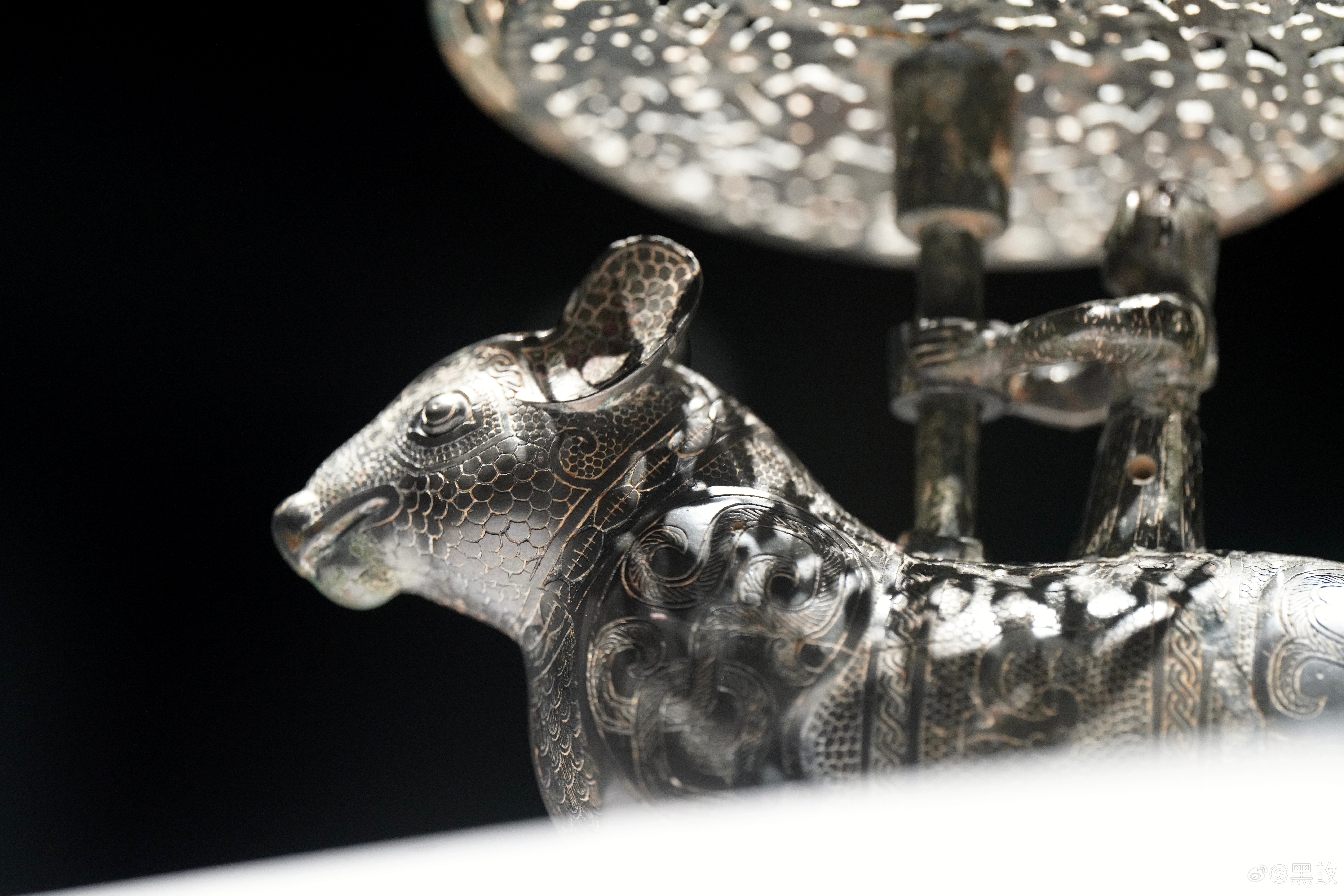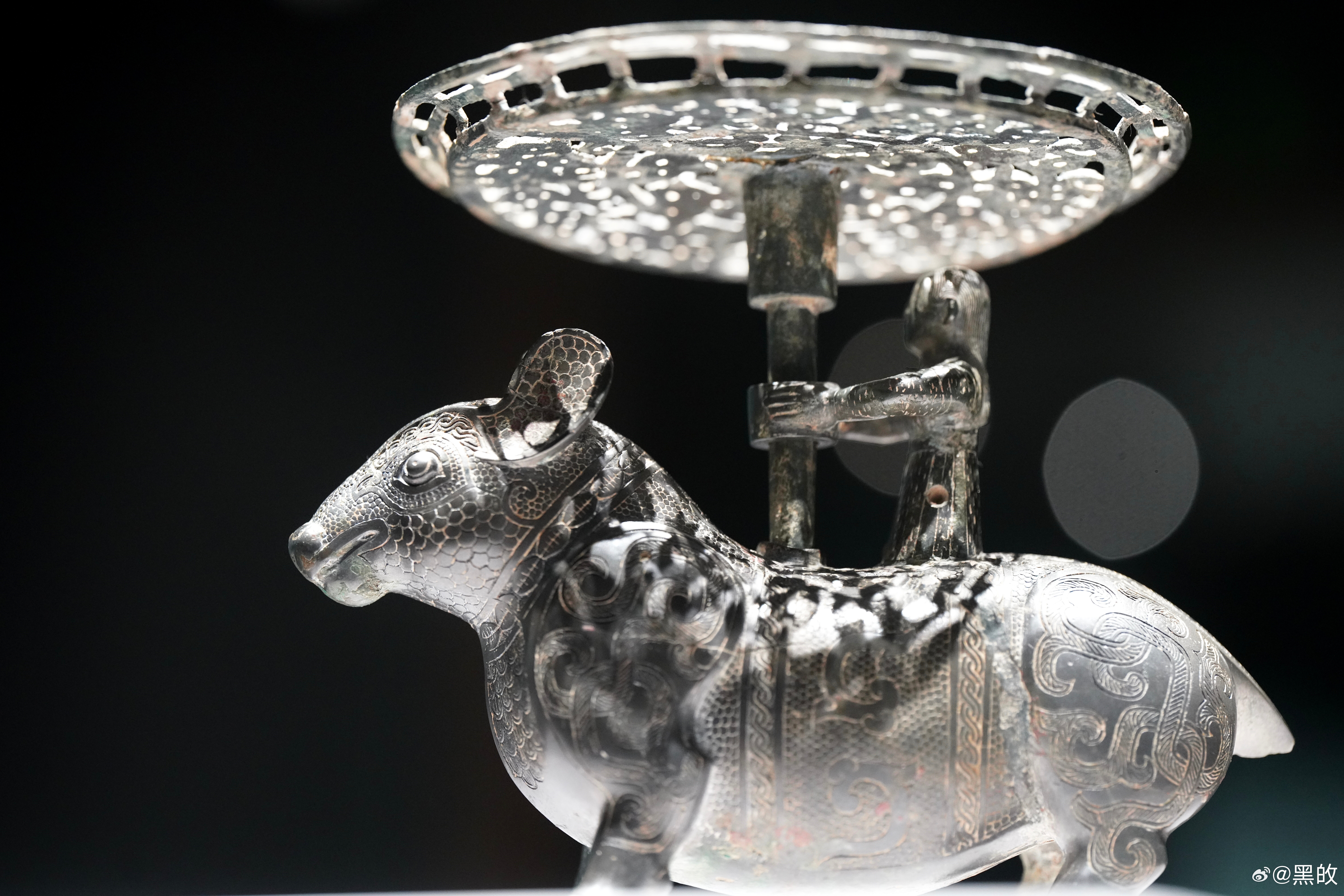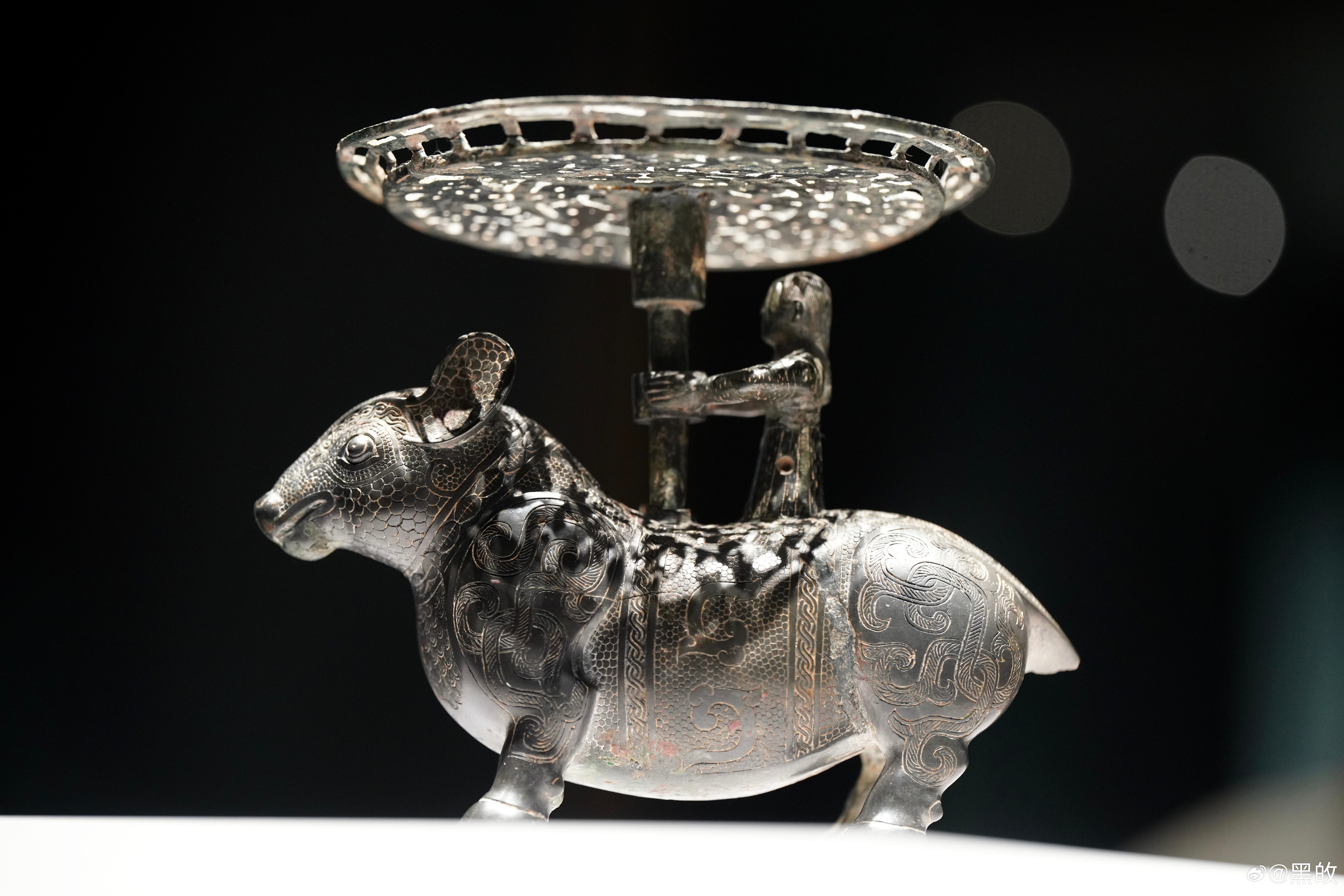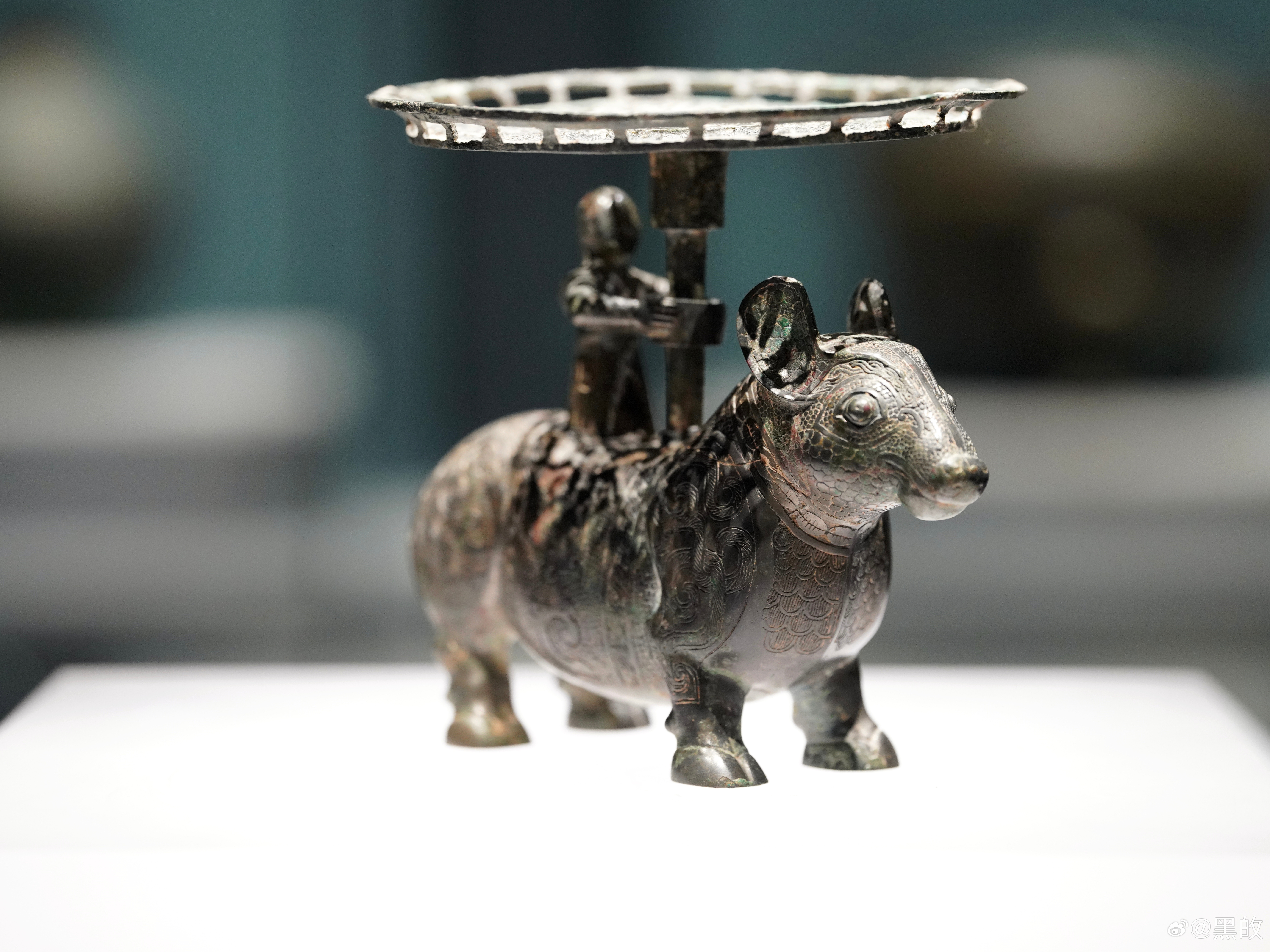 战国时期作品,长治市分水岭出土。铜牺为一昂首竖耳的神兽,牺背立一女子,束发披肩,双手前伸环握圆柱,柱顶置可转动的镂空蟠虺纹圆盘。该器造型奇巧,光润典雅,纹饰华丽,工艺精湛,体现了中国青铜器制作技术的卓越水平