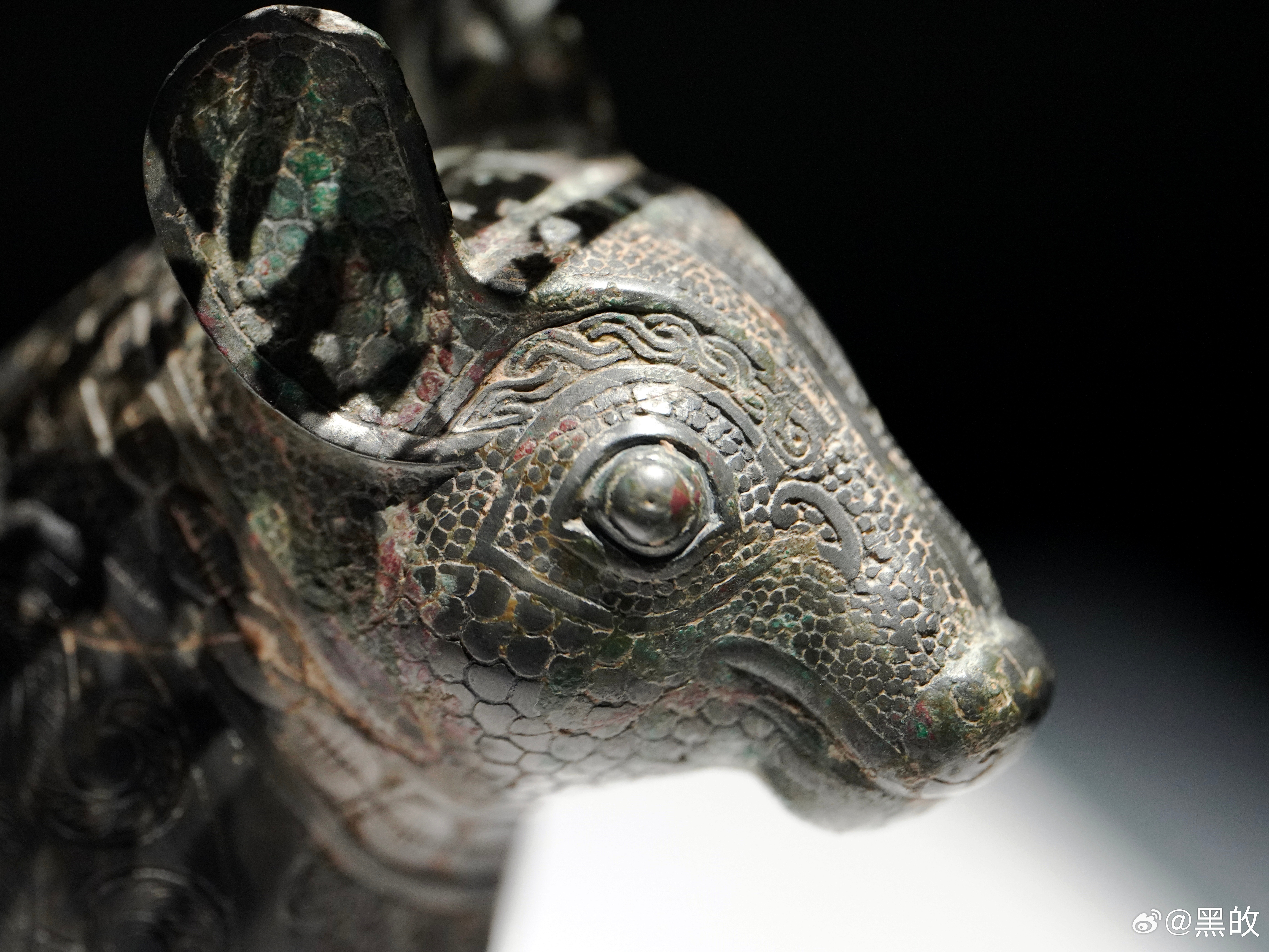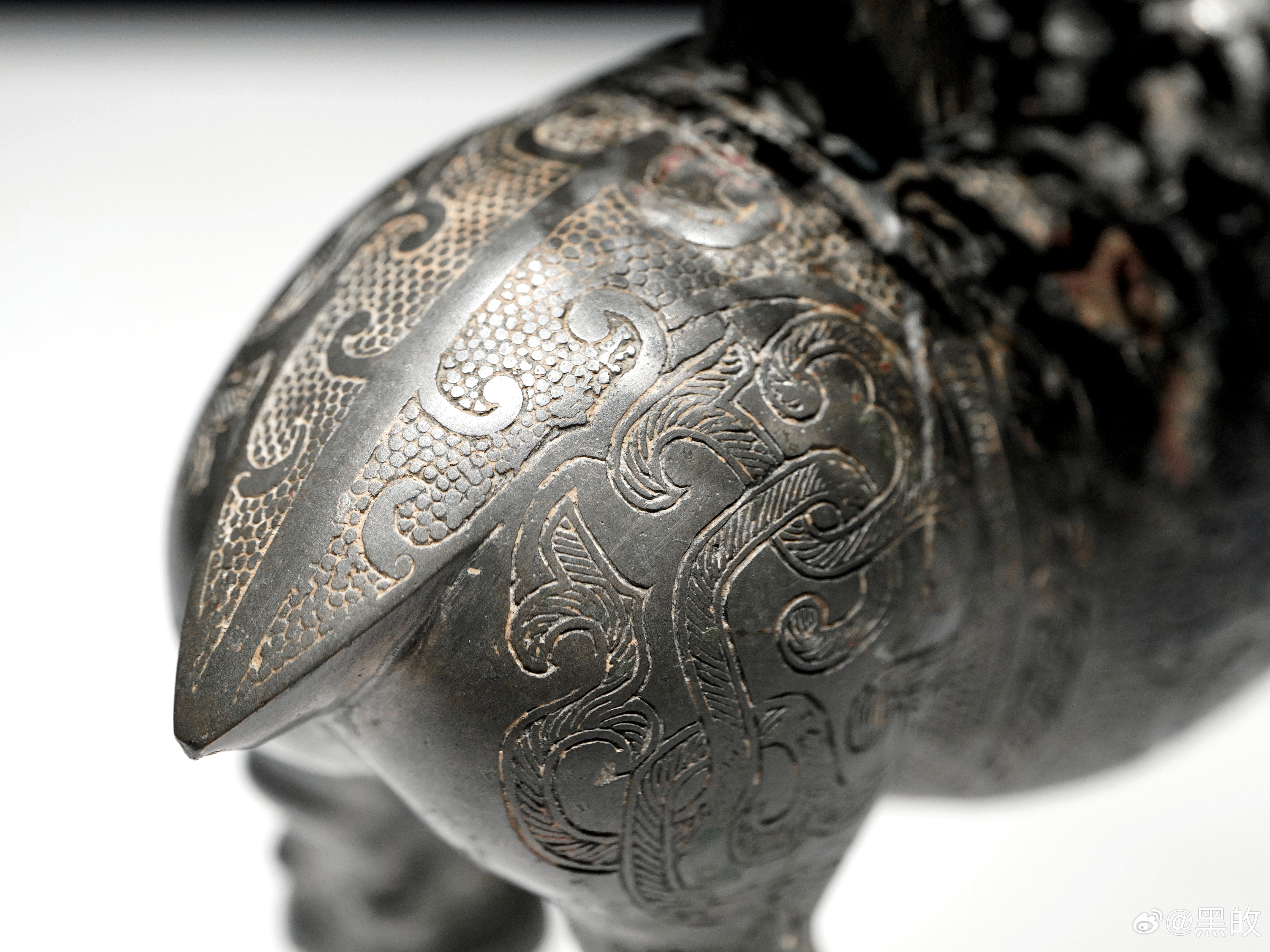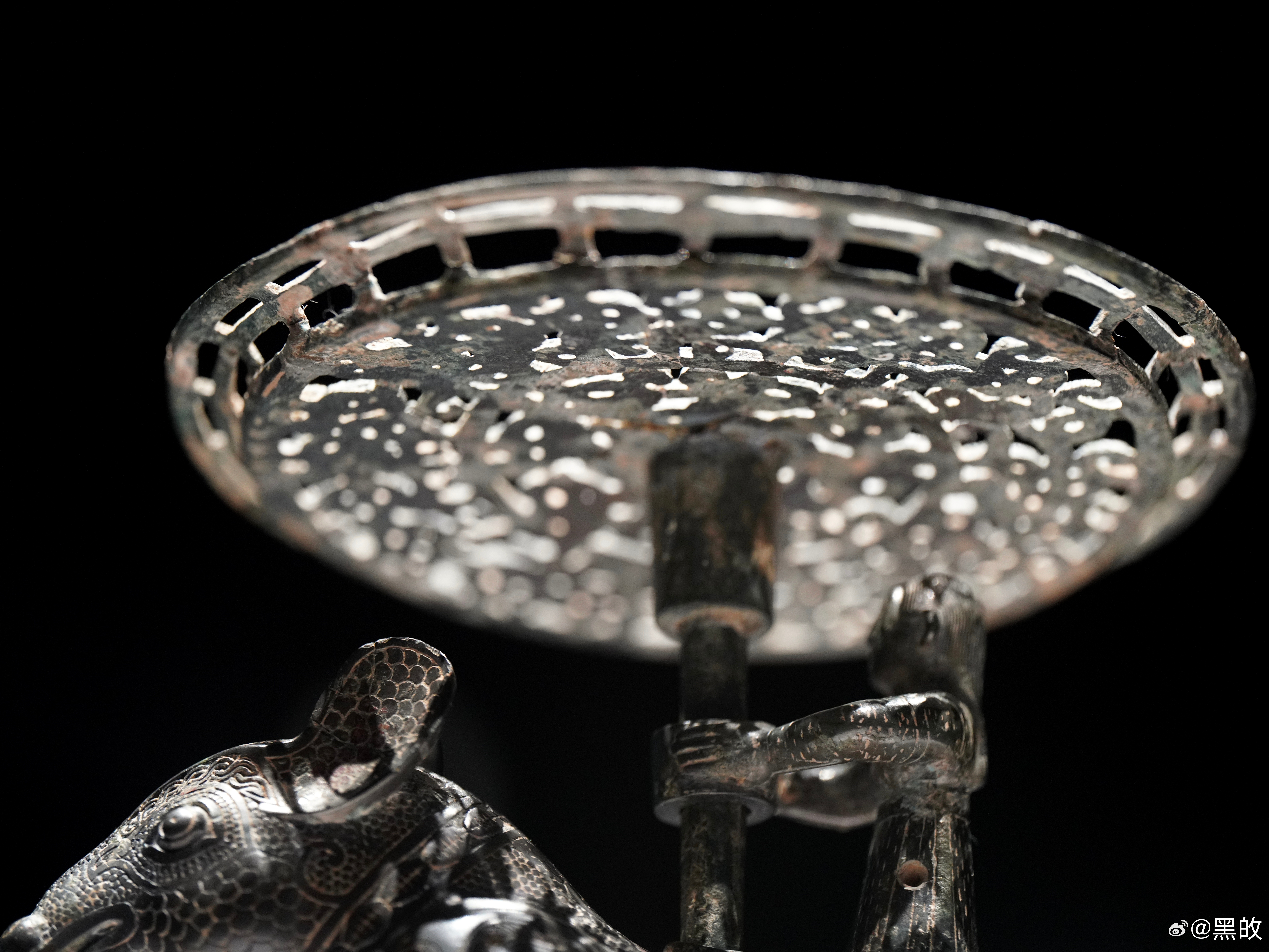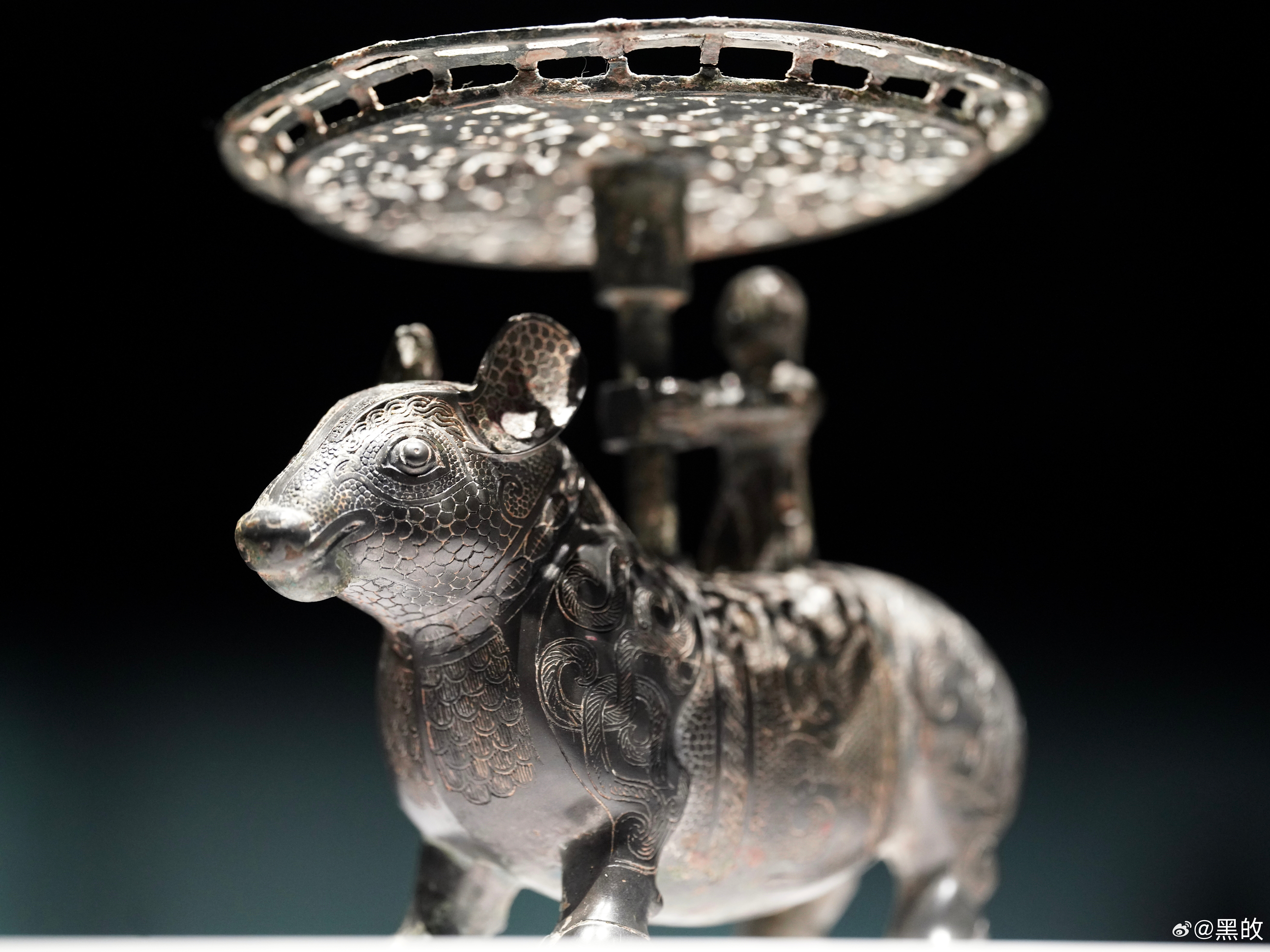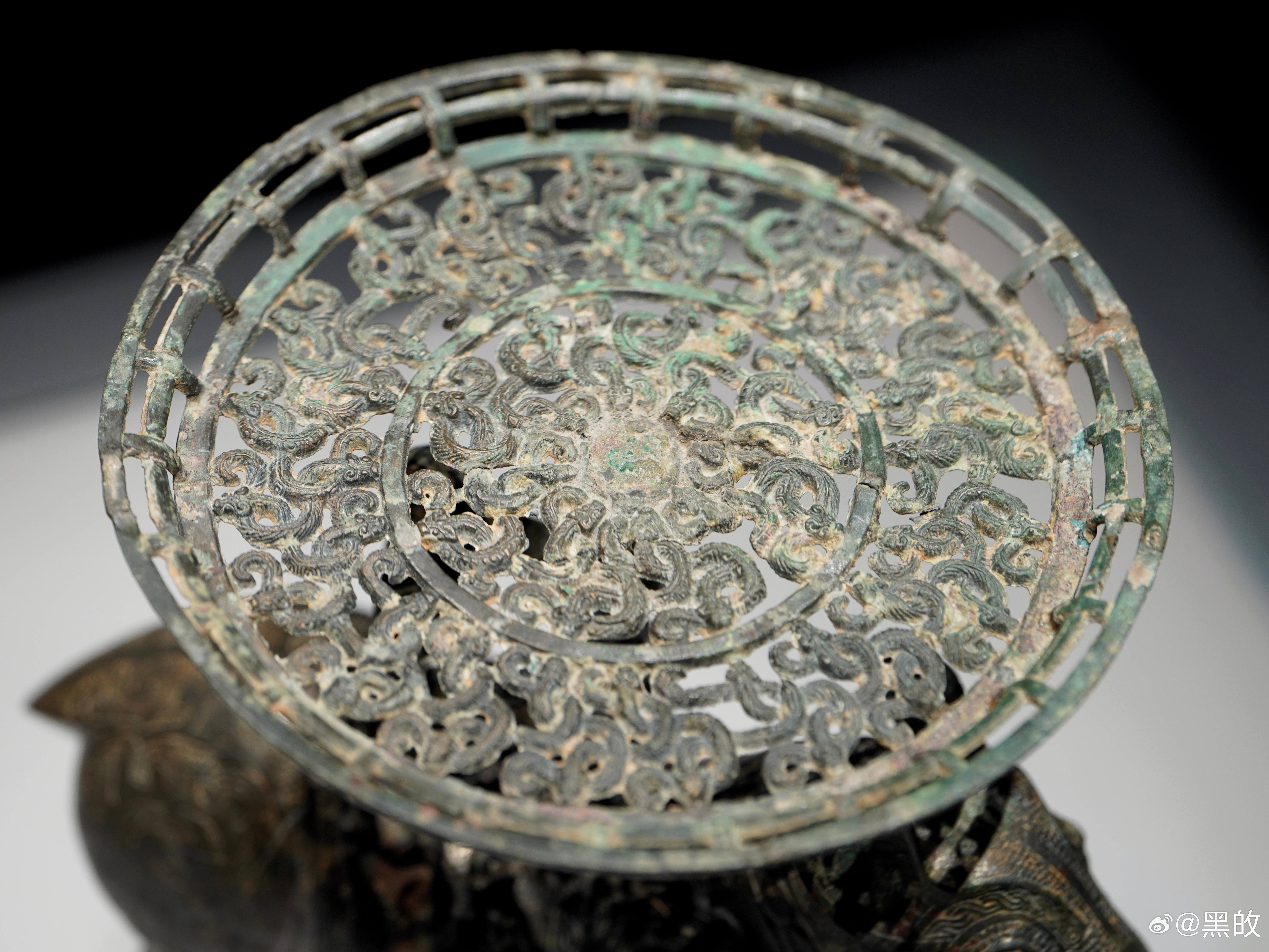 战国时期作品,长治市分水岭出土。铜牺为一昂首竖耳的神兽,牺背立一女子,束发披肩,双手前伸环握圆柱,柱顶置可转动的镂空蟠虺纹圆盘。该器造型奇巧,光润典雅,纹饰华丽,工艺精湛,体现了中国青铜器制作技术的卓越水平