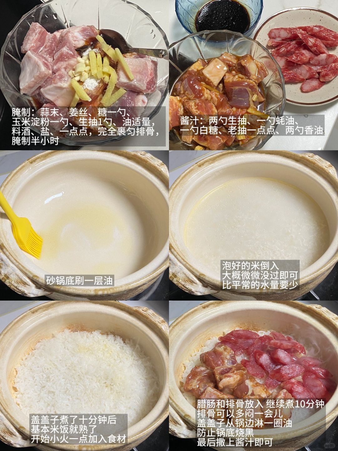 4)之分钟之后基本上就可以加菜了,把排骨和腊肠放好,小火,盖上盖子,从锅的边缘淋一圈油,继续煮10分钟,淋上酱汁,开吃