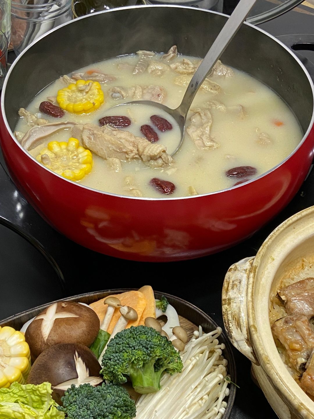 没想到煲仔饭做的这么成功!太爱吃了!以后继续做一点别的口味的!今天的食谱比较广式,为猪肚鸡汤搭配了一些小菜,吃的超饱