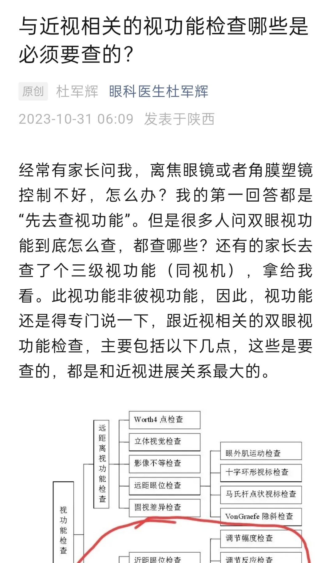 经常有家长问我,离焦眼镜或者角膜塑镜控制不好,怎么办?我的第一回答都是“先去查视功能”。但是很多人问双眼视功能到底怎么查,都查哪些?还有的家长去查了个三级视功能(同视机),拿给我看。此视功能非彼视功能,因此,视功能还是得专门说一下,跟近视相关的双眼视功能检查,主要包括以下几点,这些是要查的,都是和近视进展关系最大的。