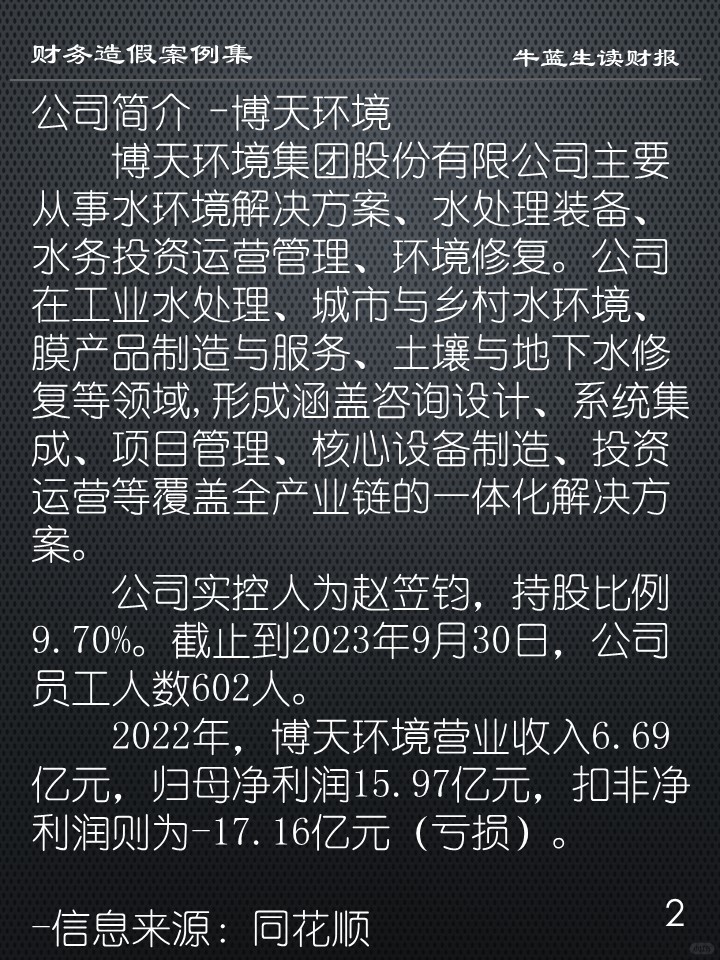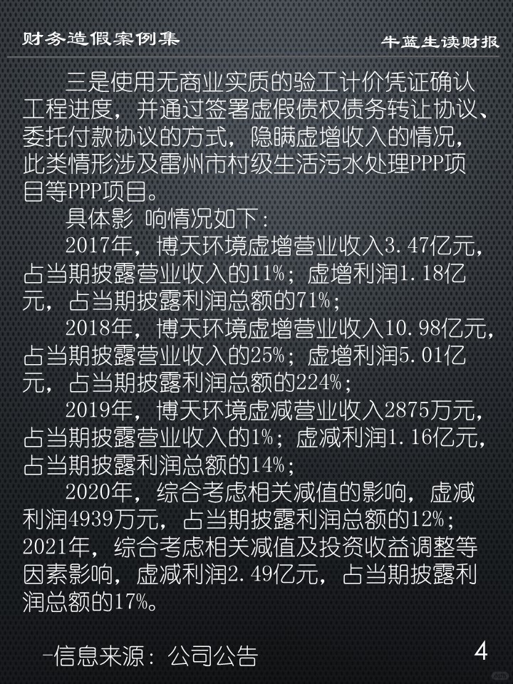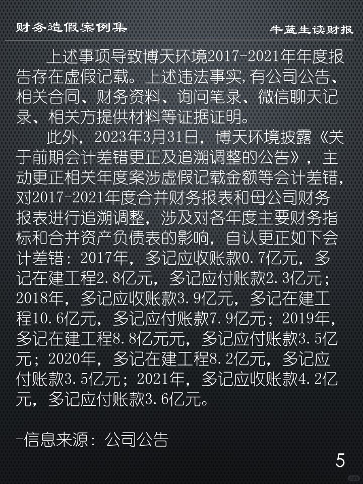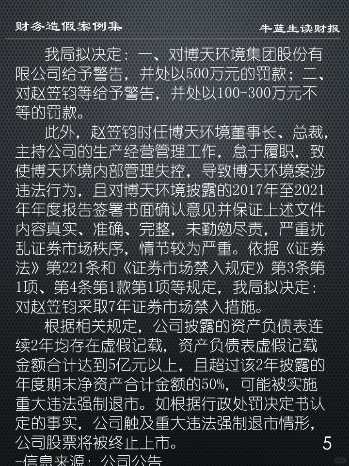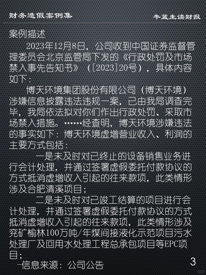 ✈公司:博天环境 造假金额:2017-2018年虚增营业收入14亿元,虚增利润6亿元,2020-2021年资产负债表虚假记载金额合计19.5亿元等 主要手段:未及时对已终止的设备销售业务进行会计处理;签署虚假债权债务转让协议、委托付款协议的方式,隐瞒虚增收入等 证监会行政处罚事先告知书:[2023]20号,北京证监局,2023-12-8 公司公告:临2023-081 后果:公司及相关人员被处罚。公司可能被强制退市。