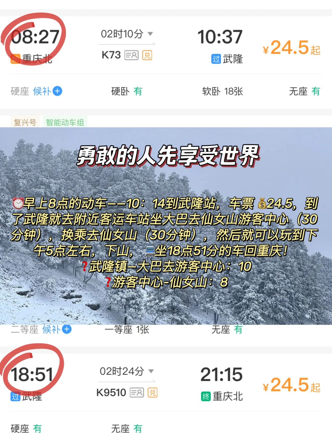 ⏰早上8点的动车——10:14到武隆站,车票💰24.5,到了武隆就去附近客运车站坐大巴去仙女山游客中心(30分钟),换乘去仙女山(30分钟),然后就可以玩到下午5点左右,下山,🚆坐18点51分的车回重庆!