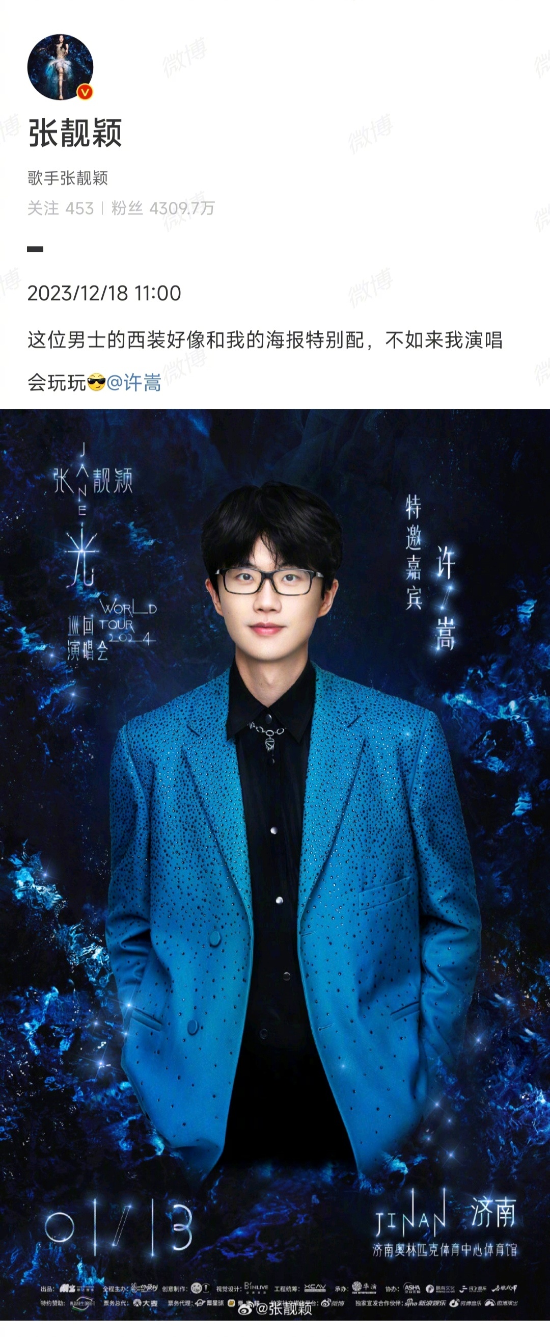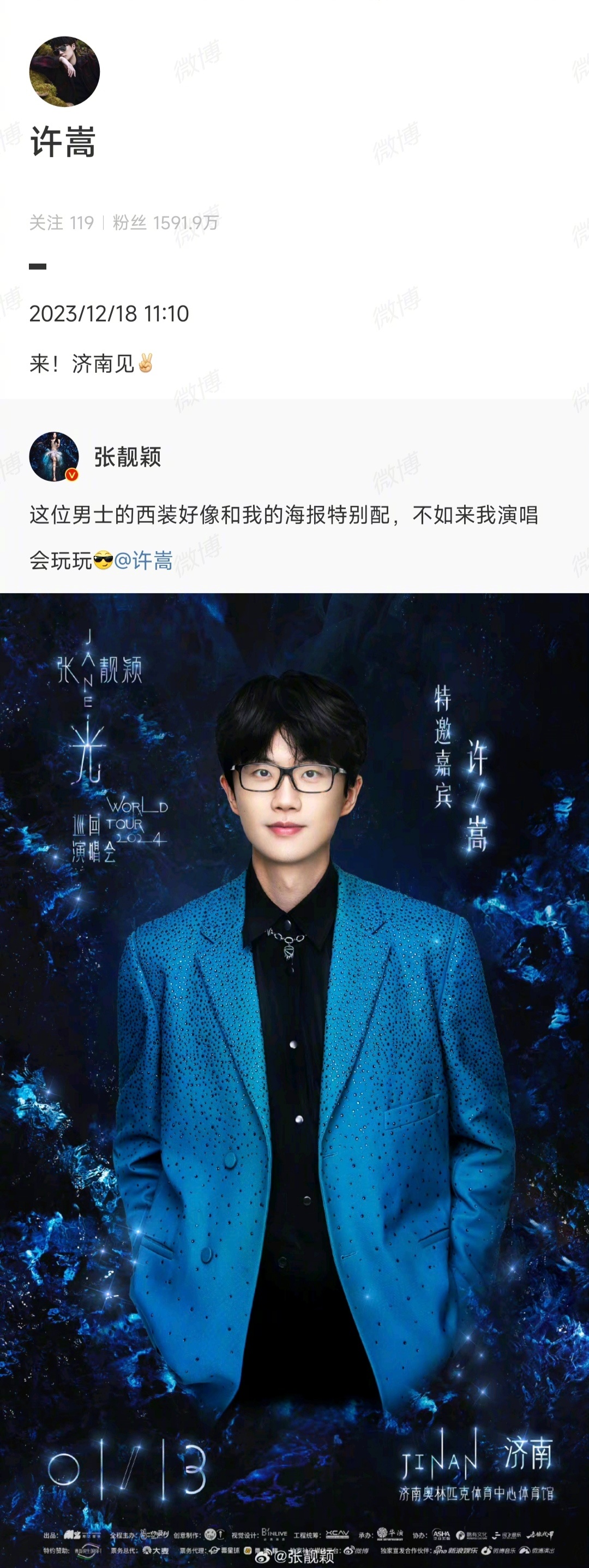 许嵩,别来蹭演唱会了,你的呢哈哈哈哈哈哈~张靓颖开演唱会,许嵩作为特邀嘉宾,歌迷们纷纷喊话许嵩:别来蹭别人的演唱会,你自己的演唱会呢[喵喵]