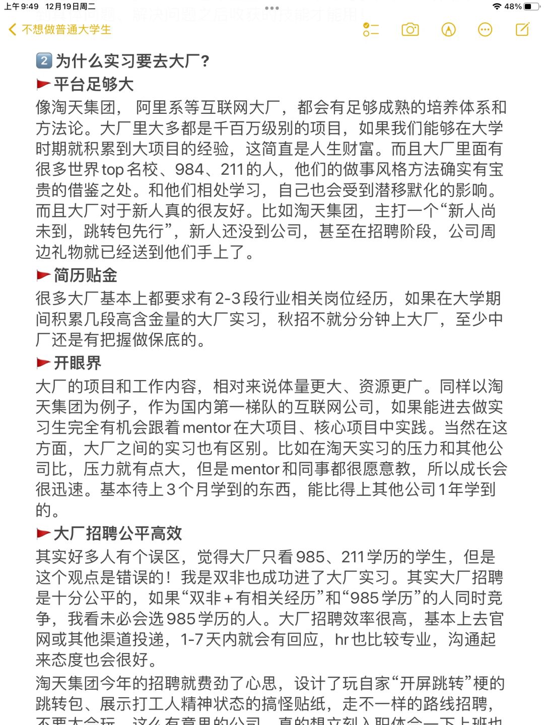 像淘天集团, 阿里系等互联网大厂,都会有足够成熟的培养体系和方法论。大厂里大多都是千百万级别的项目,如果我们能够在大学时期就积累到大项目的经验,这简直是人生财富。而且大厂里面有很多世界top名校、984、211的人,他们的做事风格方法确实有宝贵的借鉴之处。和他们相处学习,自己也会受到潜移默化的影响。而且大厂对于新人真的很友好。比如淘天集团,主打一个“新人尚未到,跳转包先行”,新人还没到公司,甚至在招聘阶段,公司周边礼物就已经送到他们手上了。