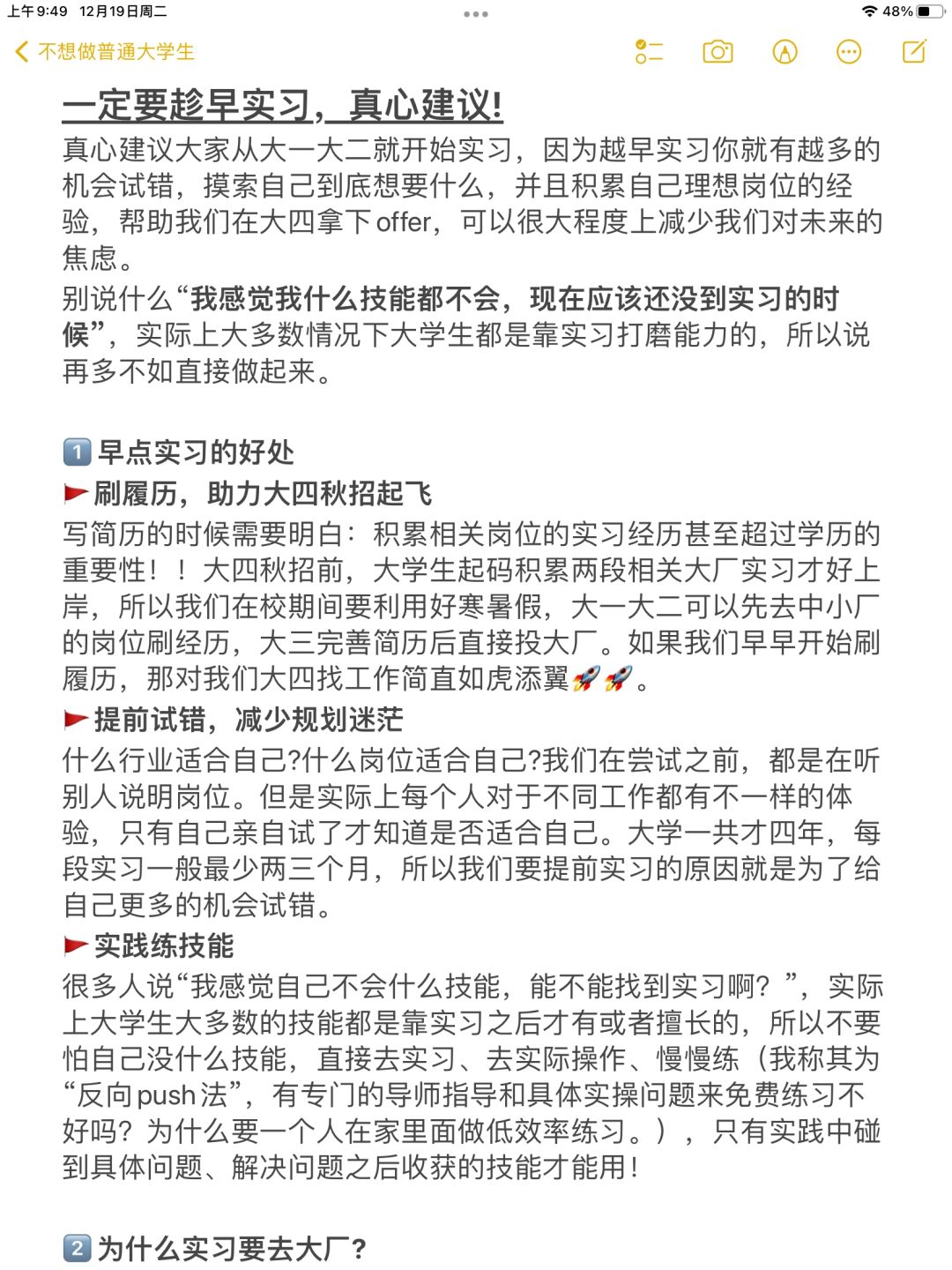 真心建议大家从大一大二就开始实习,因为越早实习你就有越多的机会试错,摸索自己到底想要什么,并且积累自己理想岗位的经验,帮助我们在大四拿下offer,可以很大程度上减少我们对未来的焦虑。