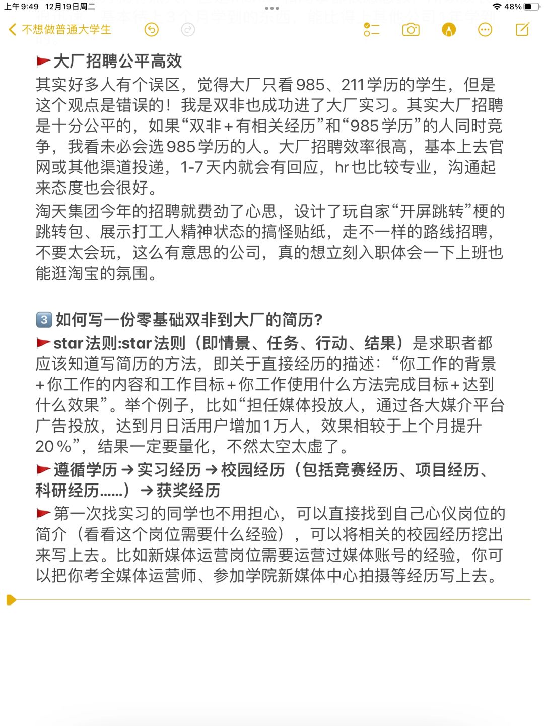 写简历的时候需要明白:积累相关岗位的实习经历甚至超过学历的重要性!!大四秋招前,大学生起码积累两段相关大厂实习才好上岸,所以我们在校期间要利用好寒暑假,大一大二可以先去中小厂的岗位刷经历,大三完善简历后直接投大厂。如果我们早早开始刷履历,那对我们大四找工作简直如虎添翼🚀🚀。