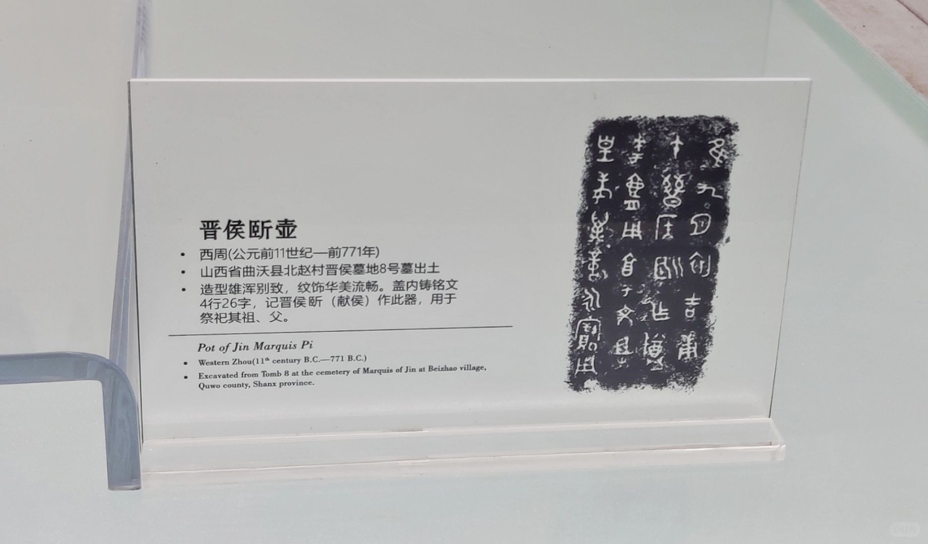 出土于晋侯墓地的晋侯臣斤(“臣斤”,音pǐ)壶高达68.8厘米,造型恢宏大气,纹饰流畅华美。镂空的波曲形华冠犹如盛开的莲花,山形的镂空捉手与“莲花”融为一体。衔环的双耳设计为象首造型,却在大象上扬的长鼻上神奇地衍化出曲体的龙形。壶体上龙纹、兽目交连纹、波曲纹、鳞纹疏密相间,将西周青铜艺术之美和青铜匠师的巧思表现得淋漓尽致。山西省曲沃县北赵村晋侯墓地8号墓出土,造型雄浑别致,纹饰华美流畅。盖内铸铭文4行26字,记晋侯断(献侯)作此器,用于祭祀其祖、父。