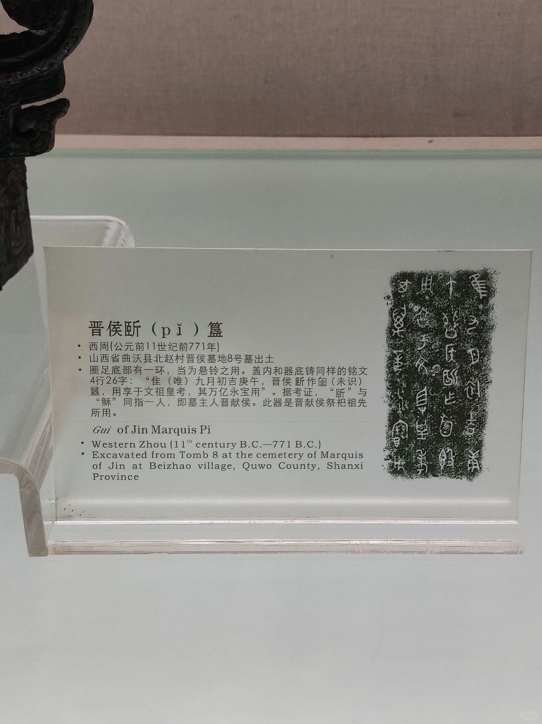 晋侯“pi”,是墓地中唯一能与《史记·晋世家》记载的姓名相吻合的晋献侯。1992年曲沃县北赵村晋侯墓地M8出土。