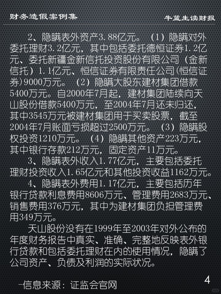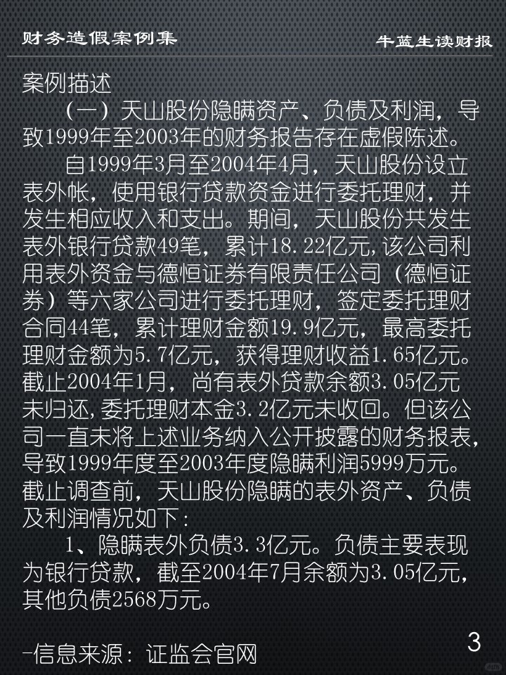 ✈公司:天山股份 造假金额:1999-2003年隐瞒利润5999万元,等 主要手段:设立表外帐,使用银行贷款资金进行委托理财,并发生相应收入和支出 证监会处罚文号:[2006]11号 后果:公司及相关人员被处罚